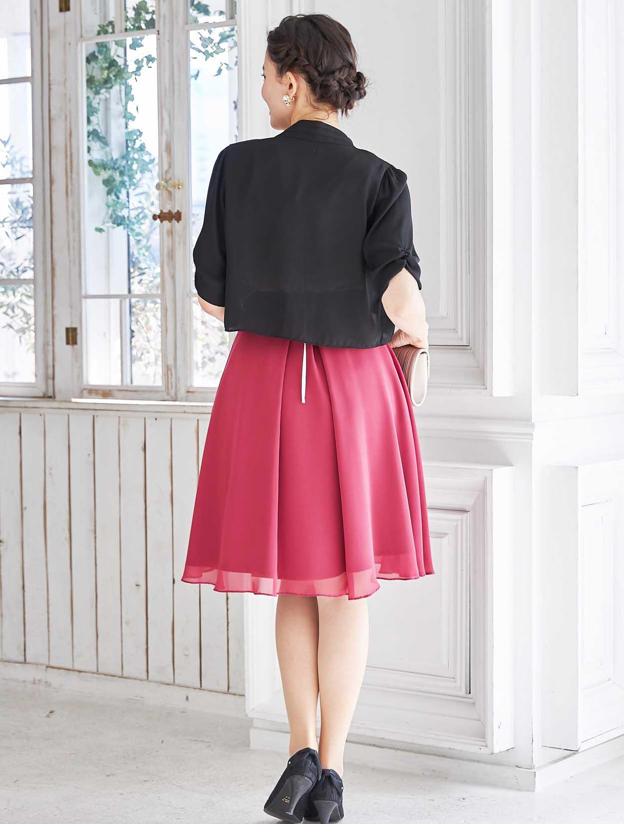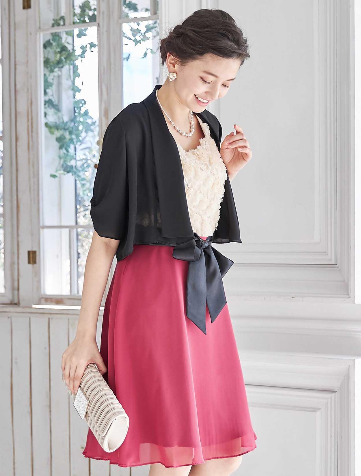 落ち感のある縦のラインの羽織が、フラワーモチーフのドレスに少し大人っぽい表情をプラス。