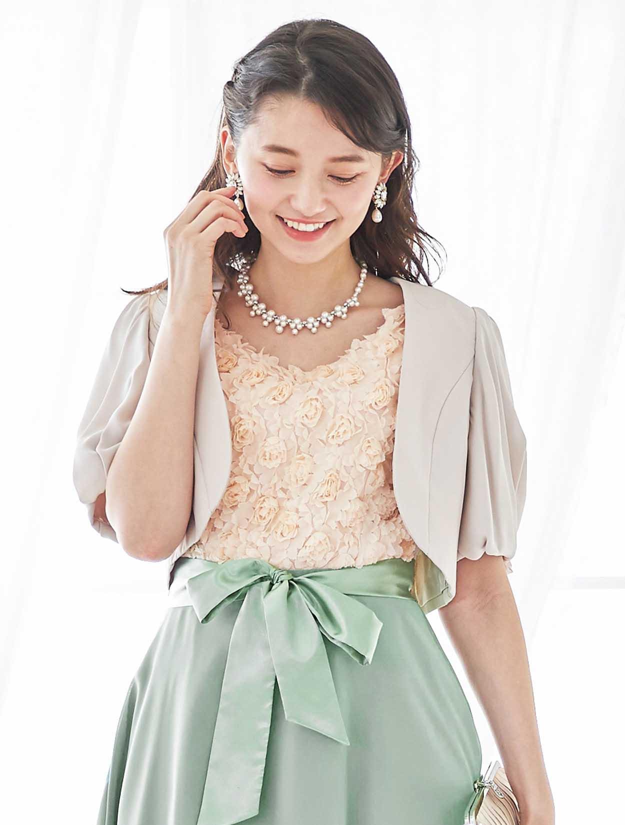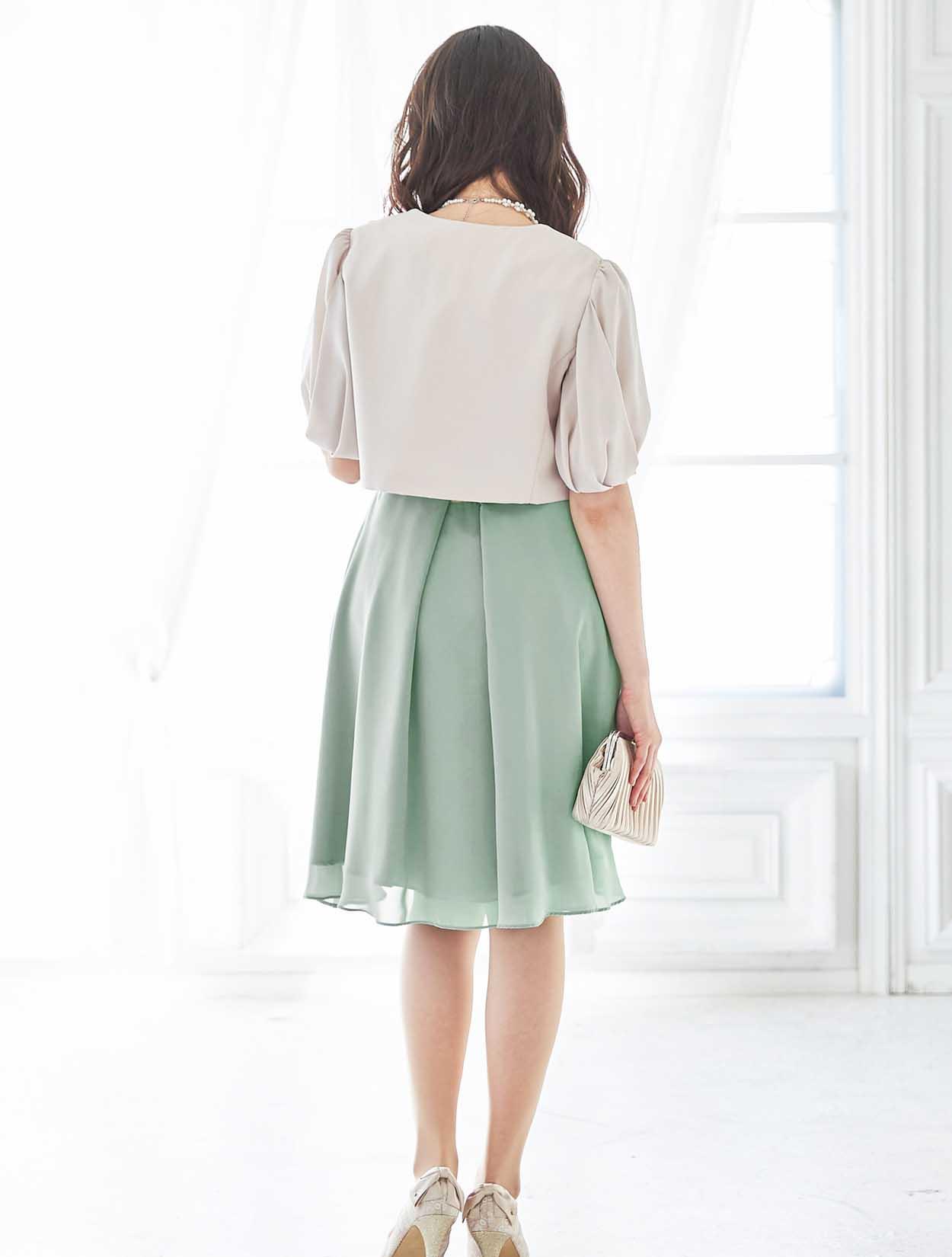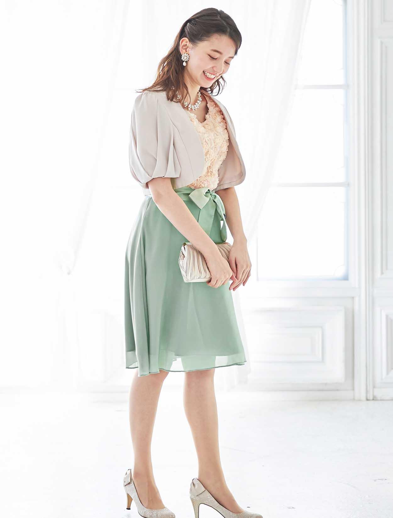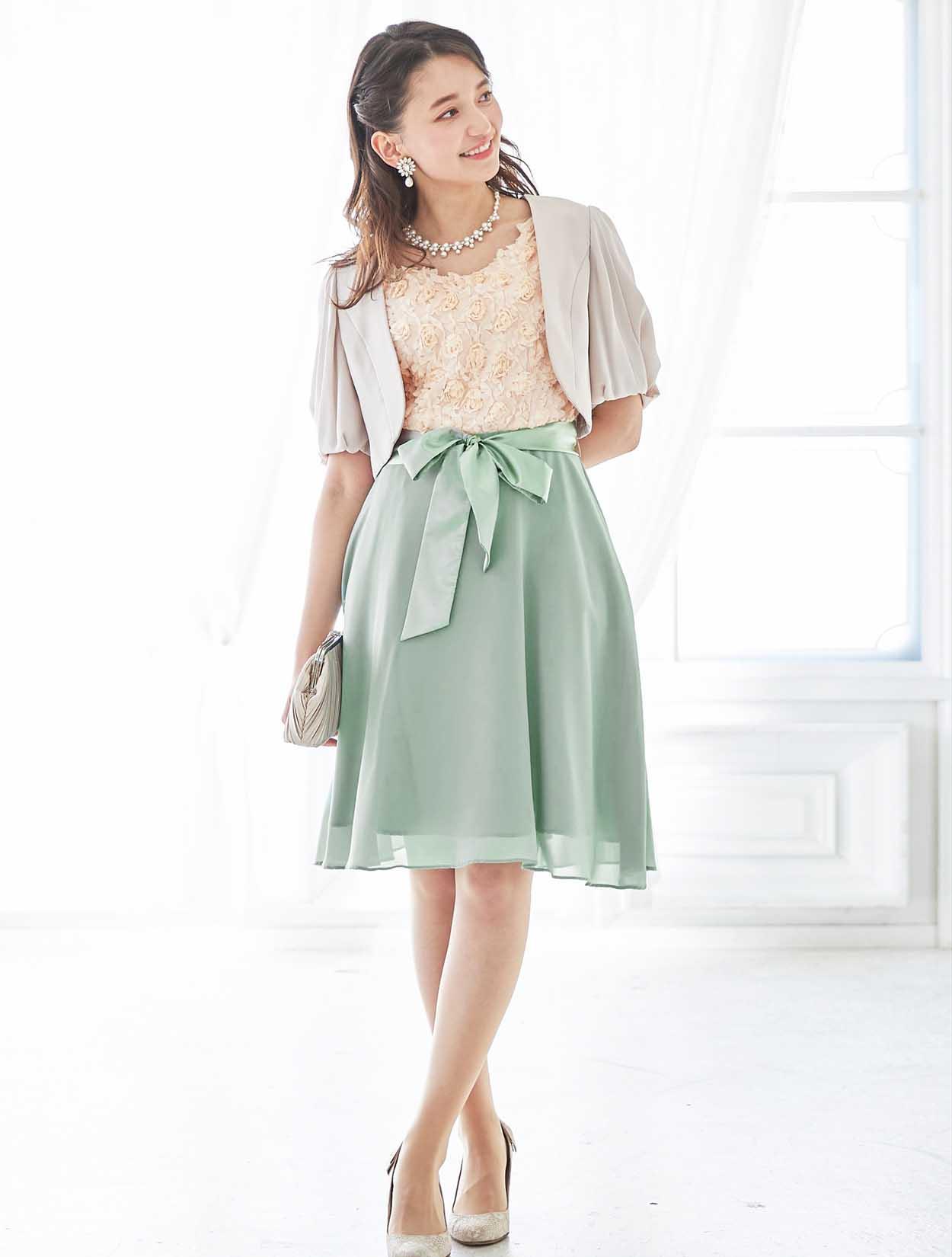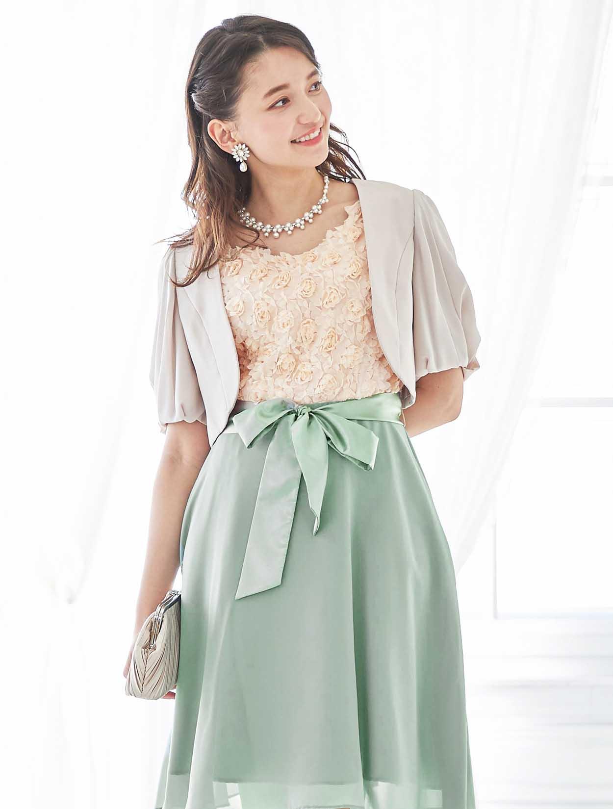 バラと爽やかグリーンが春らしいバイカラードレス