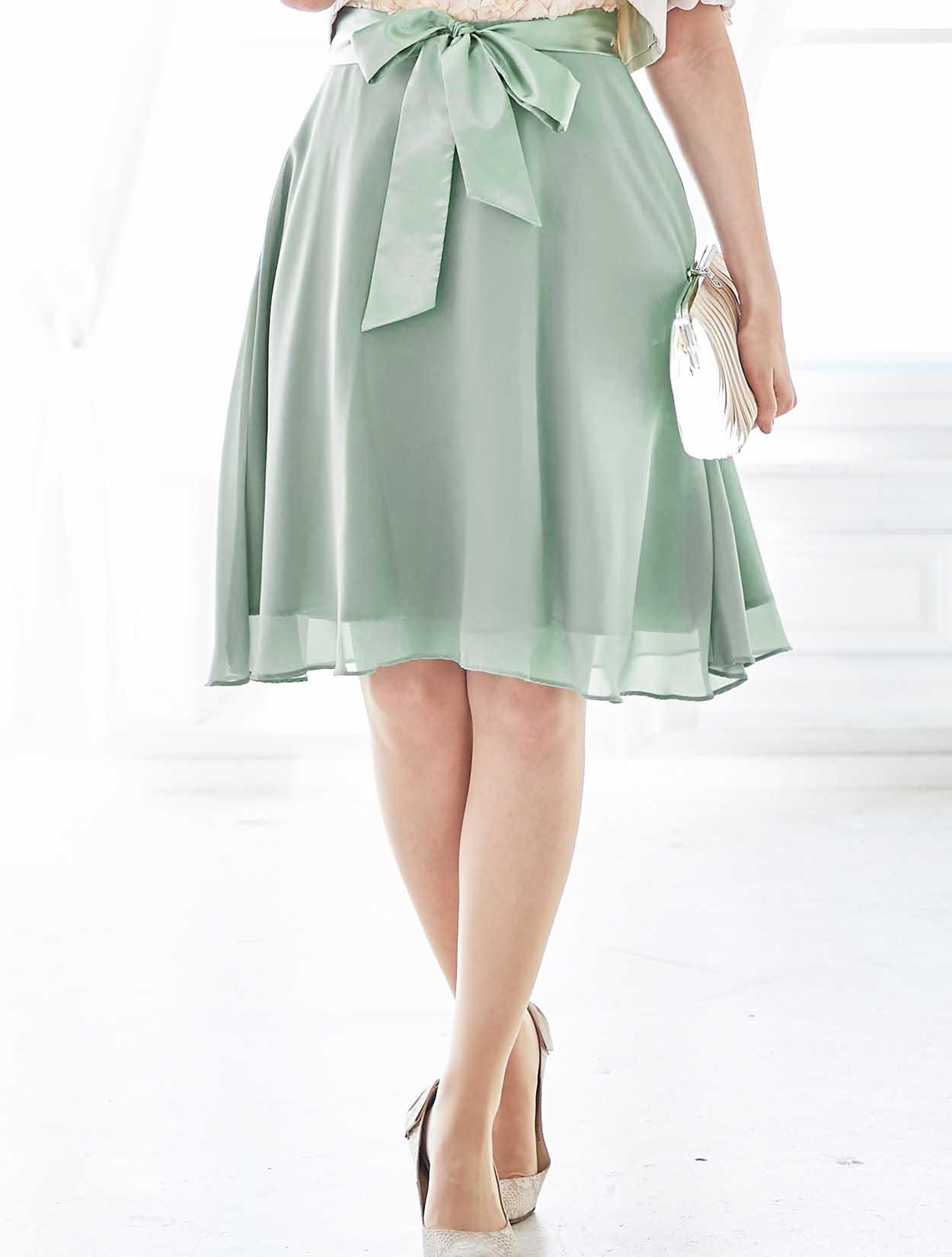 ライトな着心地で程よい透け感のあるシフォン生地を使用。広がり過ぎないスカートは動くたびに軽やかに揺れてフェミニンな表情に。