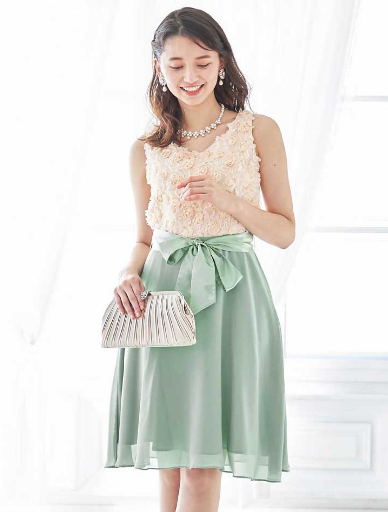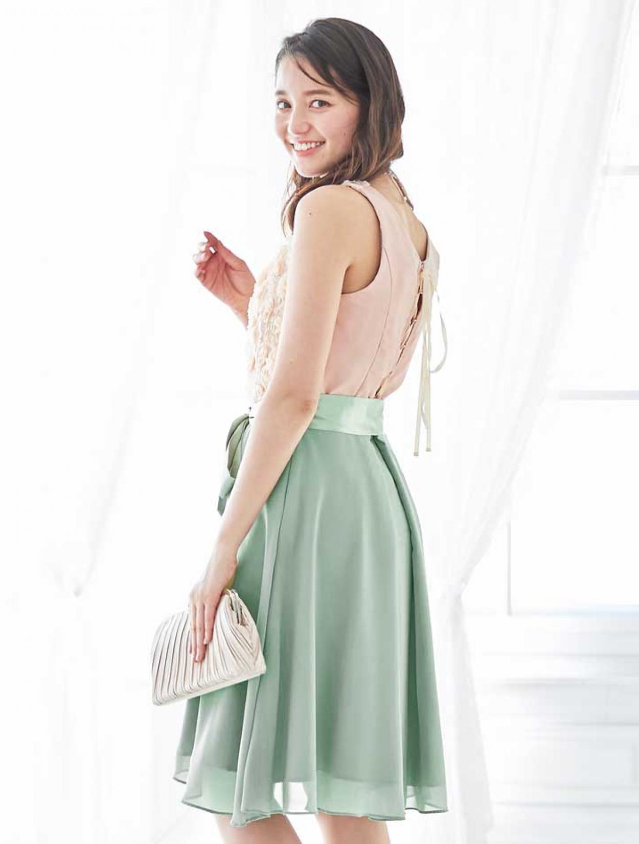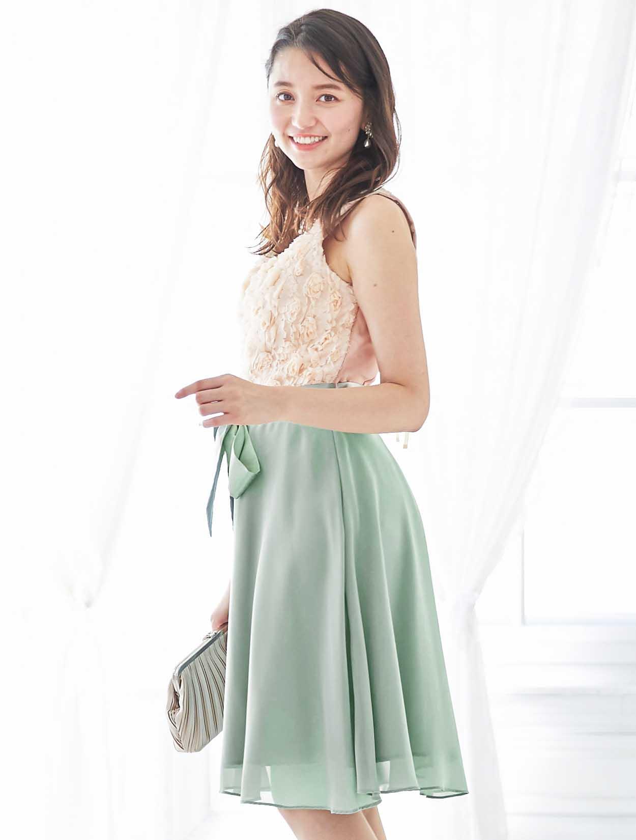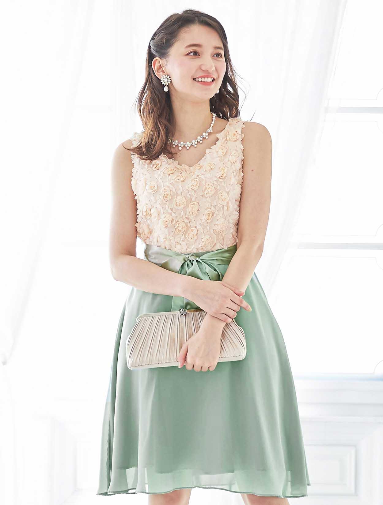 バラと爽やかグリーンが春らしいバイカラードレス