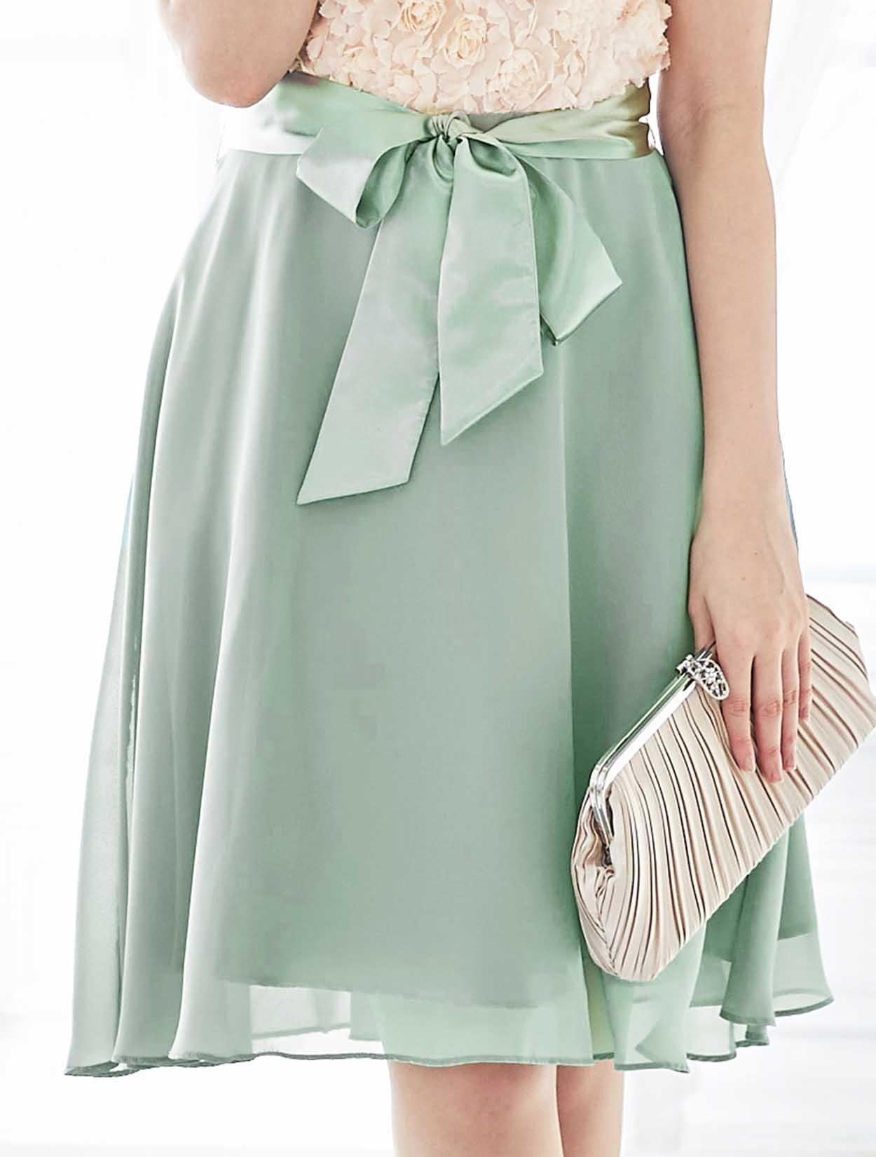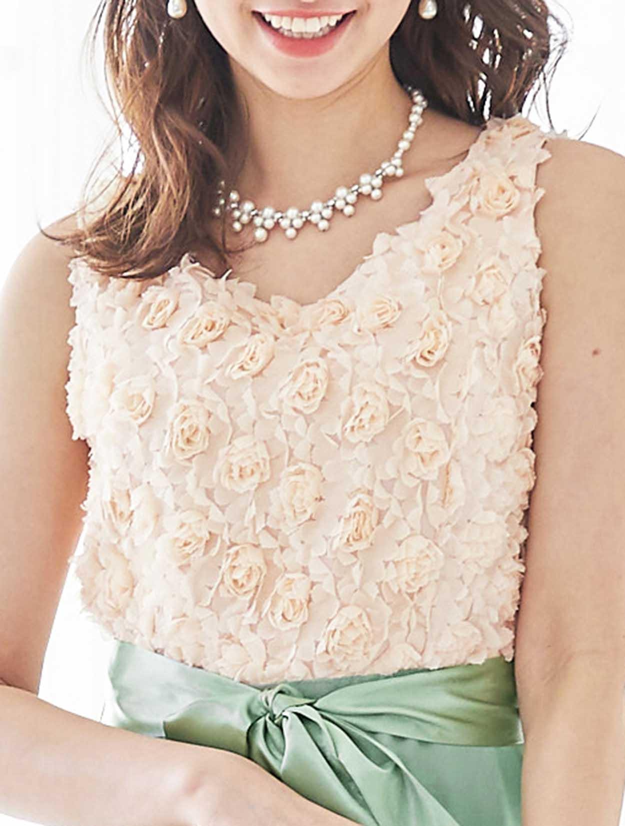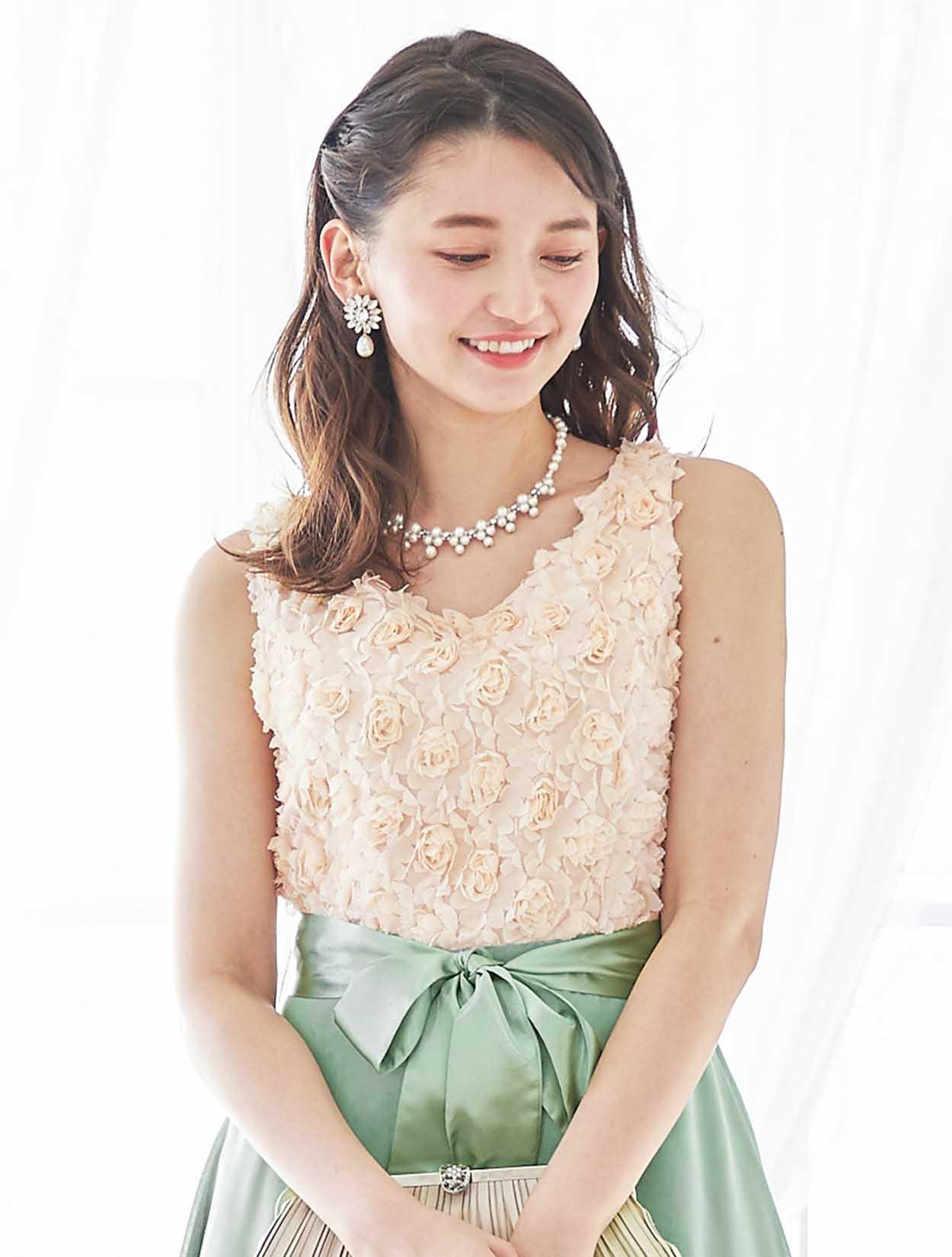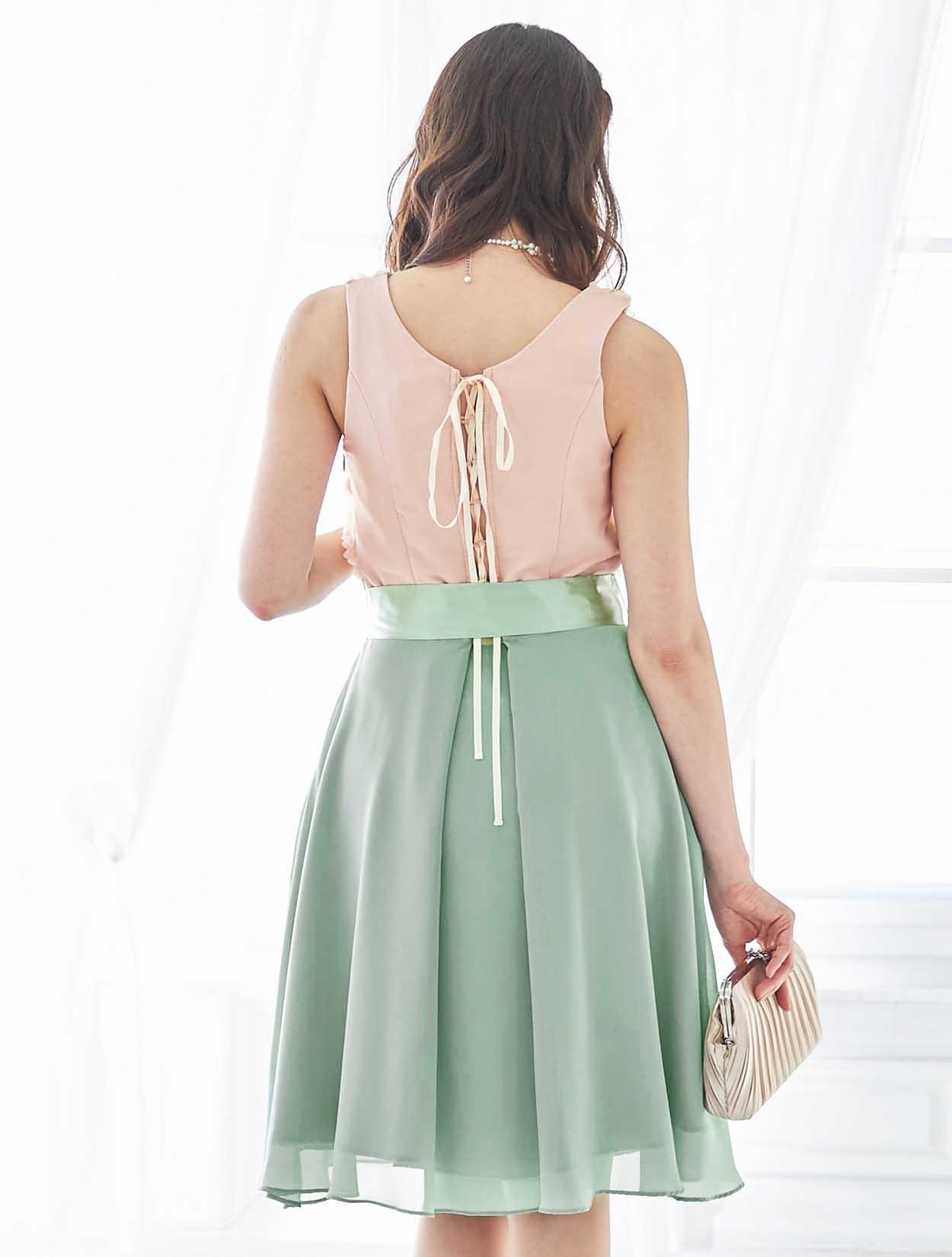 バラと爽やかグリーンが春らしいバイカラードレス