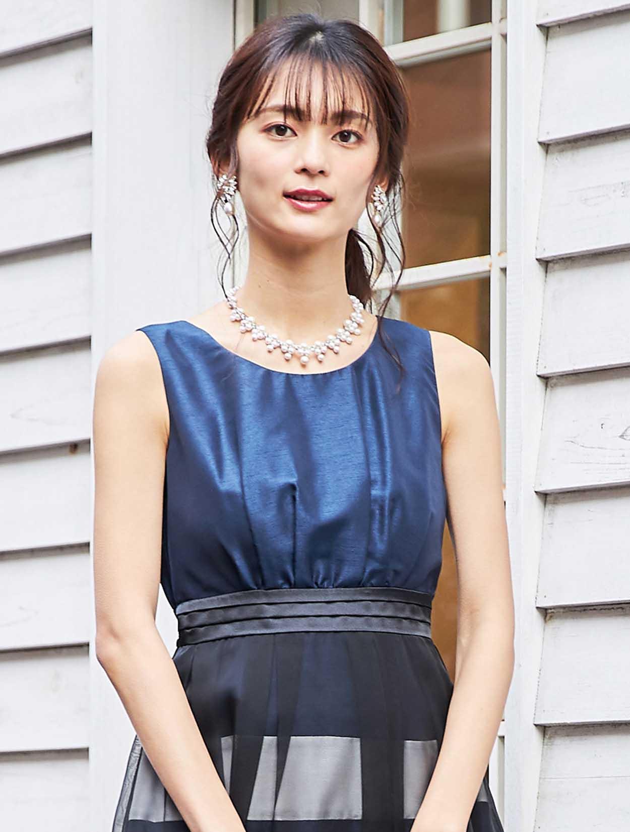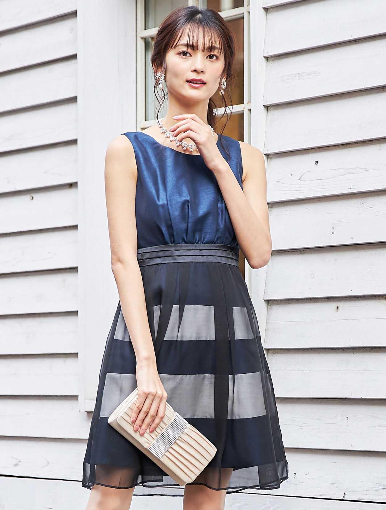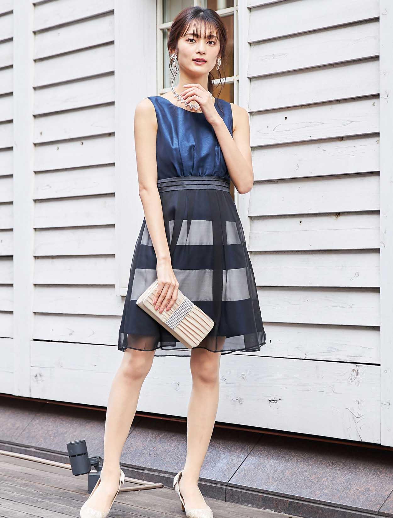 上品な光沢が目を惹く鮮やかなネイビーを、マットなエアリーブラックで奥行きのある色合いに。人気のネイビーは初めてのドレスでも安心です。