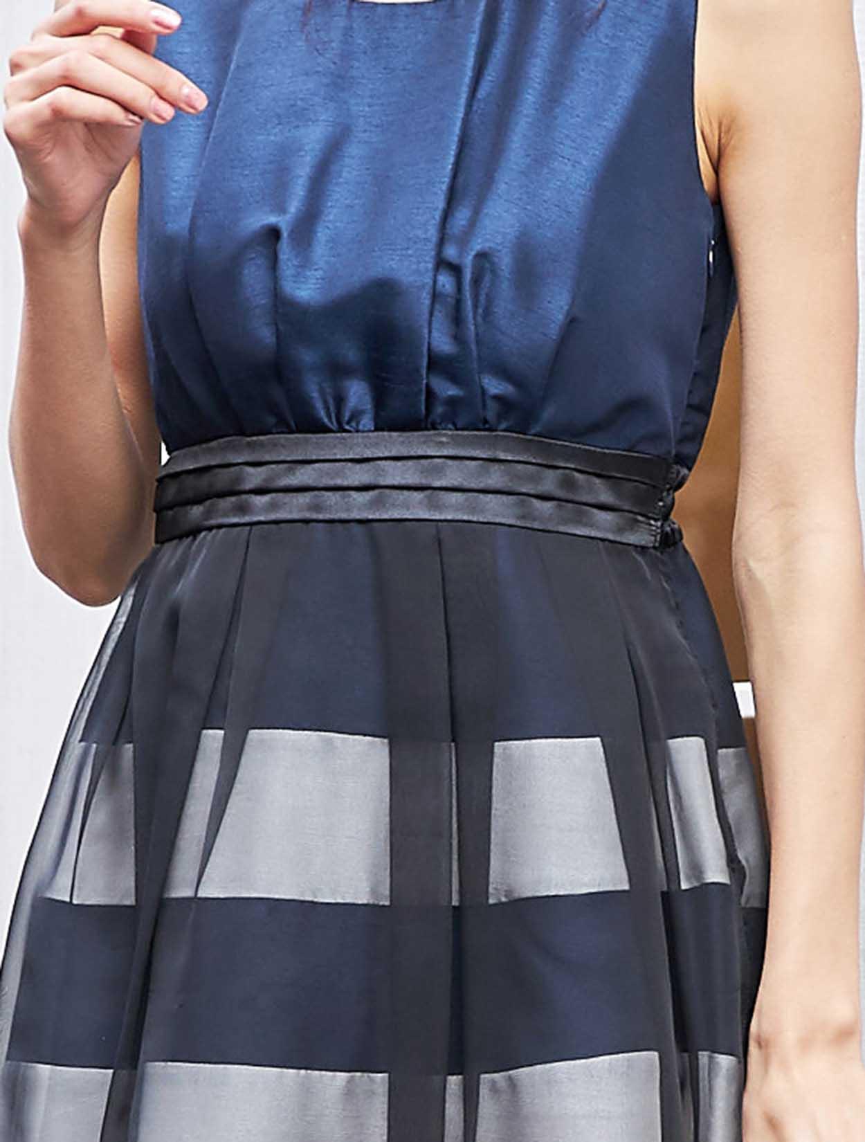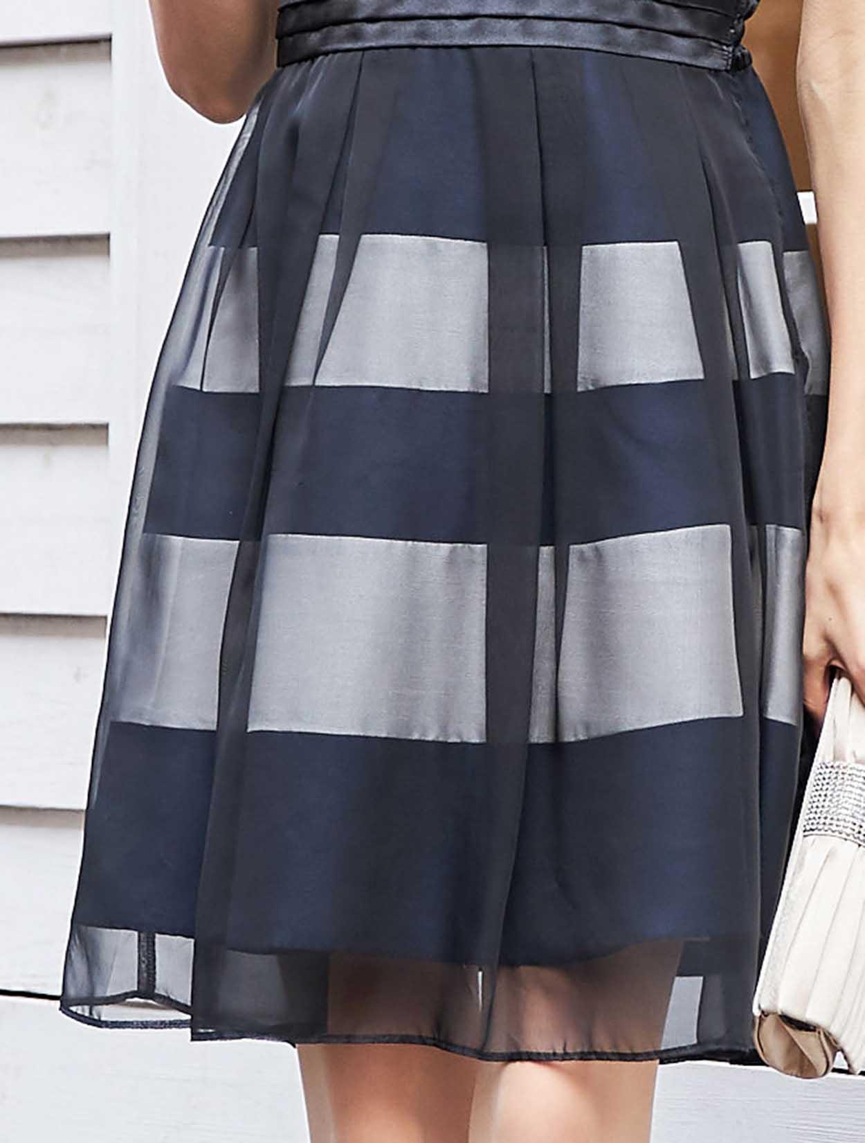 フィット&フレアのデザインでスタイルアップが叶います。高めの位置で切り替えたサテンのウエストマークには脚長効果もあり、縦のラインを印象付けてくれます。