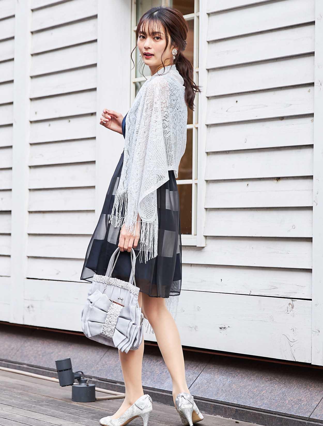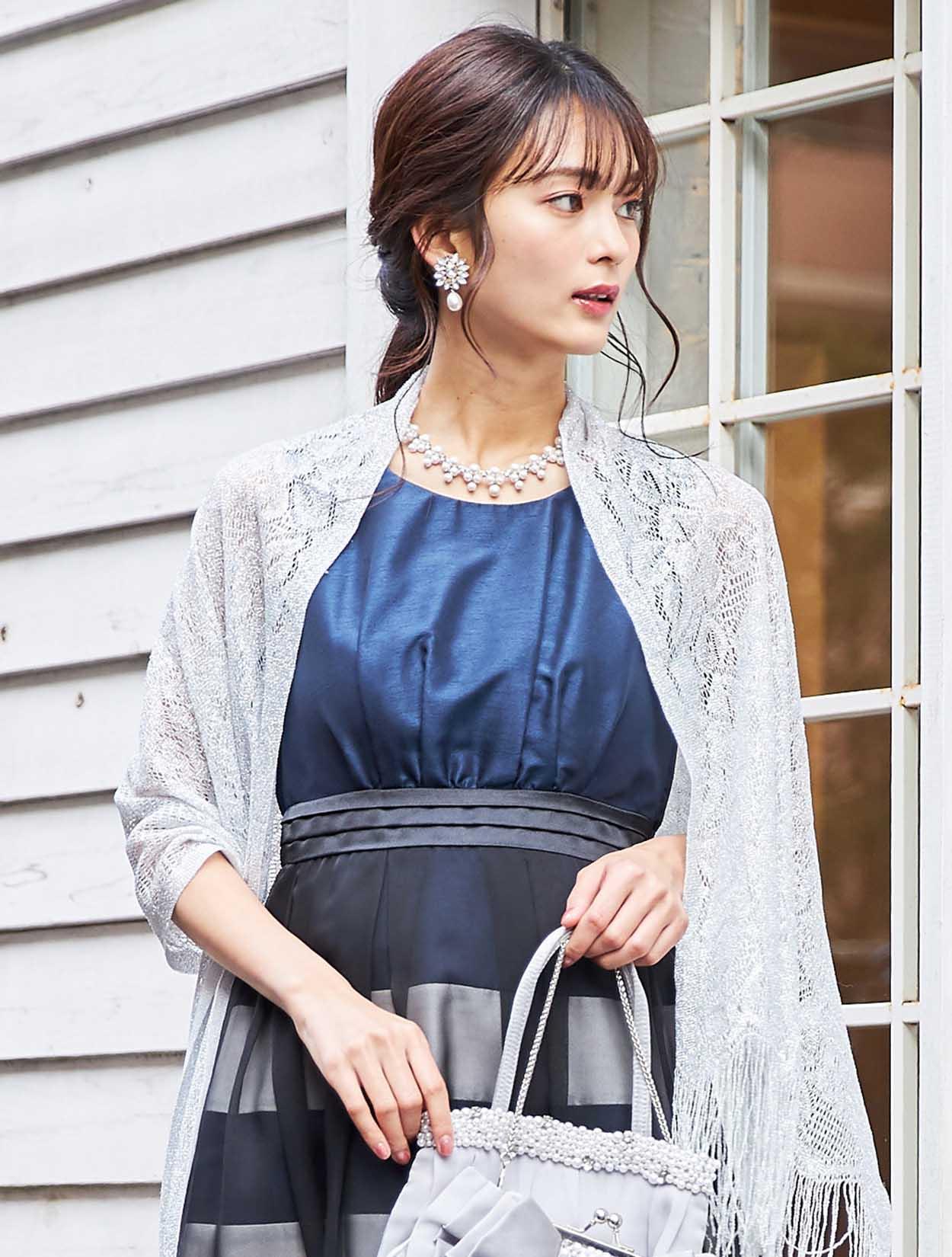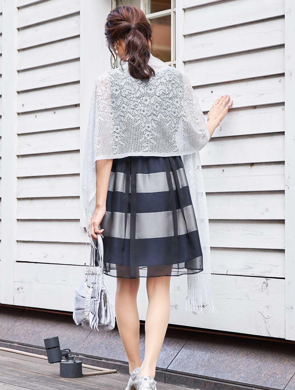 スッキリとしたシルバーのショールが、ボーダーデザインのドレスを大人っぽい印象に。