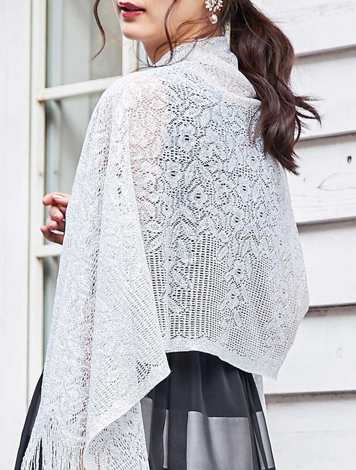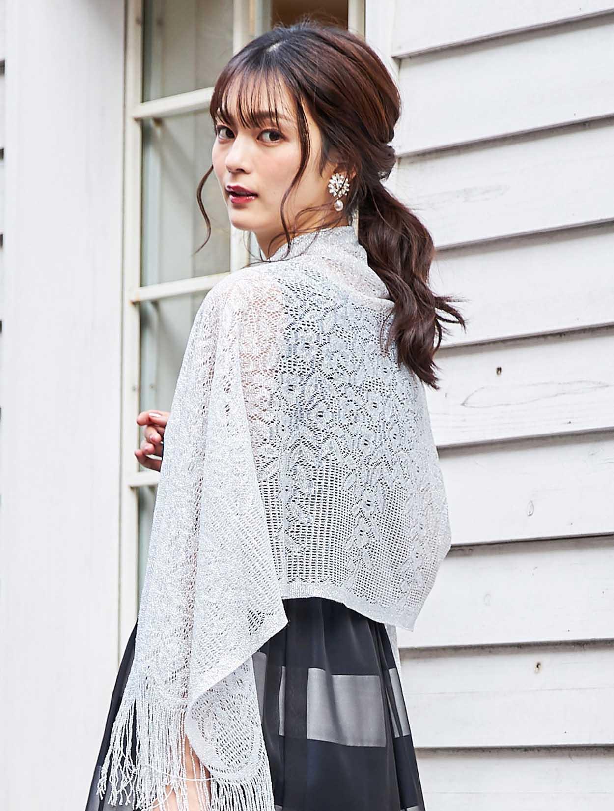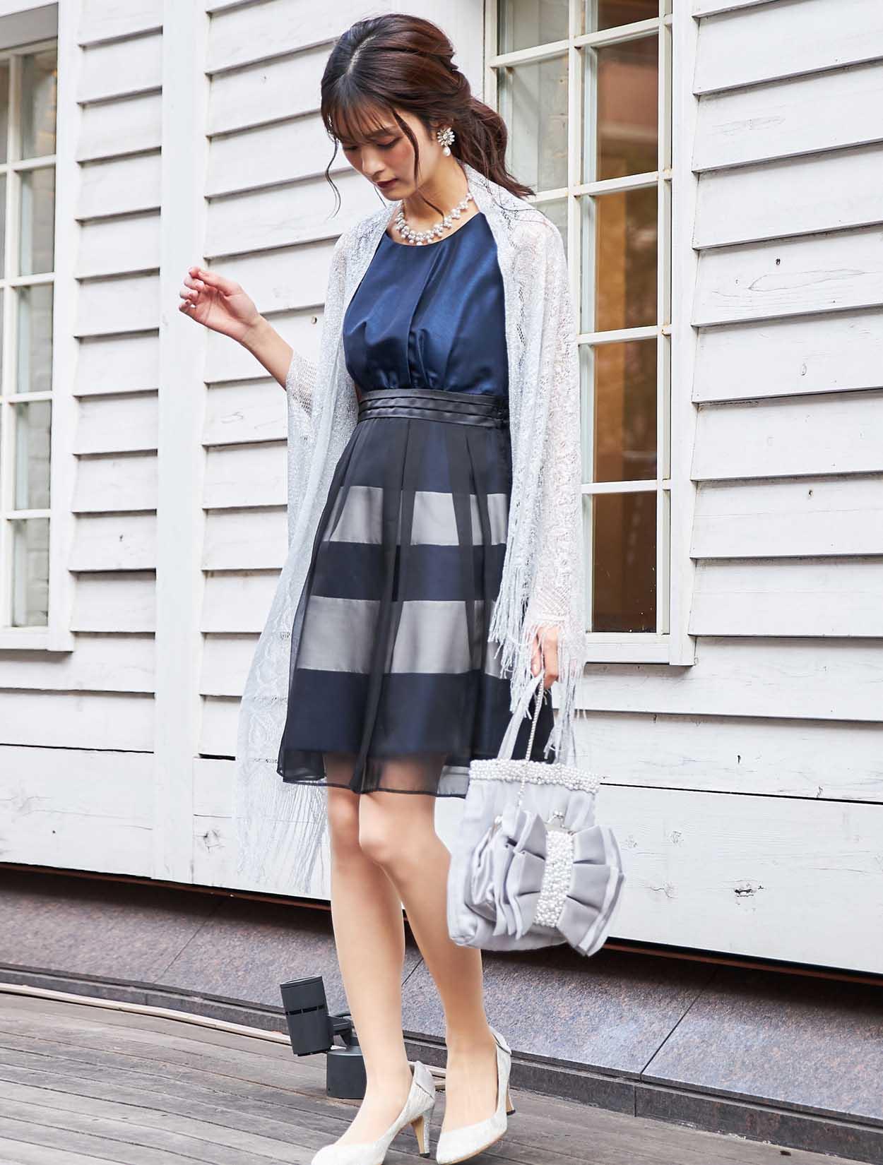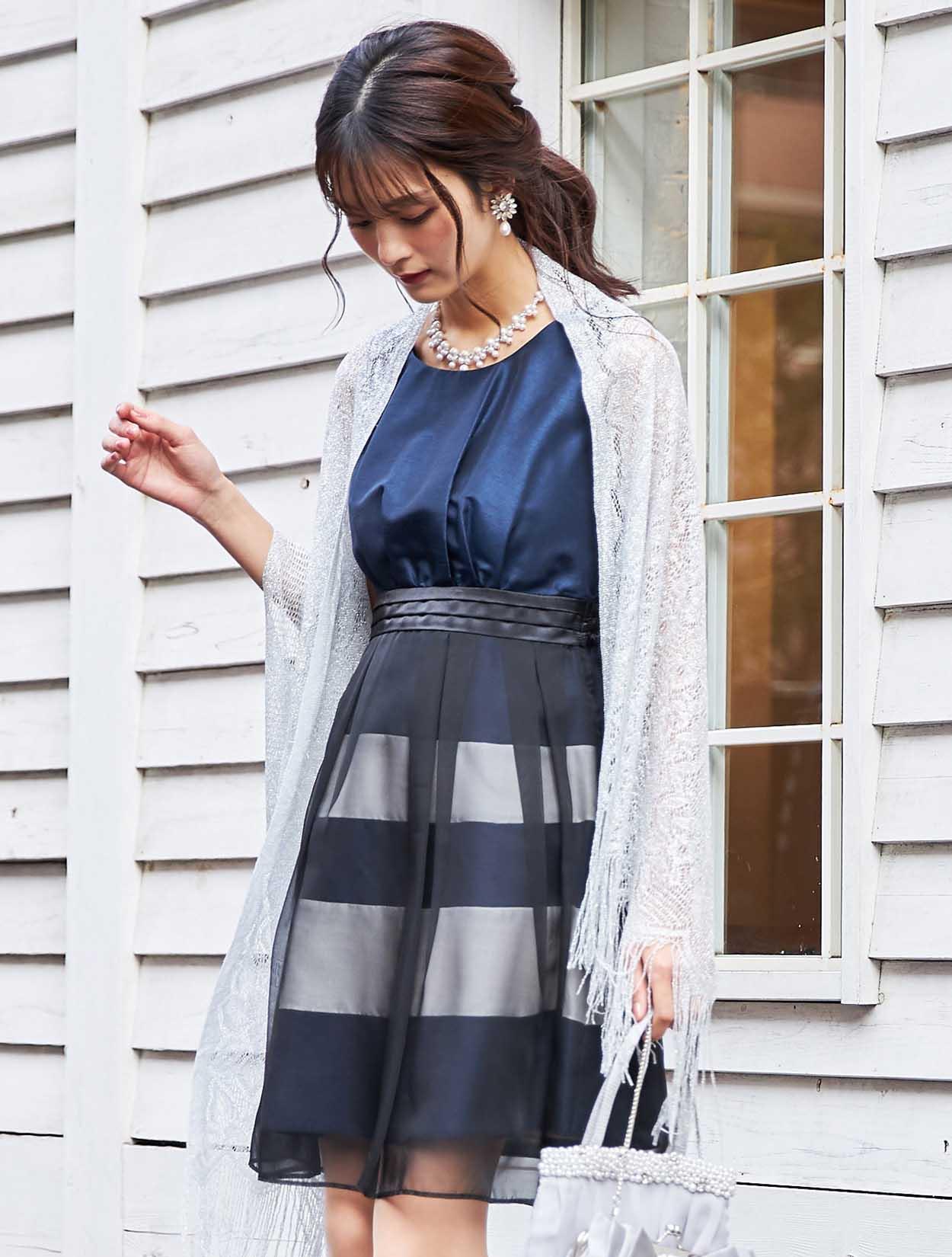 スッキリとしたシルバーのショールが、ボーダーデザインのドレスを大人っぽい印象に。