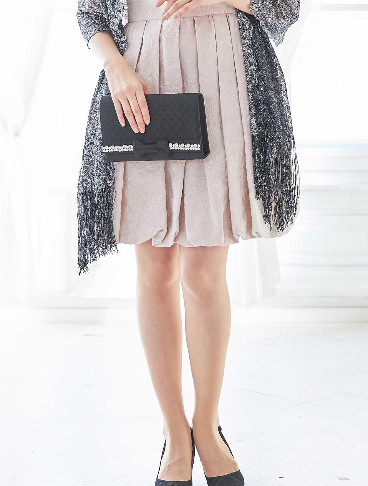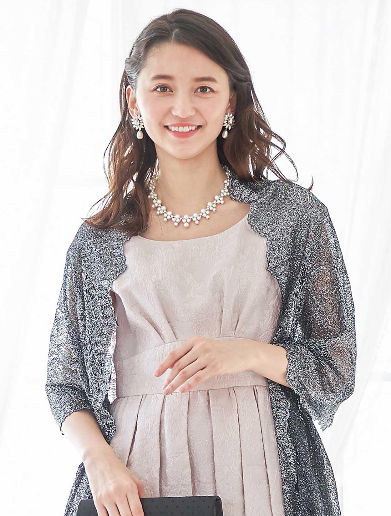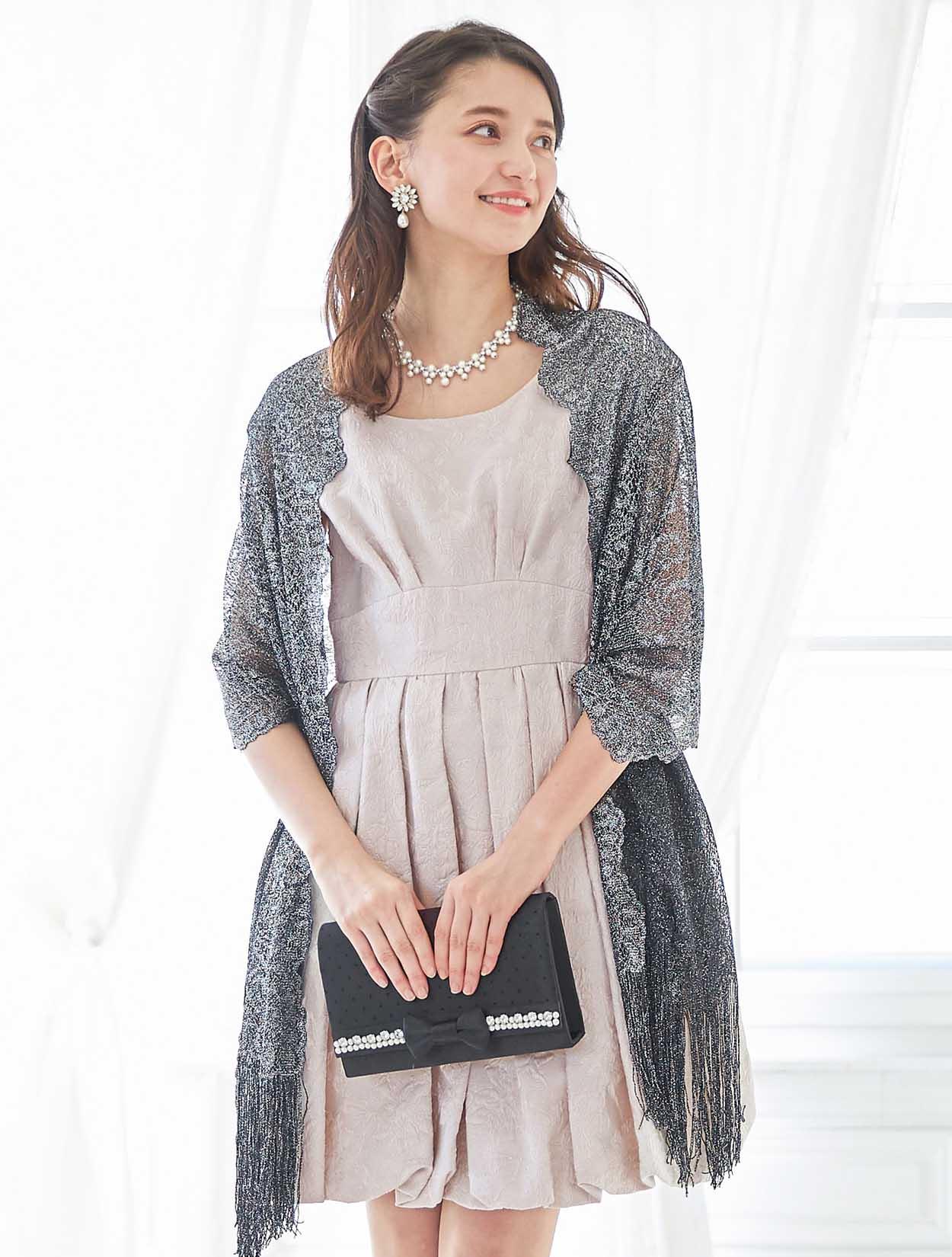 アイボリーに近いベージュはラメの糸はさりげなく輝く上品なカラー。ブラックをコーディネートに使えば結婚式でも着用可能です。