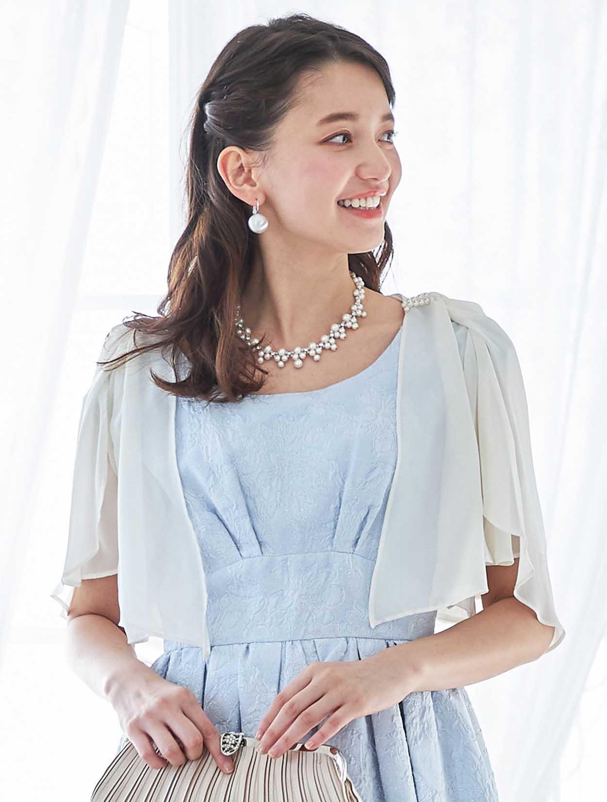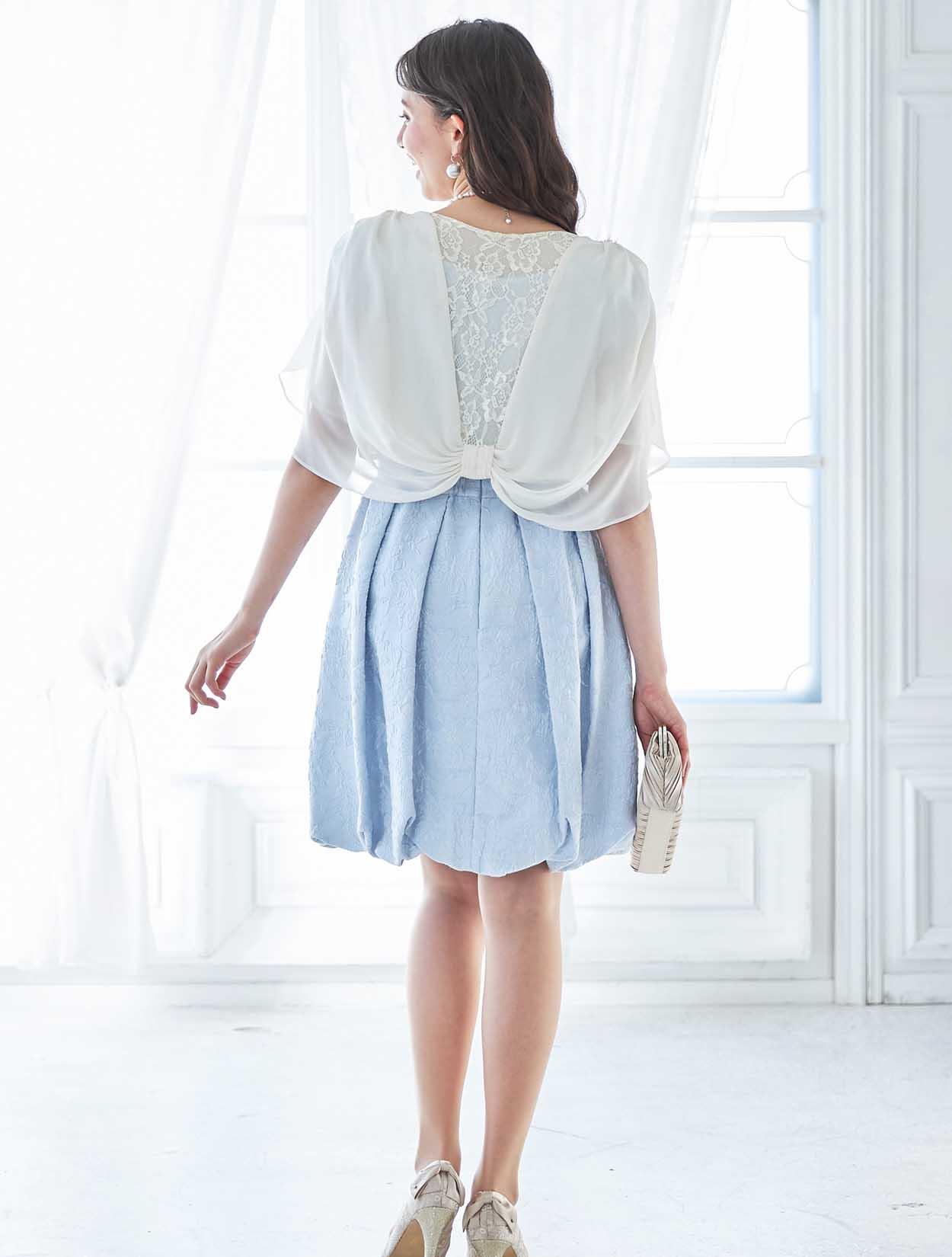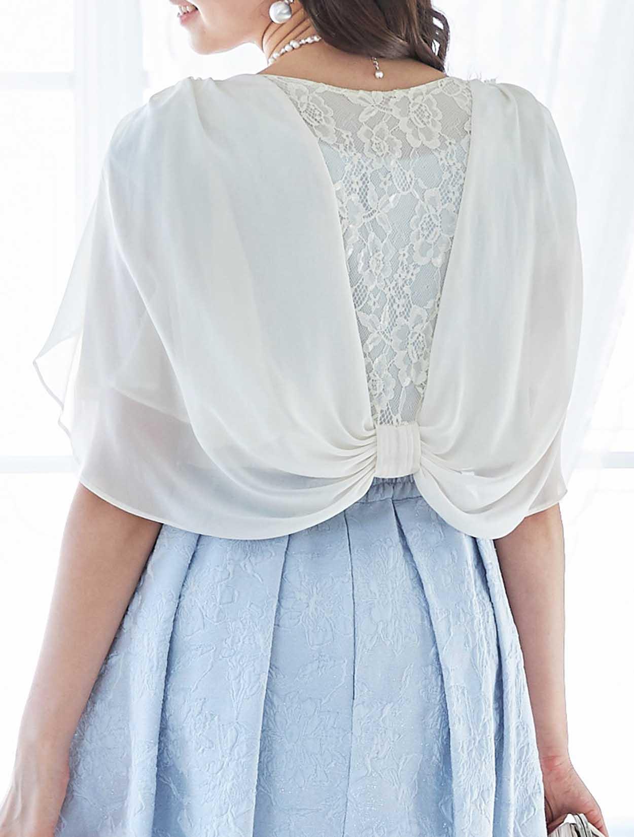 サックスカラーに映える明るいベージュのボレロは、バックスタイルのリボンデザインがポイントです。