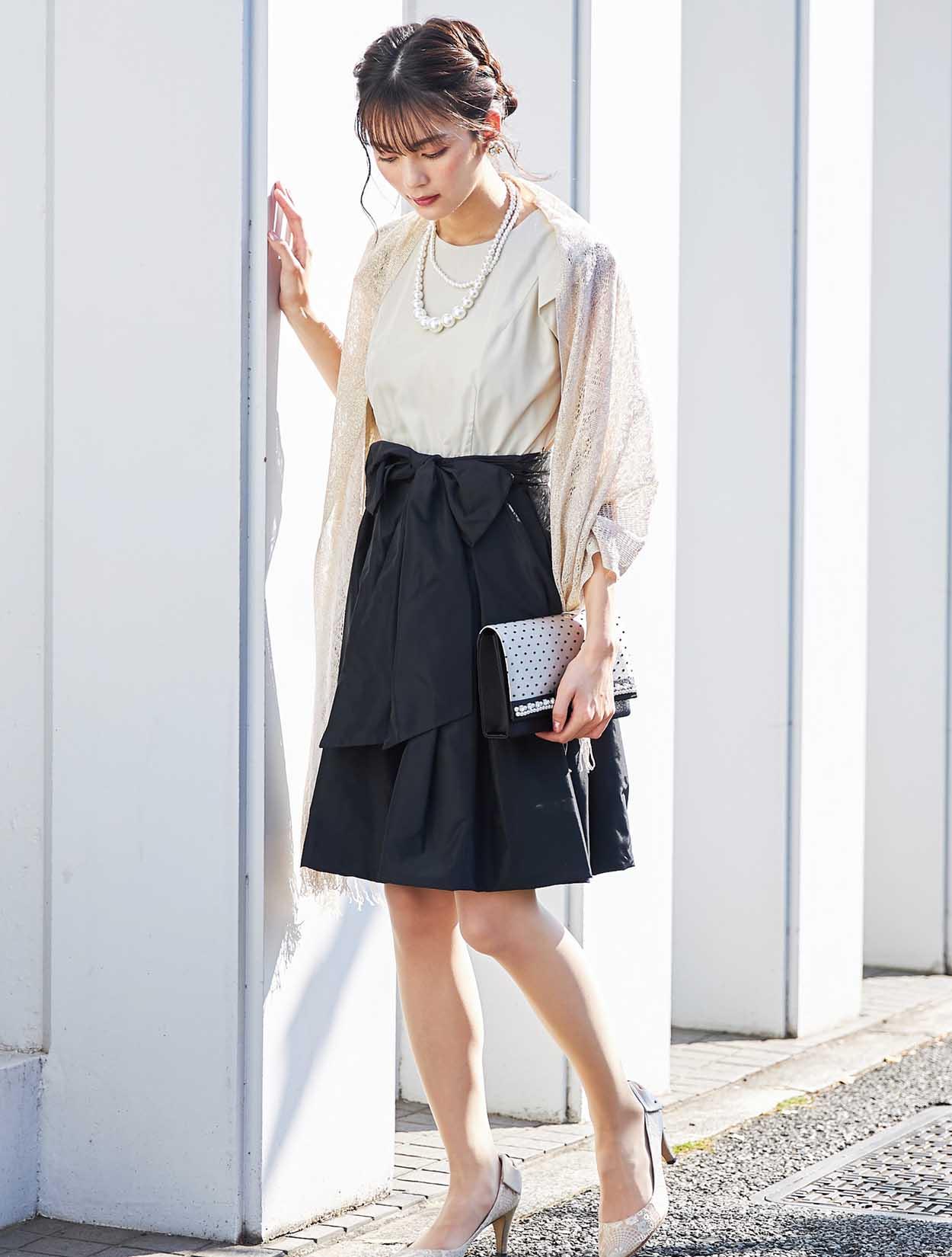 ベージュとブラックのバイカラードレス。クラシカルなデザインにモードな配色を大胆に使用した大人可愛いカラーバランス。