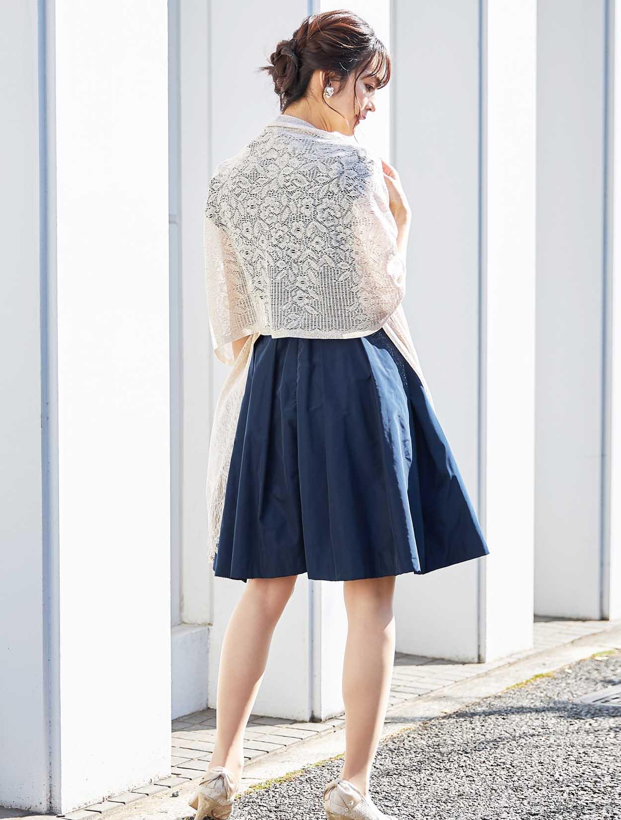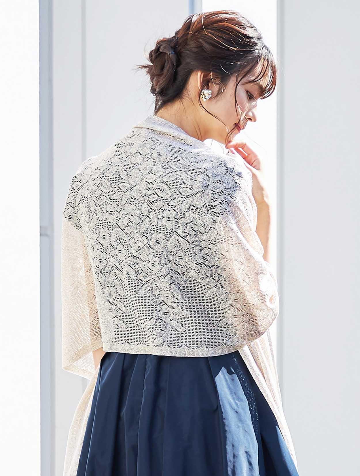 繊細なラメ感のゴールドのショールが、フレアのドレスを大人っぽく華やかな印象に。