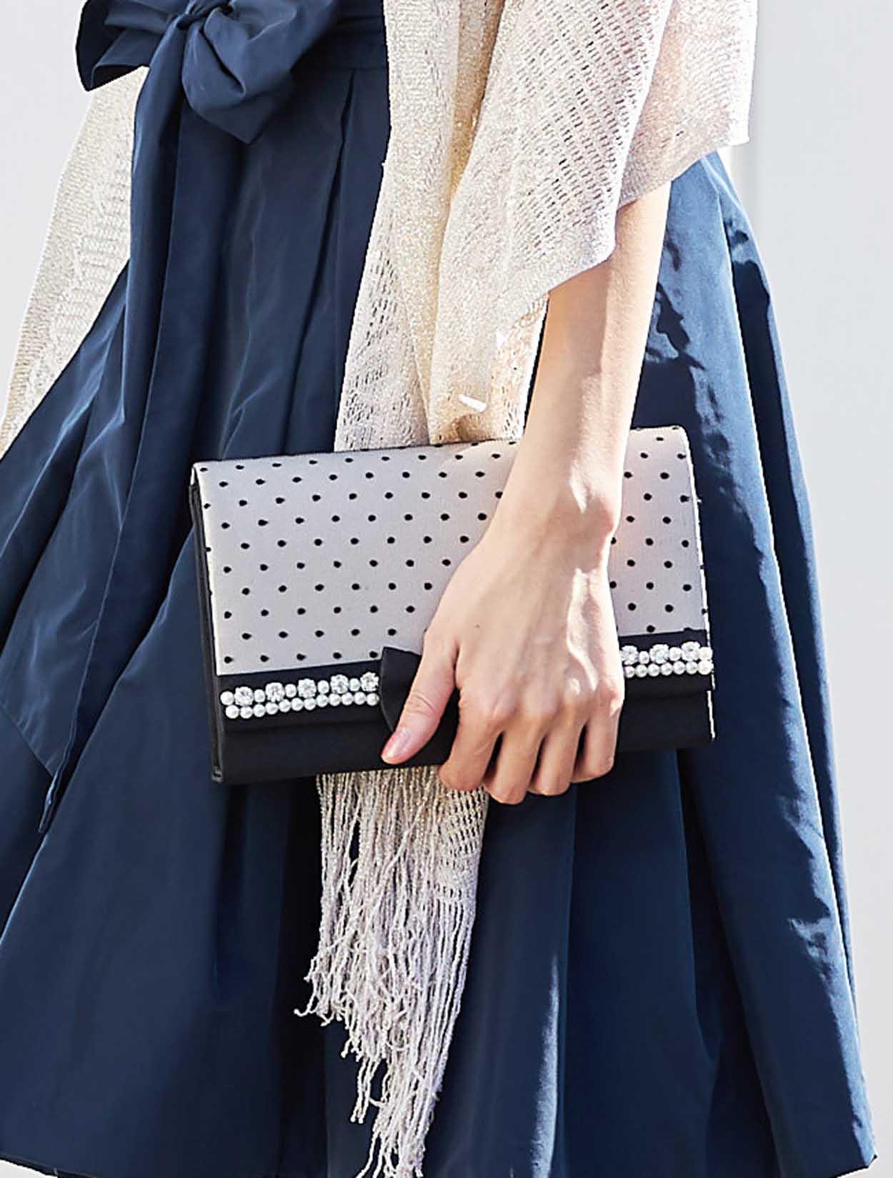 ドットチュールのバッグと2連の大ぶりネックレスが、シンプルなドレスのアクセントに。