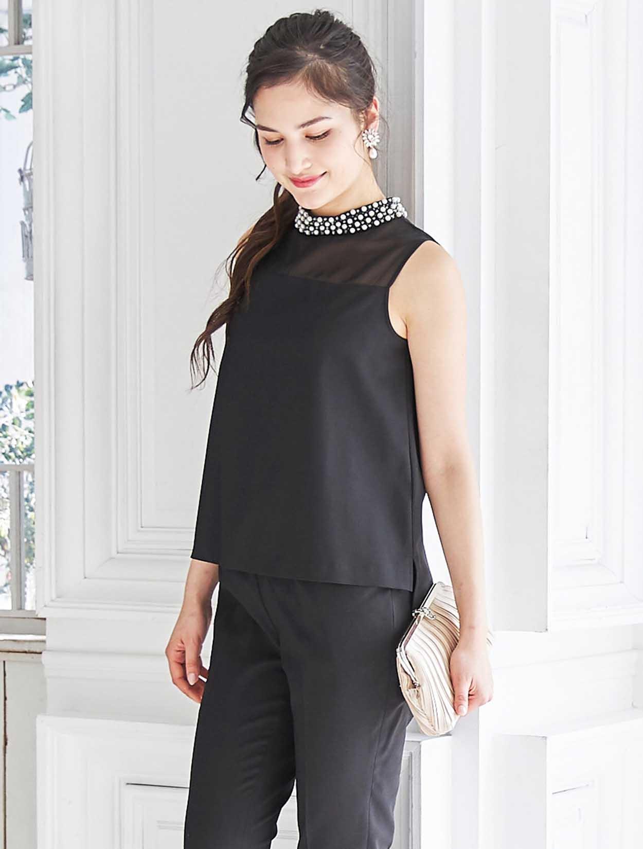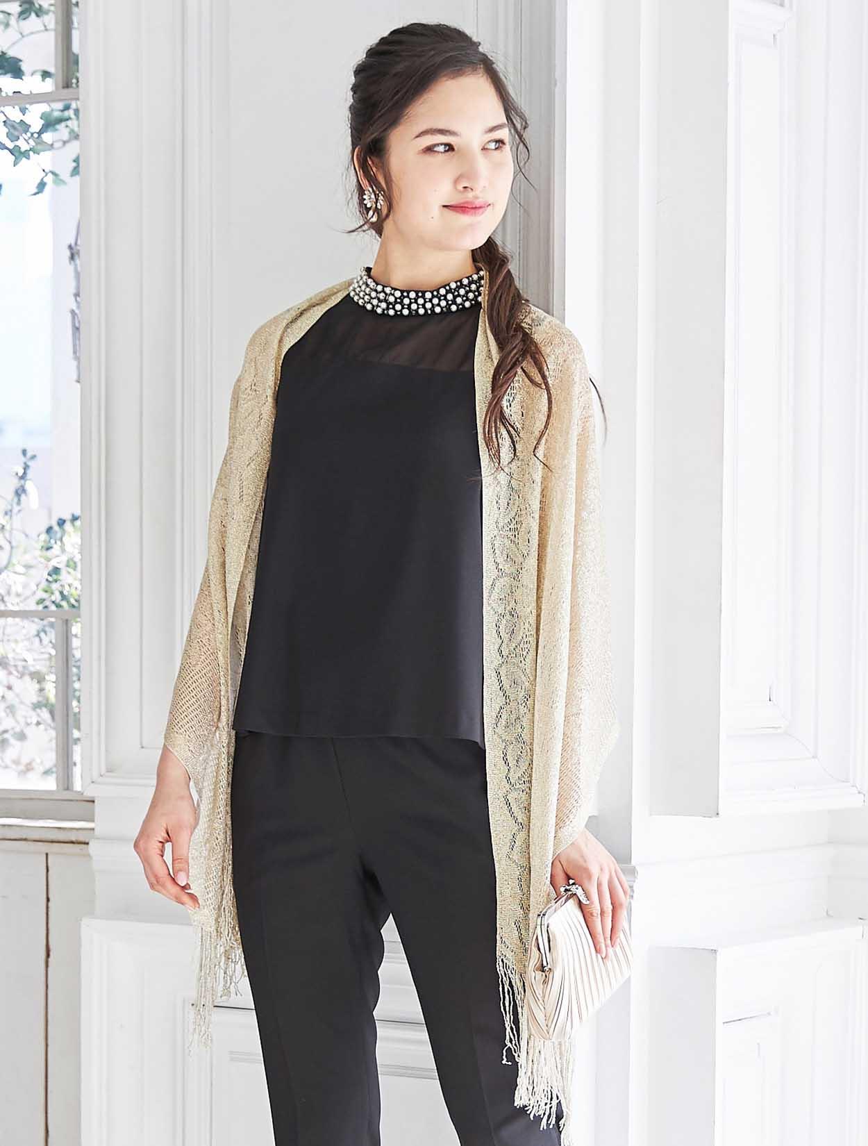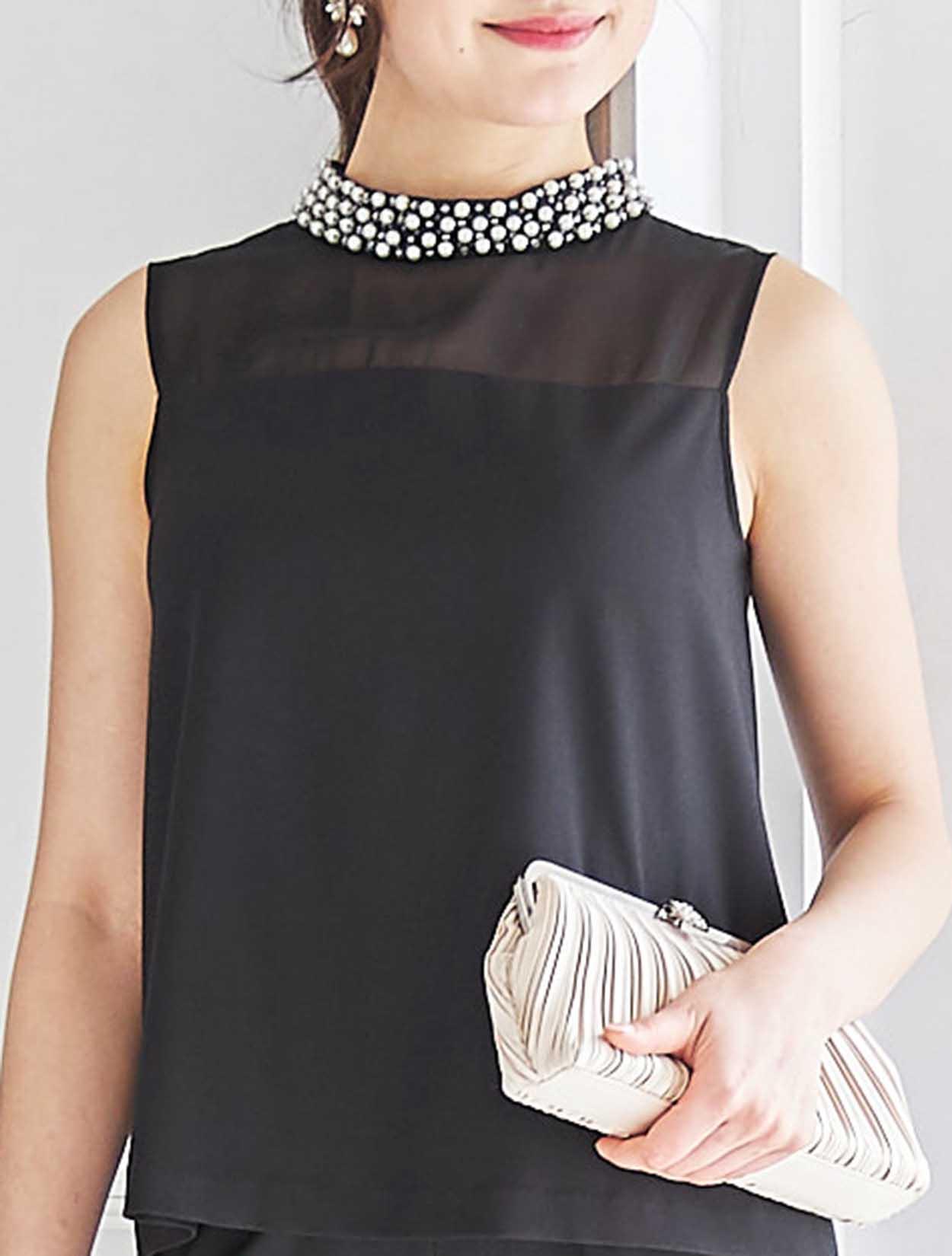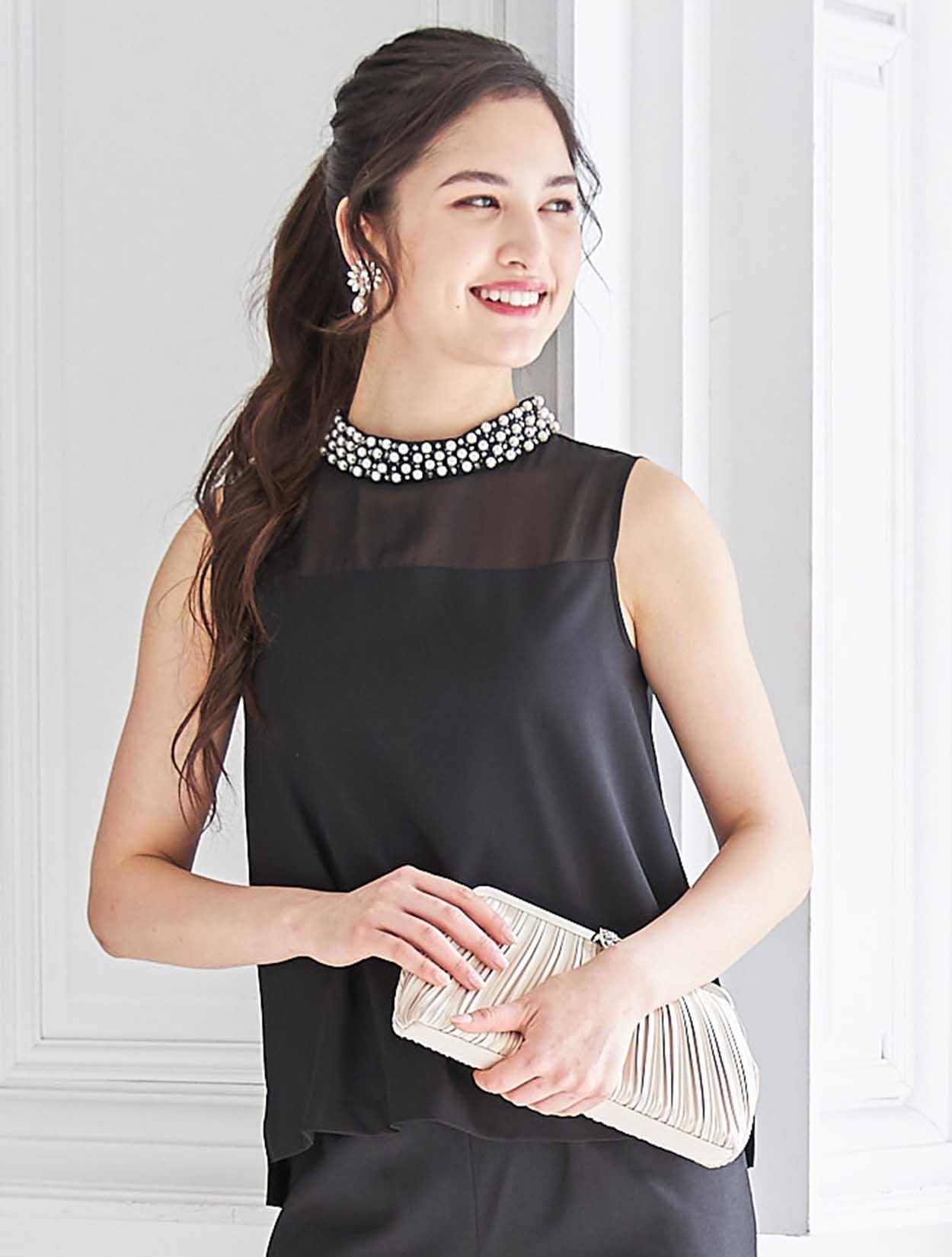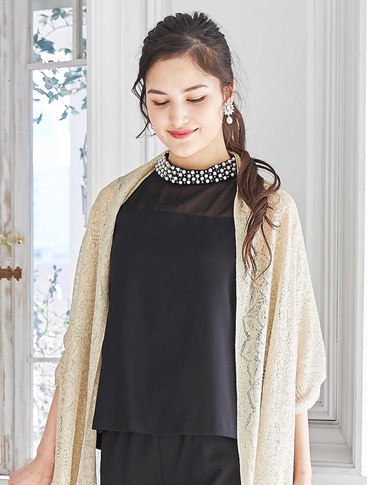 ふんだんにパールを使用した緩やかなスタンドネックは、首を長くフェイスラインを華やかに彩ります。さり気ない透け感のベアトップが大人の抜け感を演出。