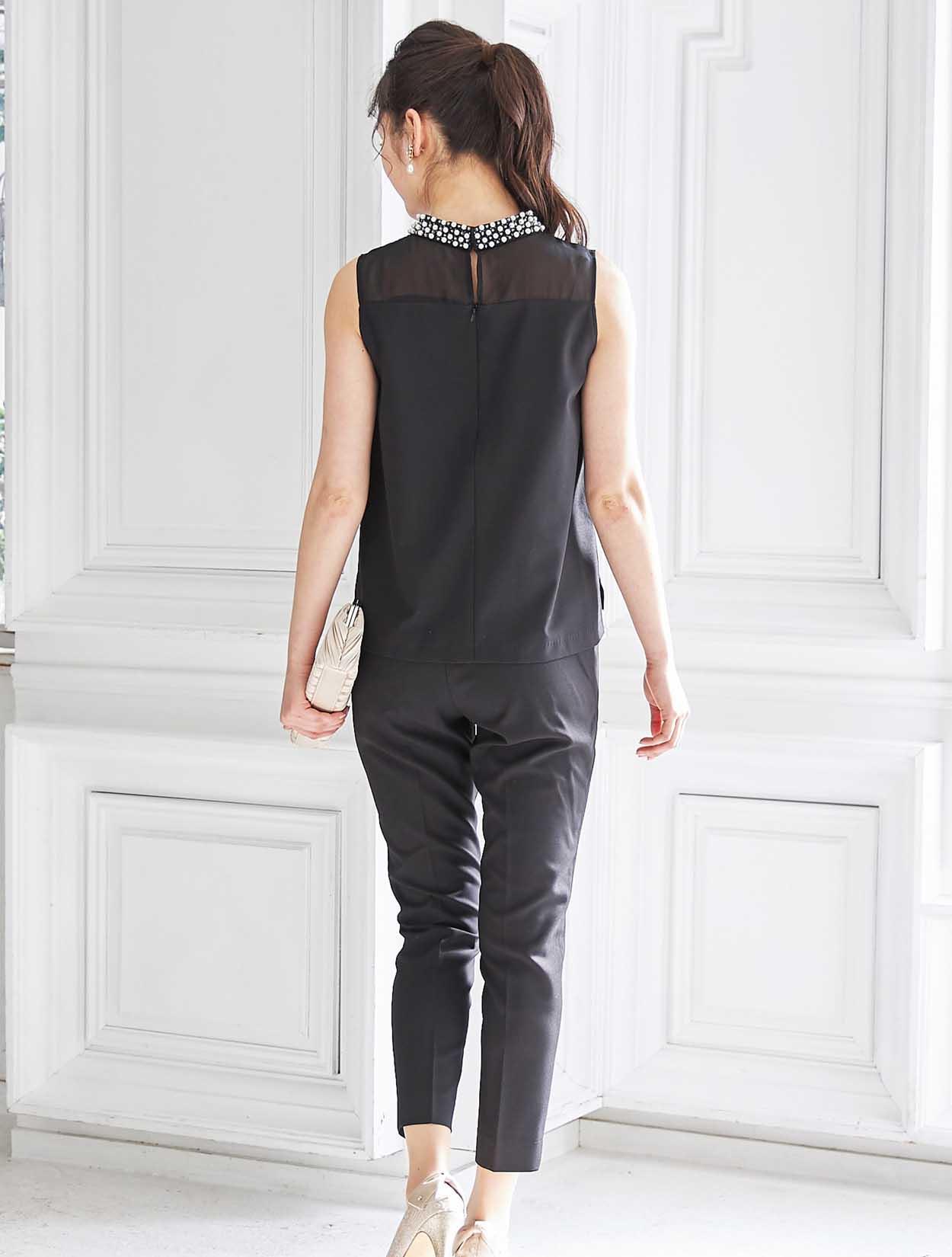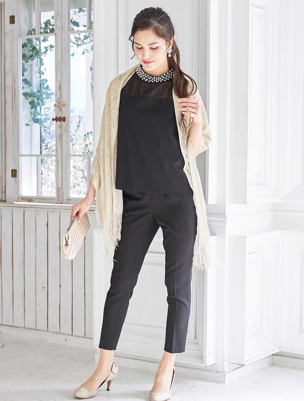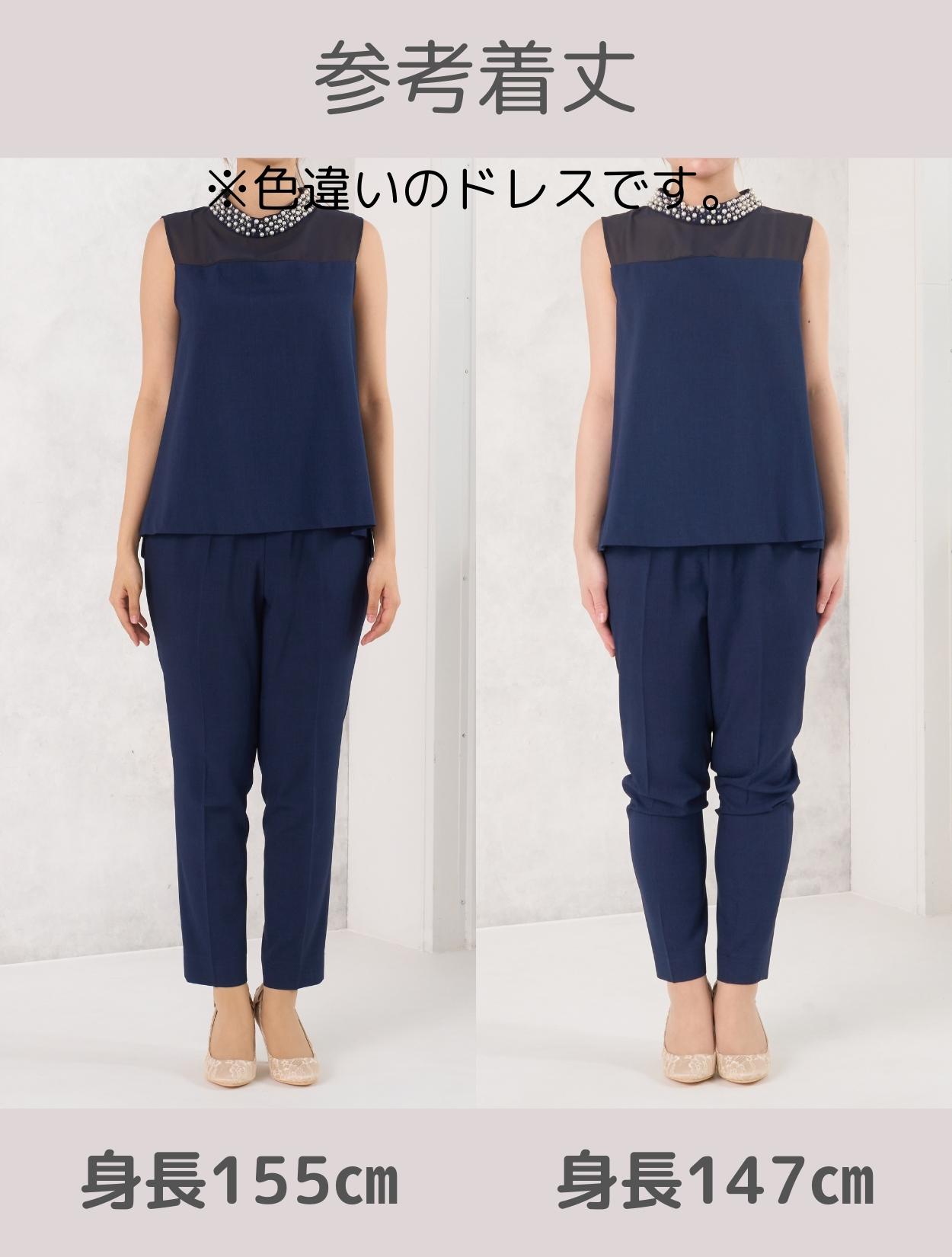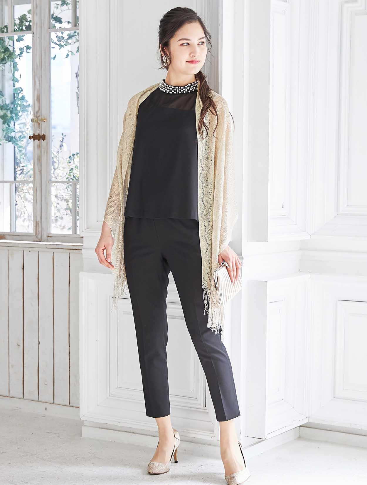 ふんだんにパールを使用した緩やかなスタンドネックは、首を長くフェイスラインを華やかに彩ります。さり気ない透け感のベアトップが大人の抜け感を演出。