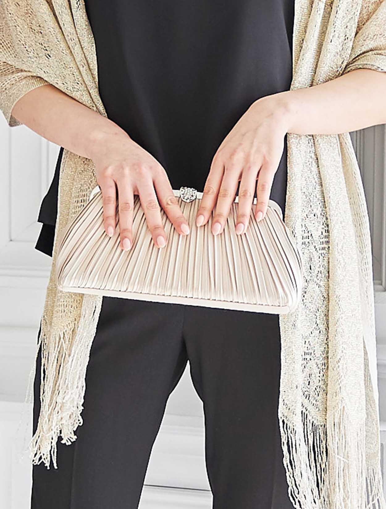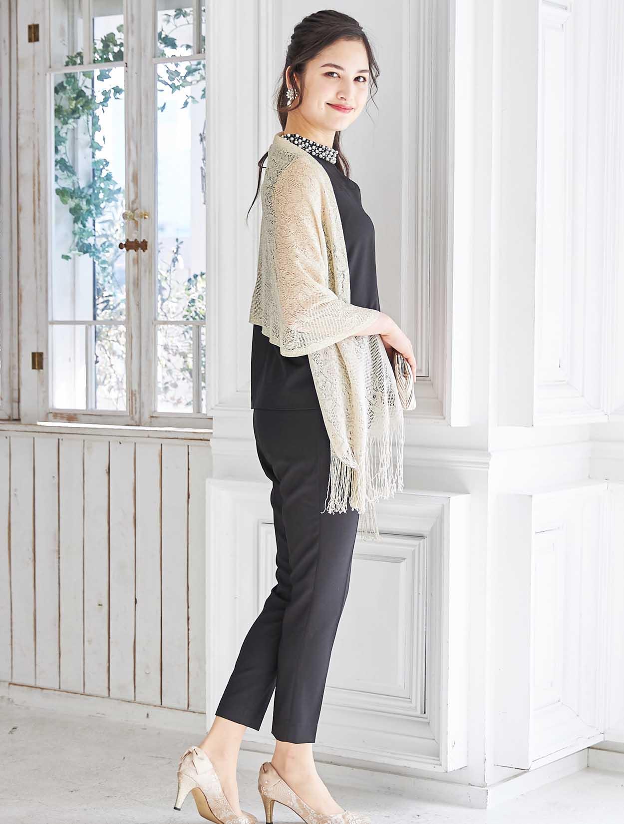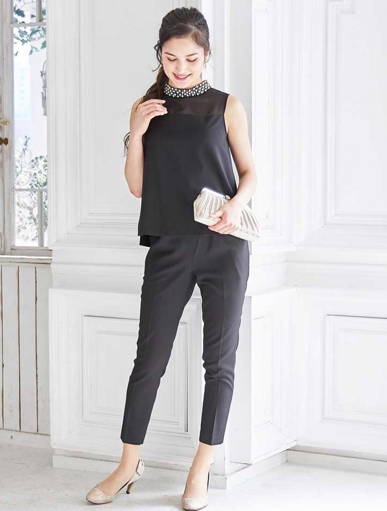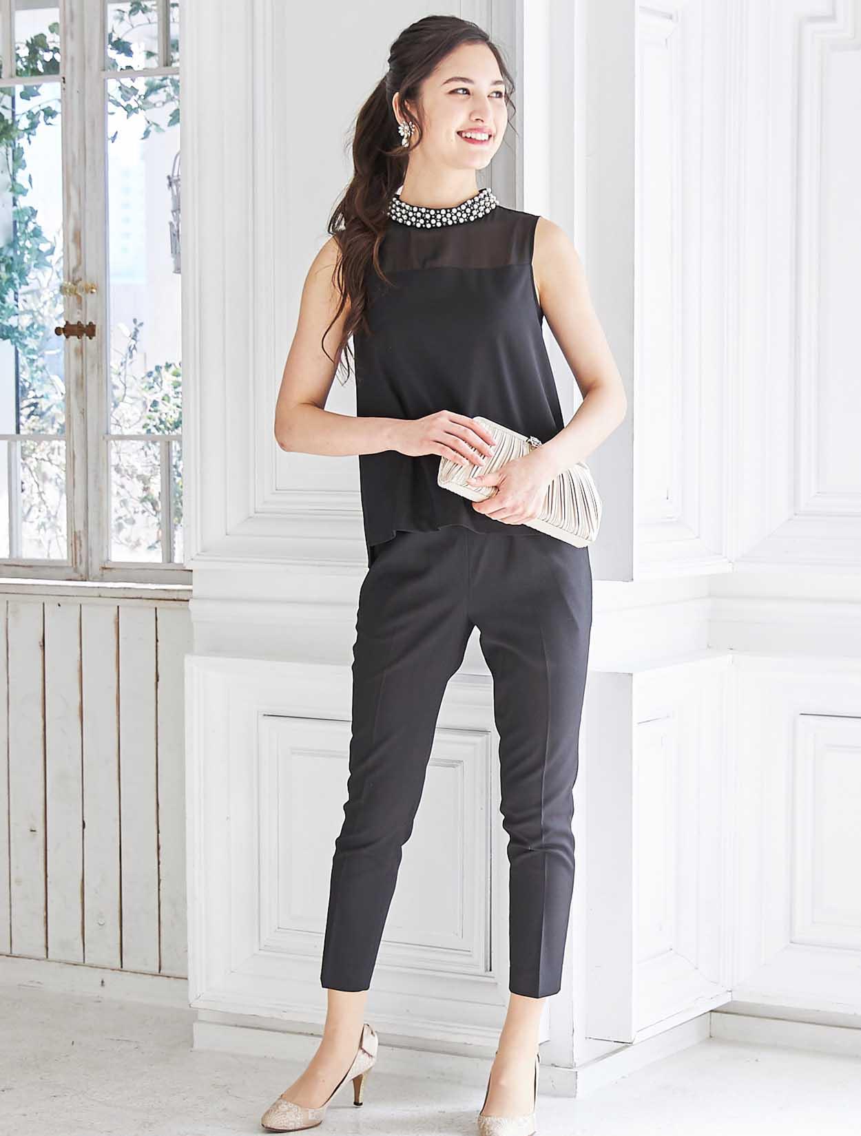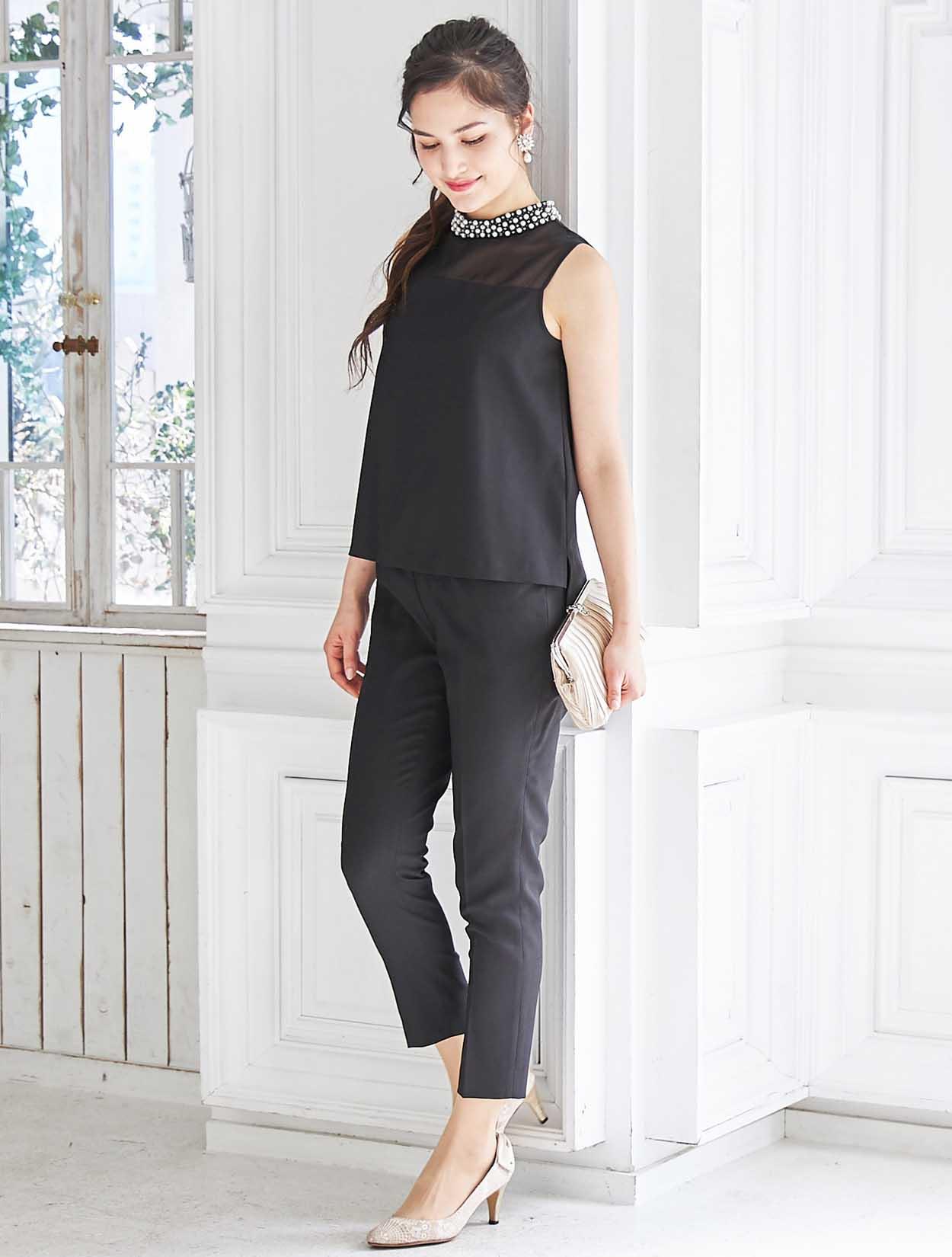 ふんだんにパールを使用した緩やかなスタンドネックは、首を長くフェイスラインを華やかに彩ります。さり気ない透け感のベアトップが大人の抜け感を演出。