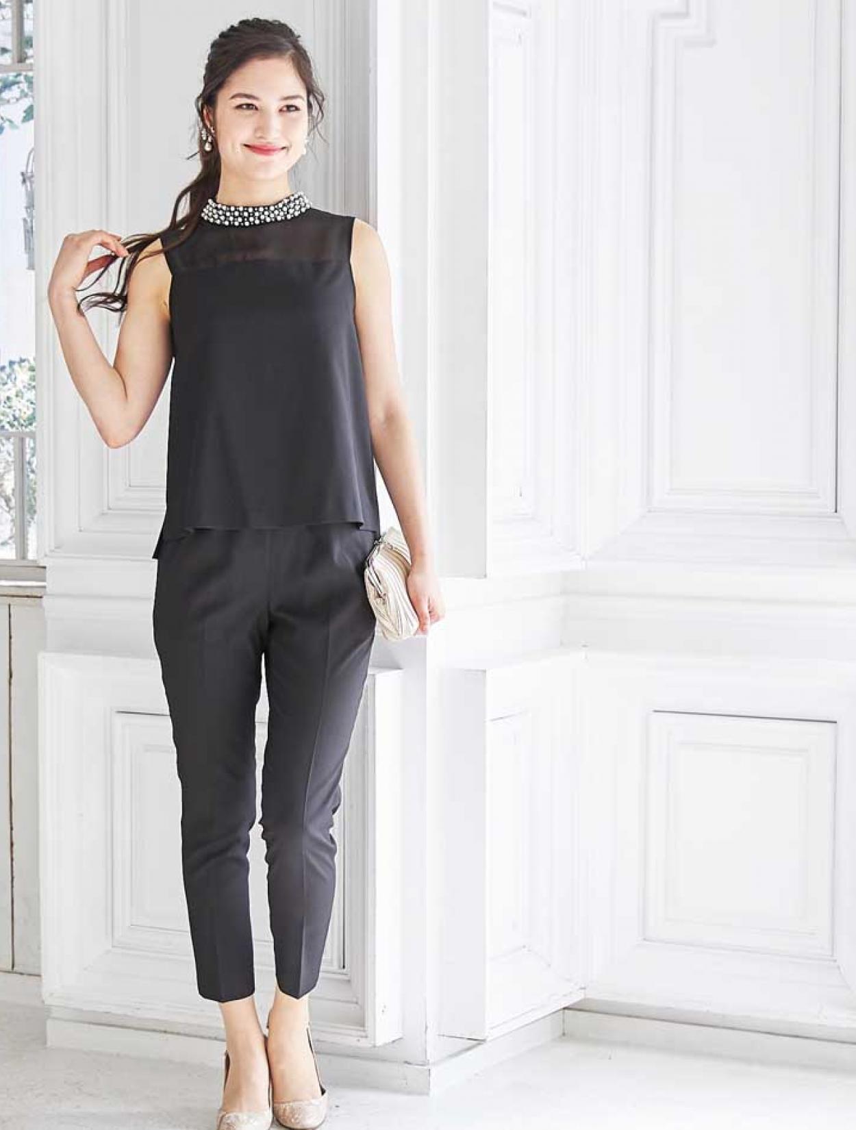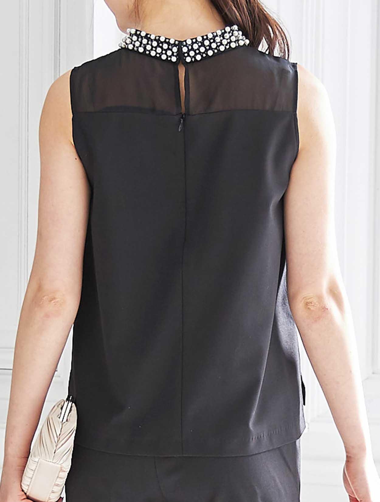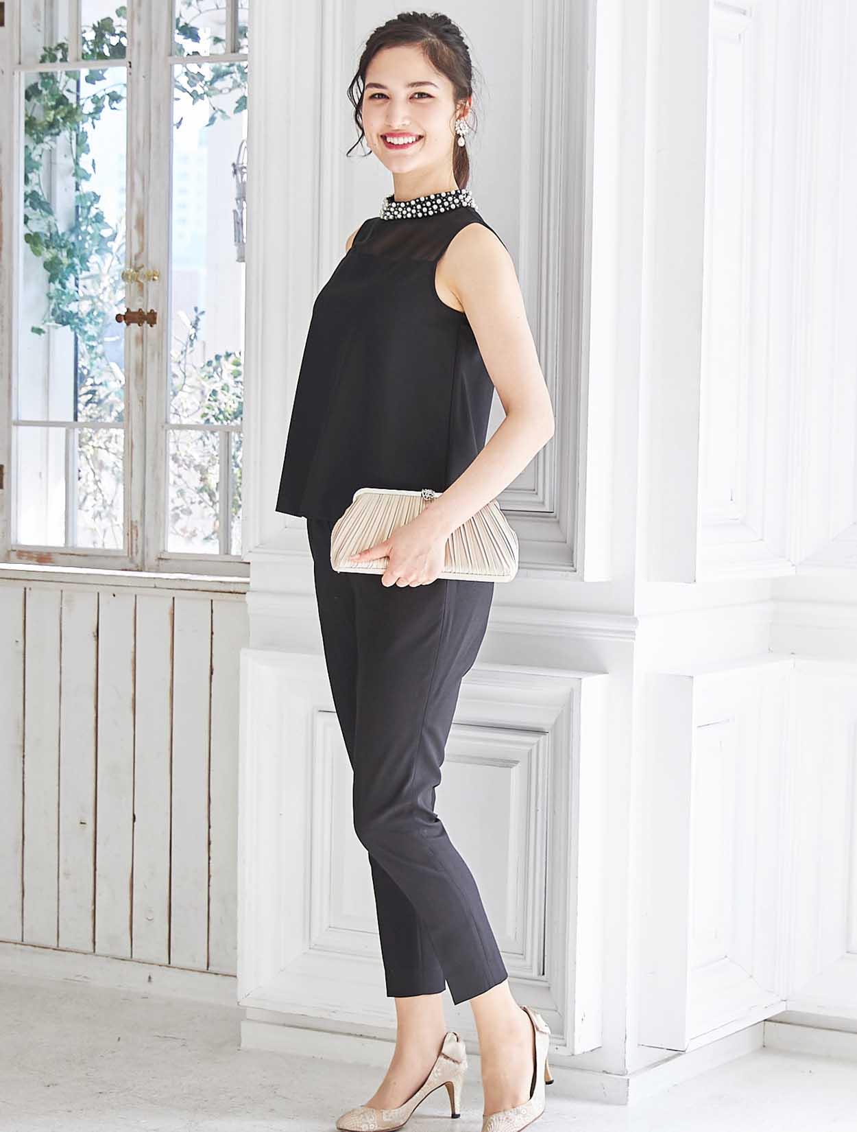 パールが施されたスタンドネックはフェイスラインを綺麗に見せてくれるので、ネックレスなしでも安心。