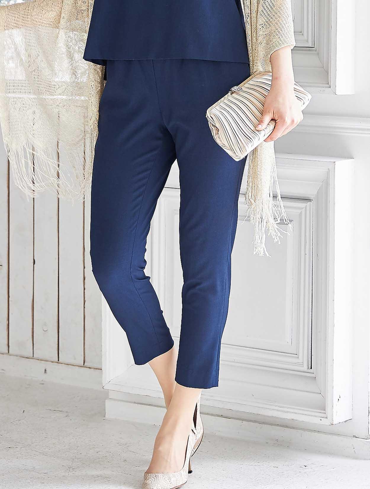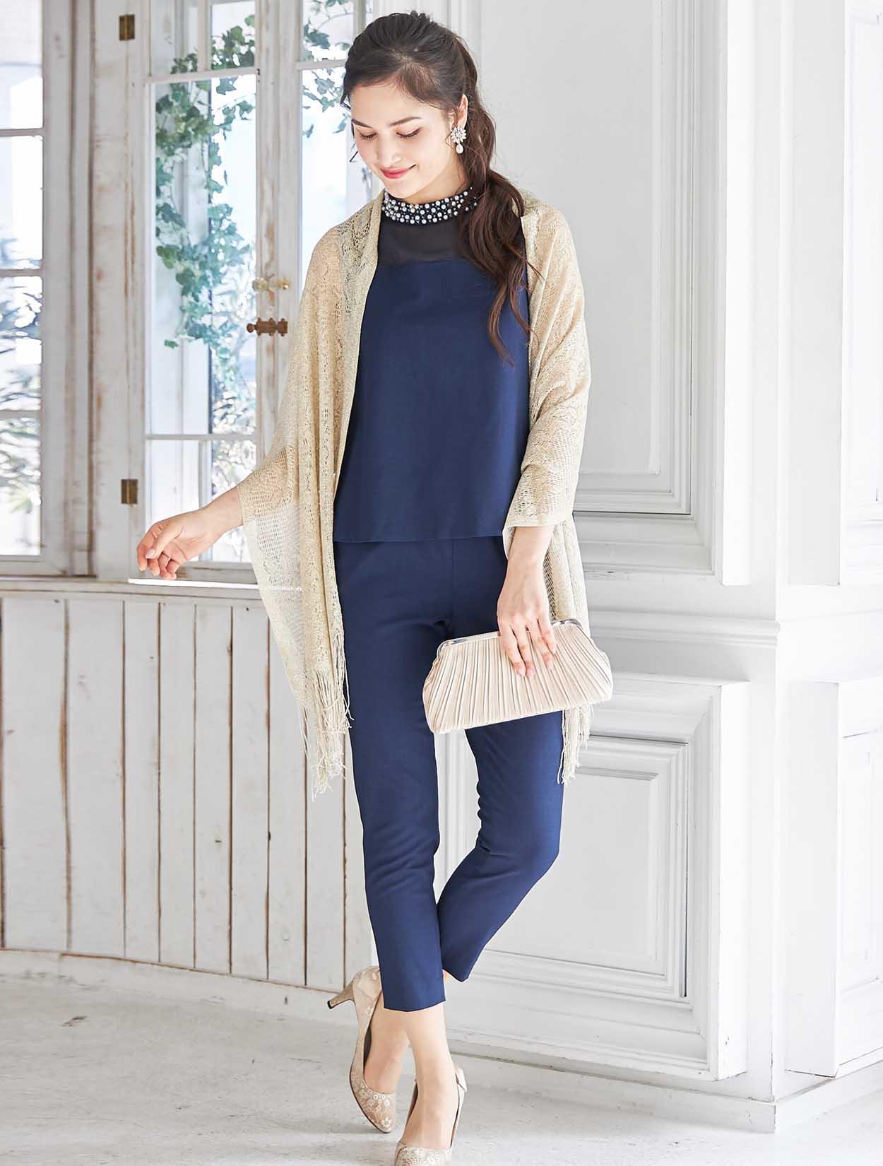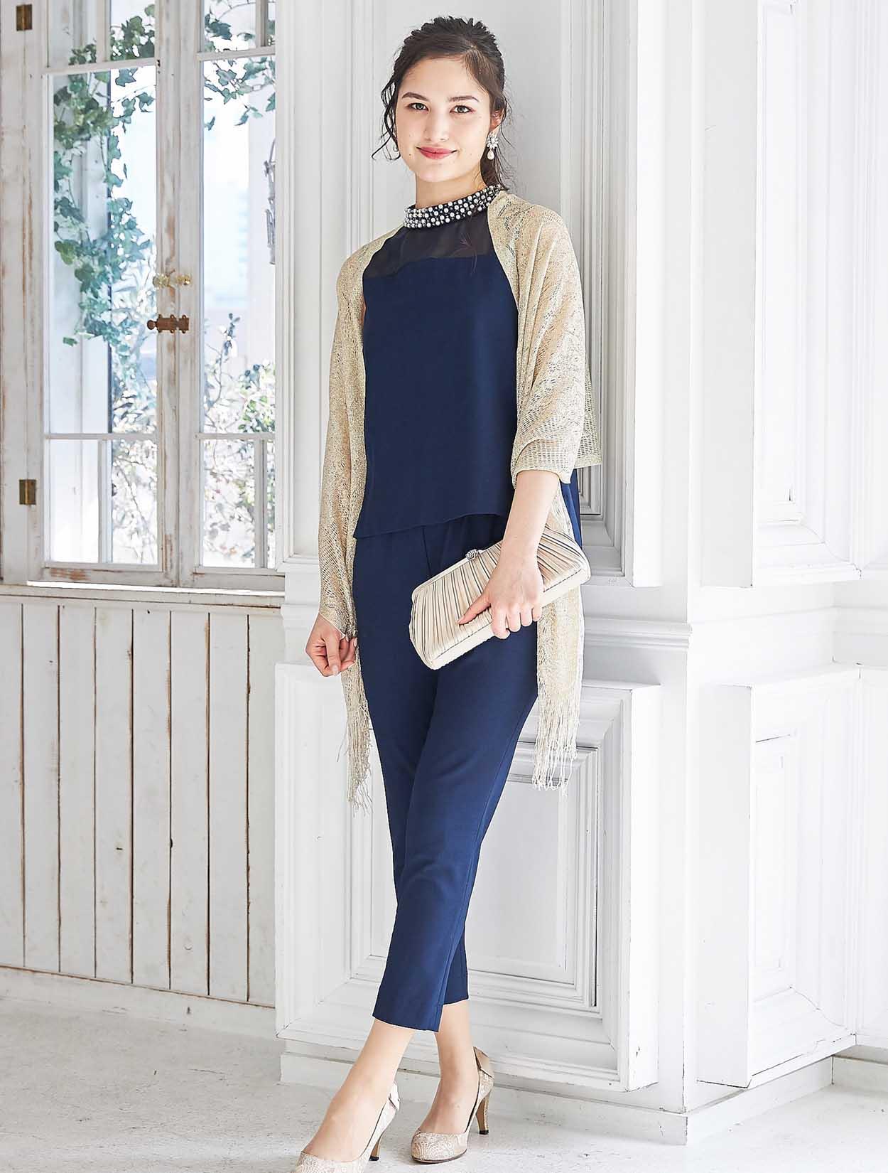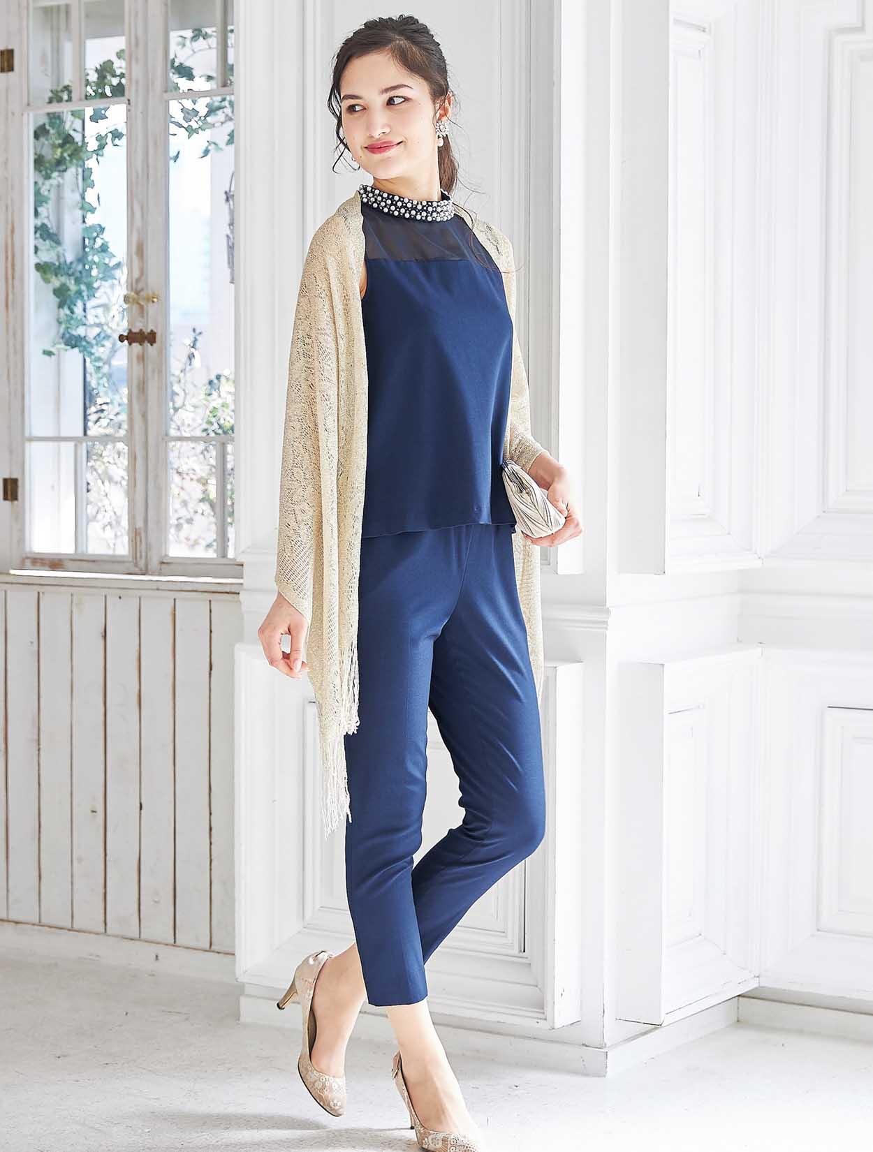 スッキリ端正なネイビーカラーが上品なパンツスタイルドレス