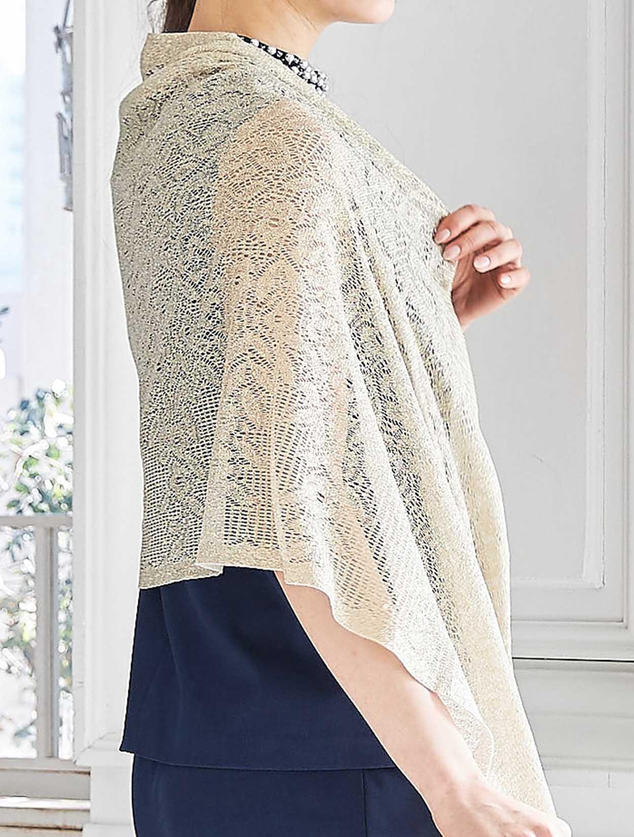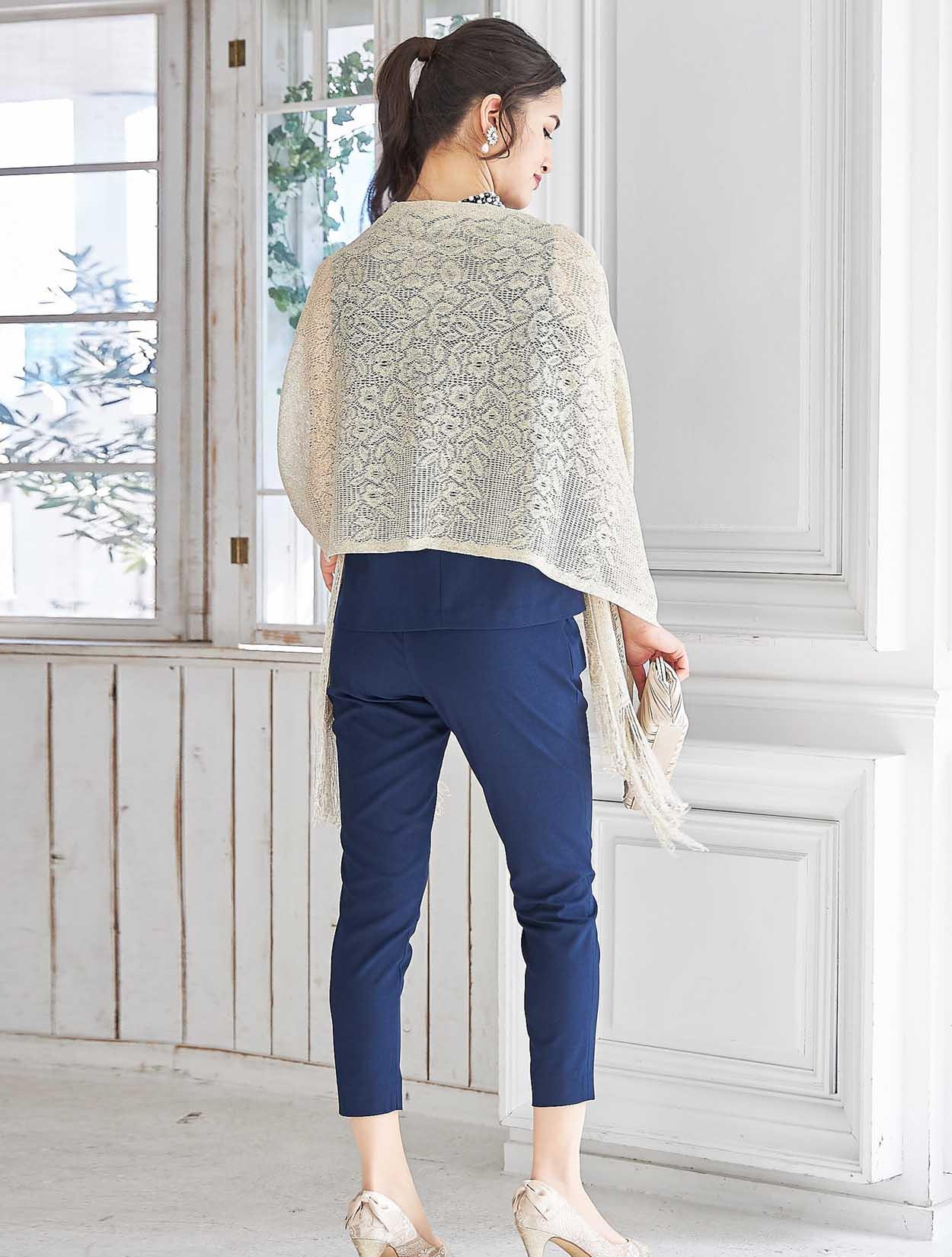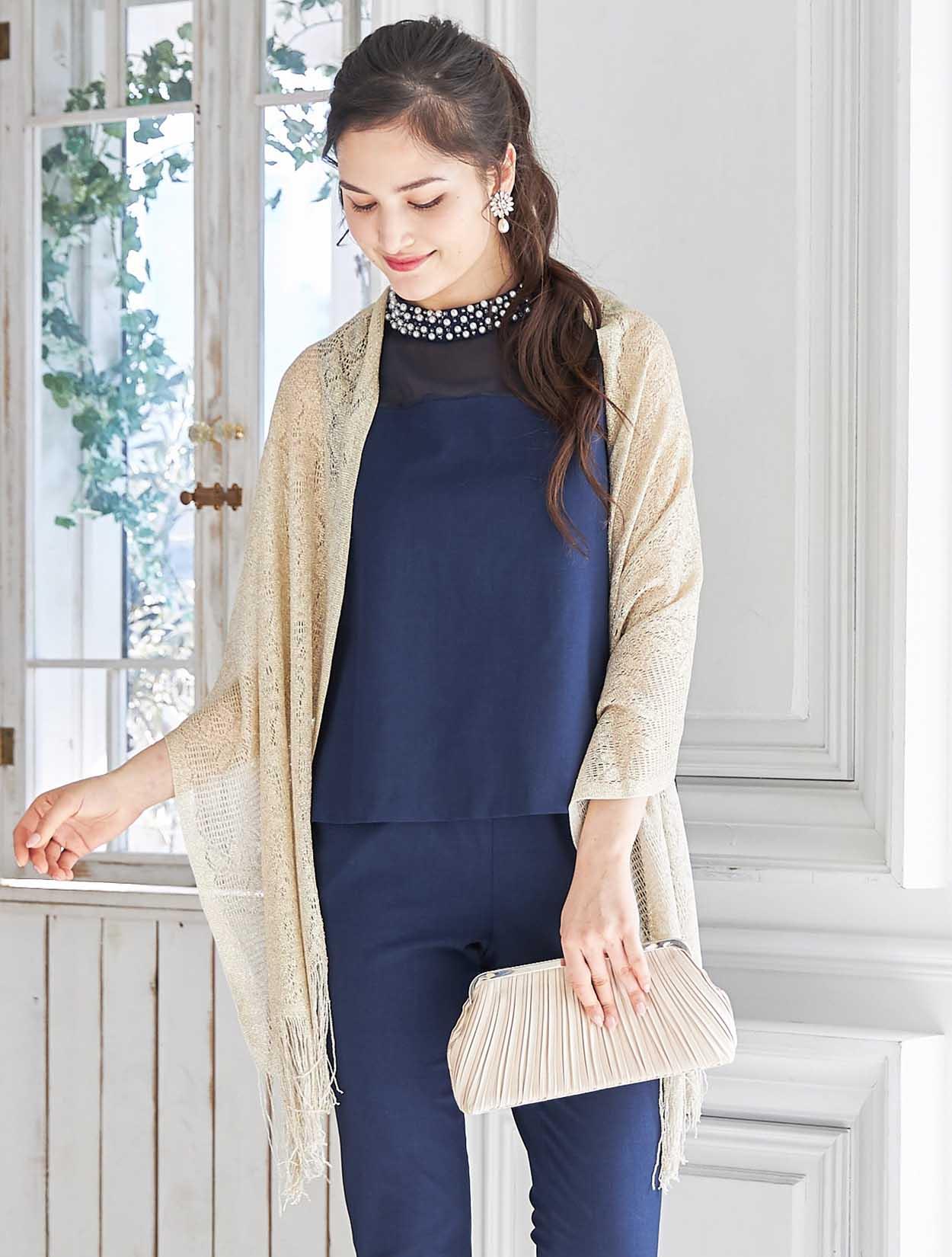 ゴールドのラメショールが輝くパーティースタイルのコーディネート。