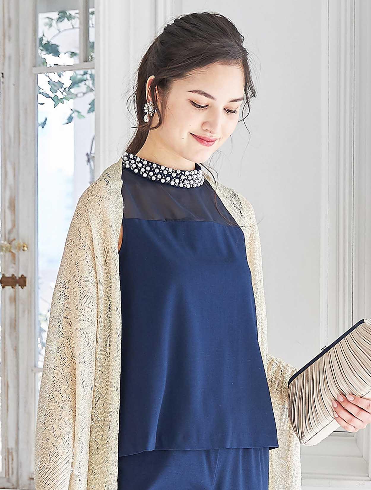 スタンドネックにはパールが施されているので、ネックレスなしでもフェイスラインは十分華やかです。
