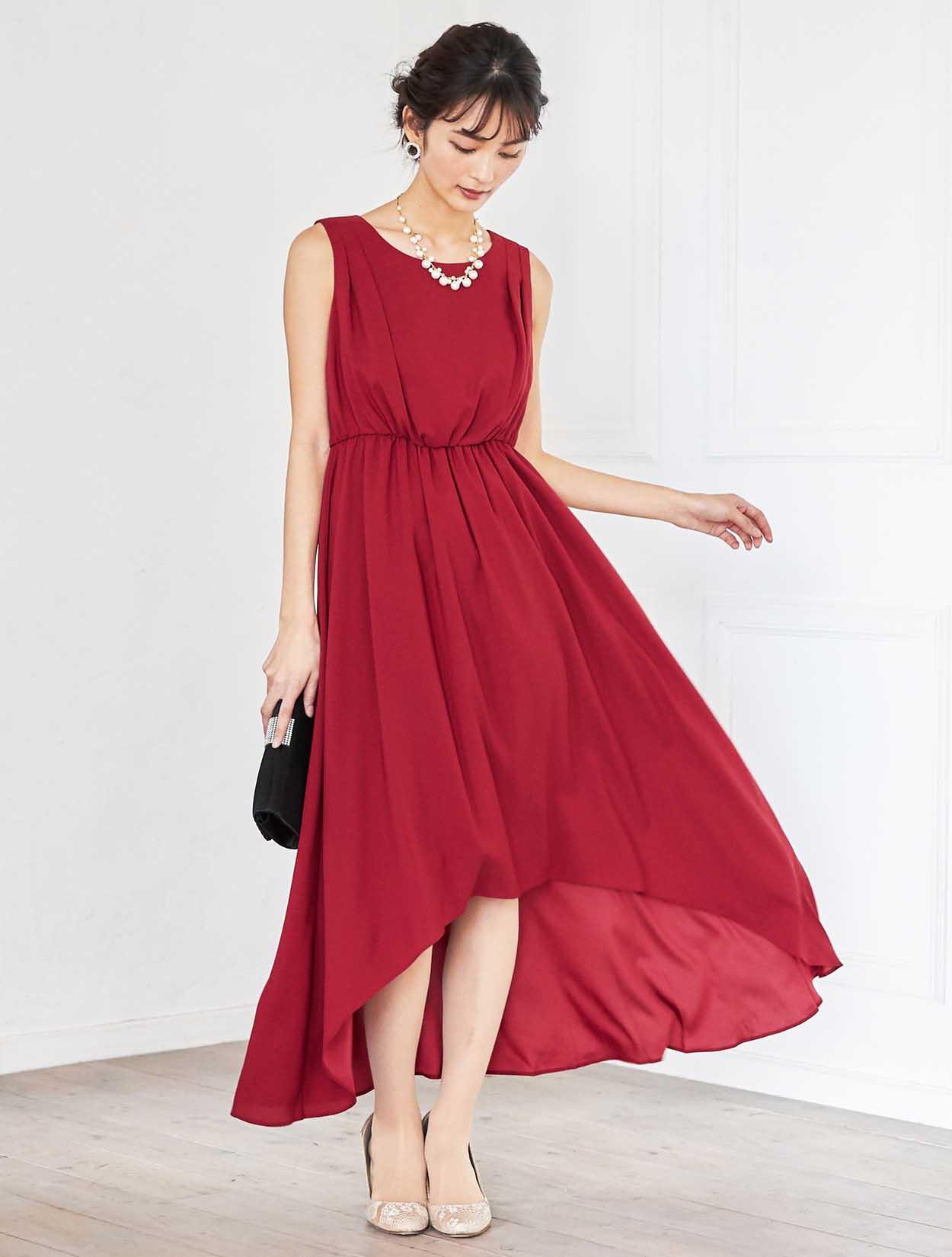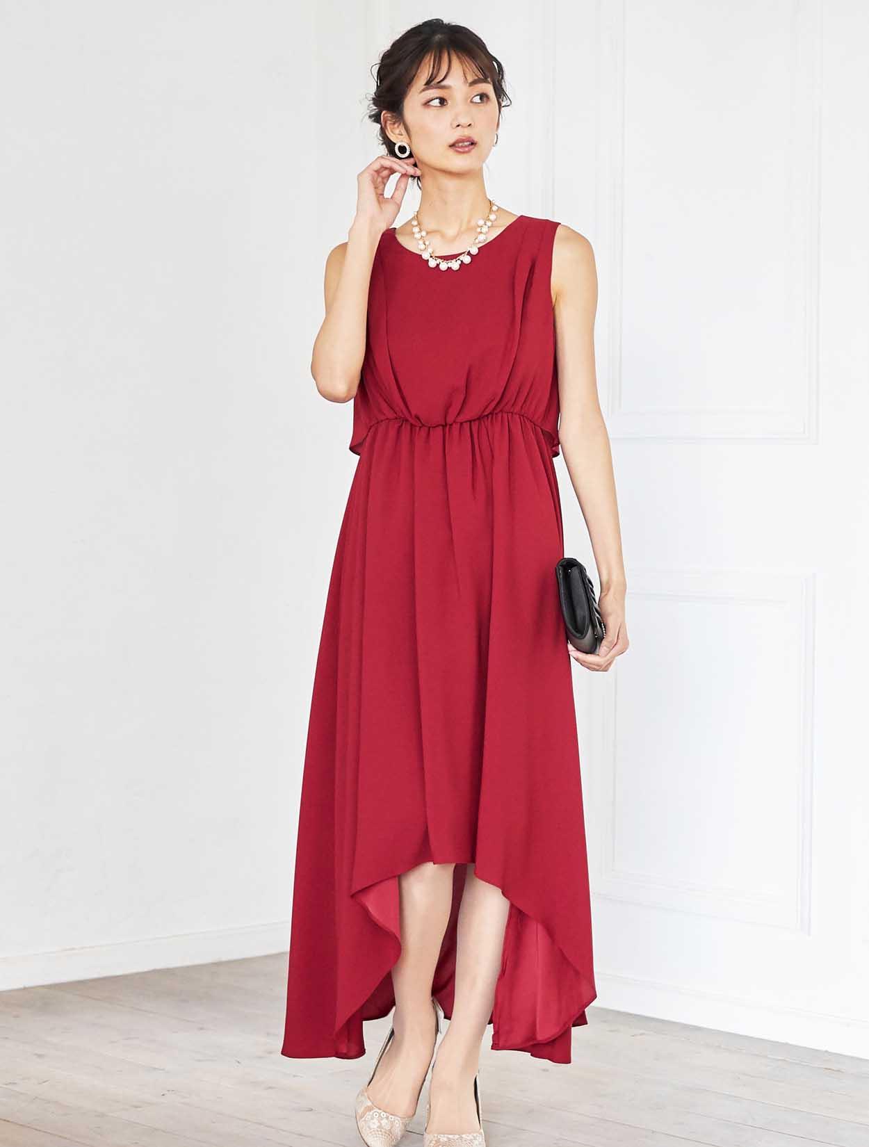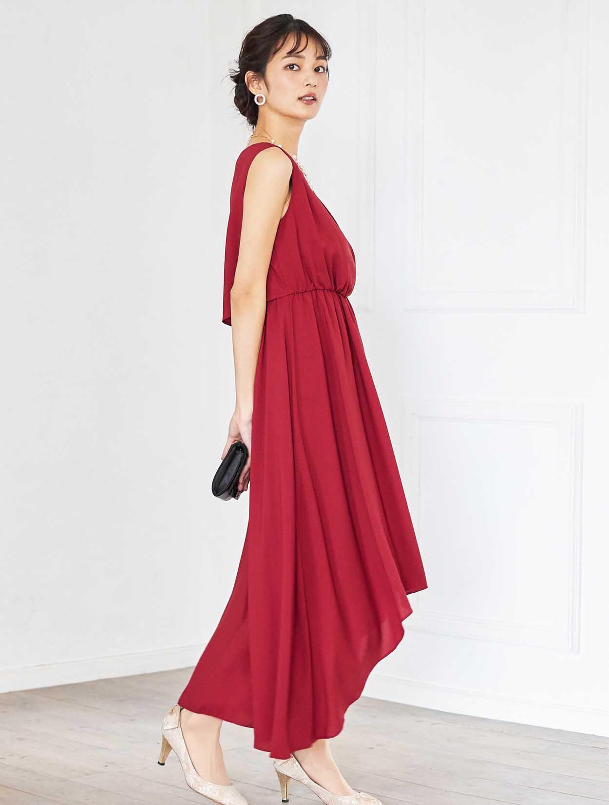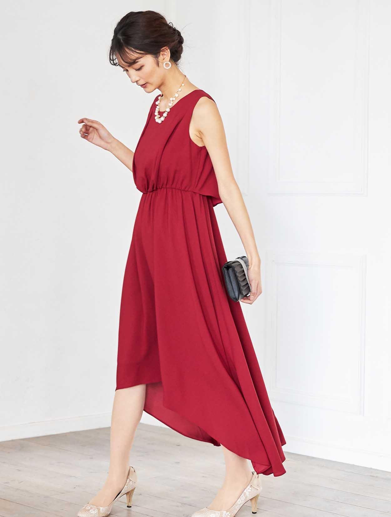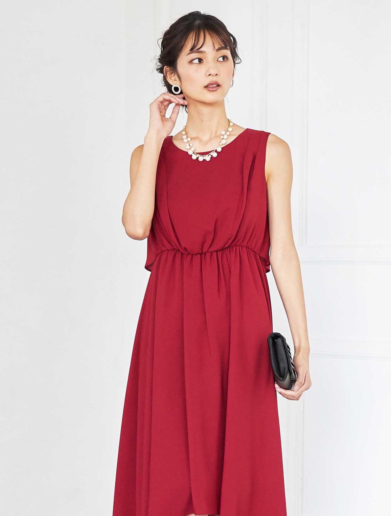 ドラマティックなレッドが華やかなミディ丈ドレス