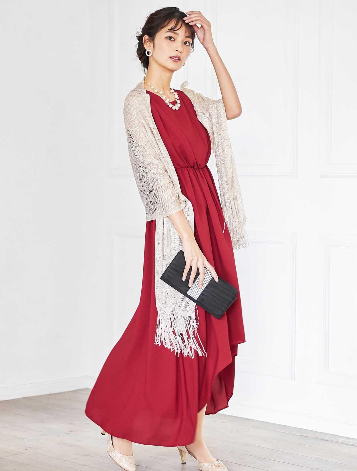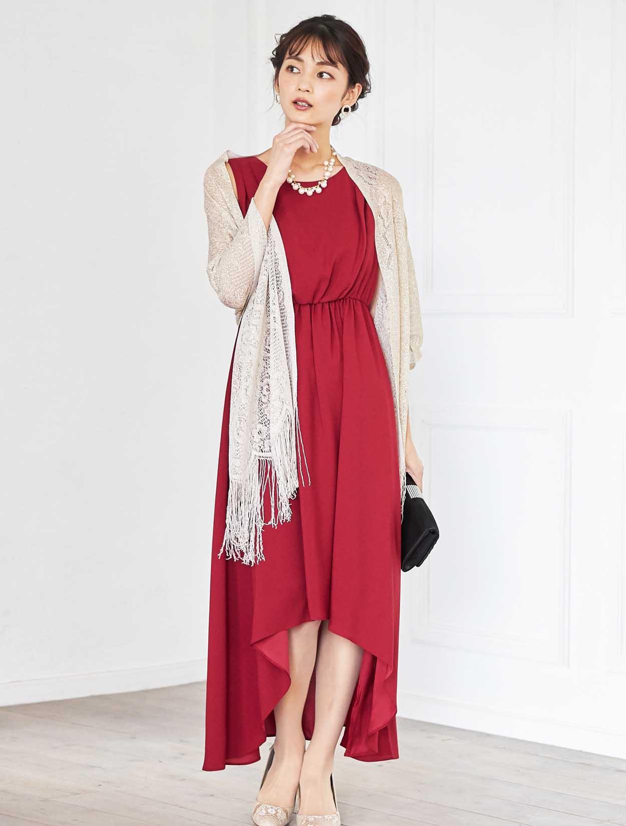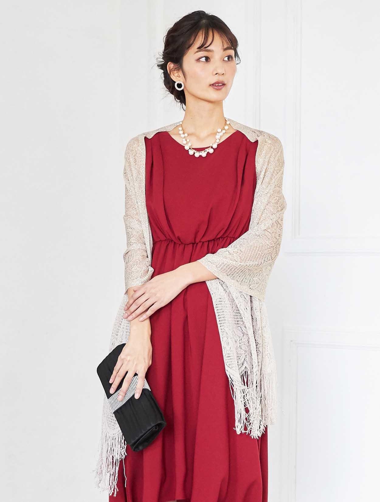 レッドのドレスが挑戦しにくい方でもゴールドベージュのストールと合わせていただくことで