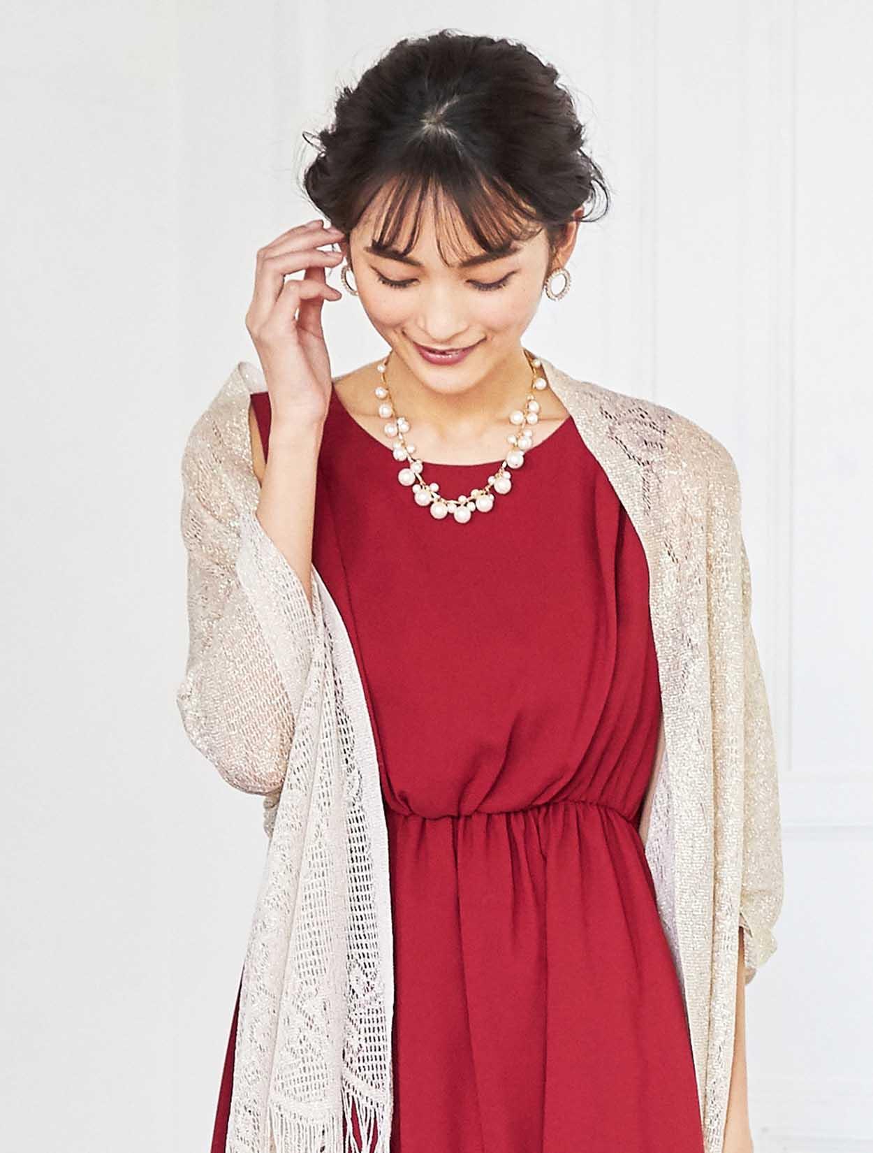 鮮やかなレッドのドレスと柔らかい色味のストールで女性らしいコーディネート。