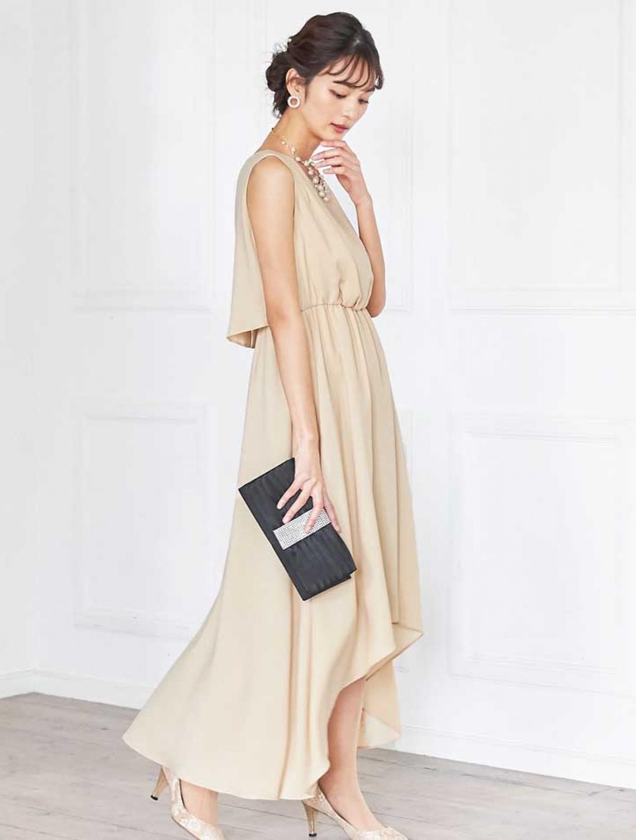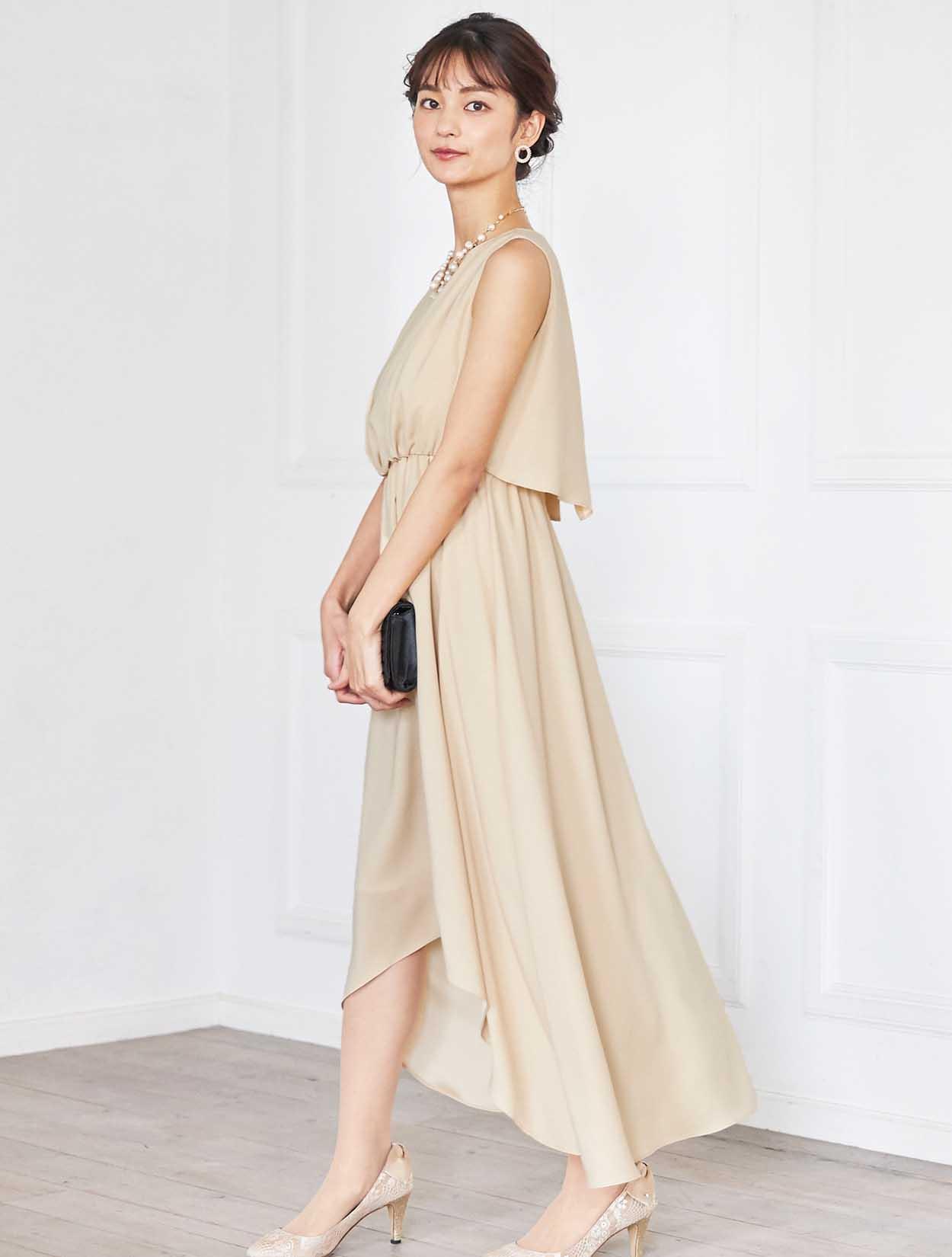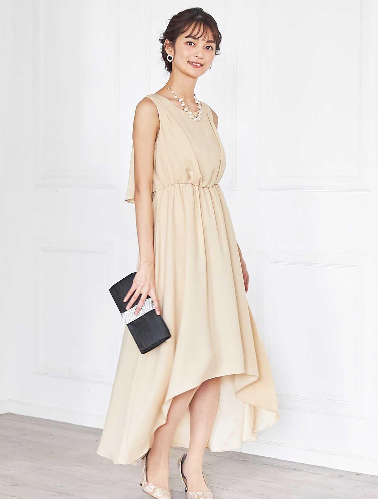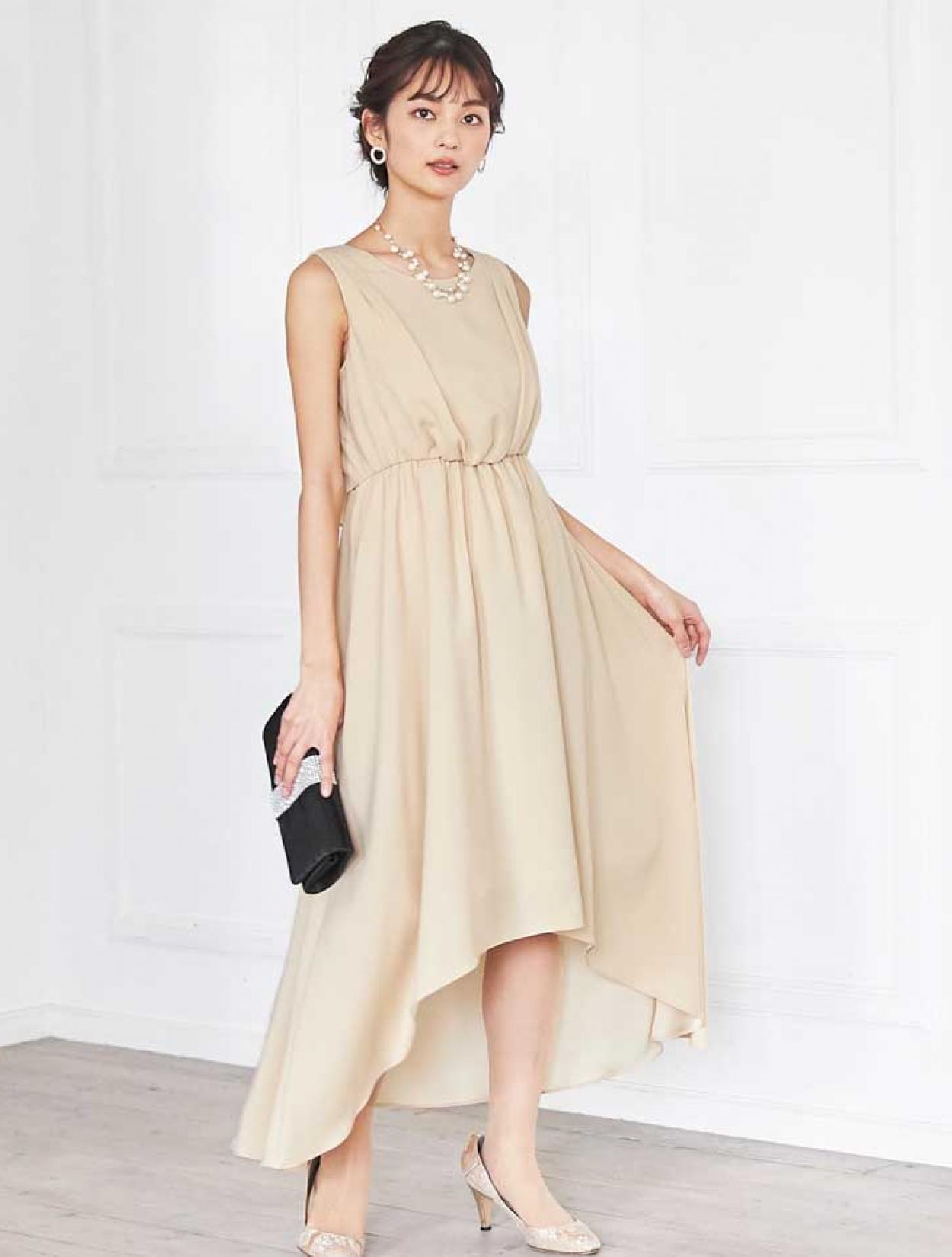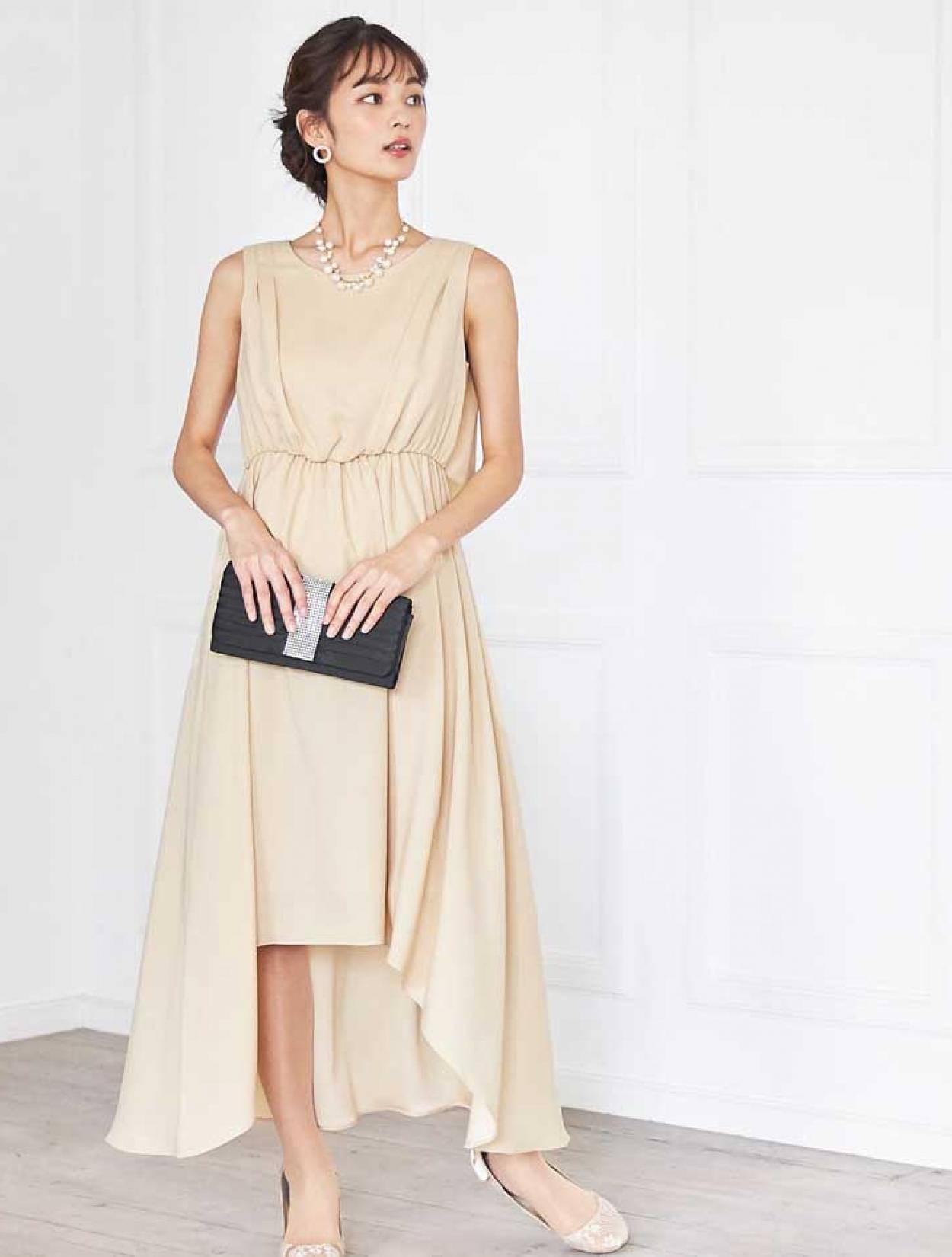 イエローがかった明るいベージュはトレンド感たっぷり。レンタルドレスならではのカラーです。
