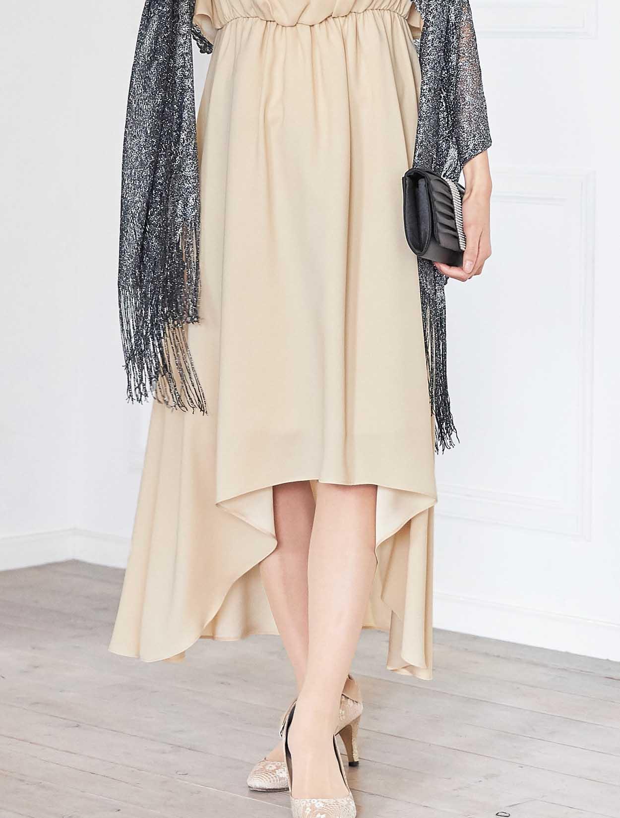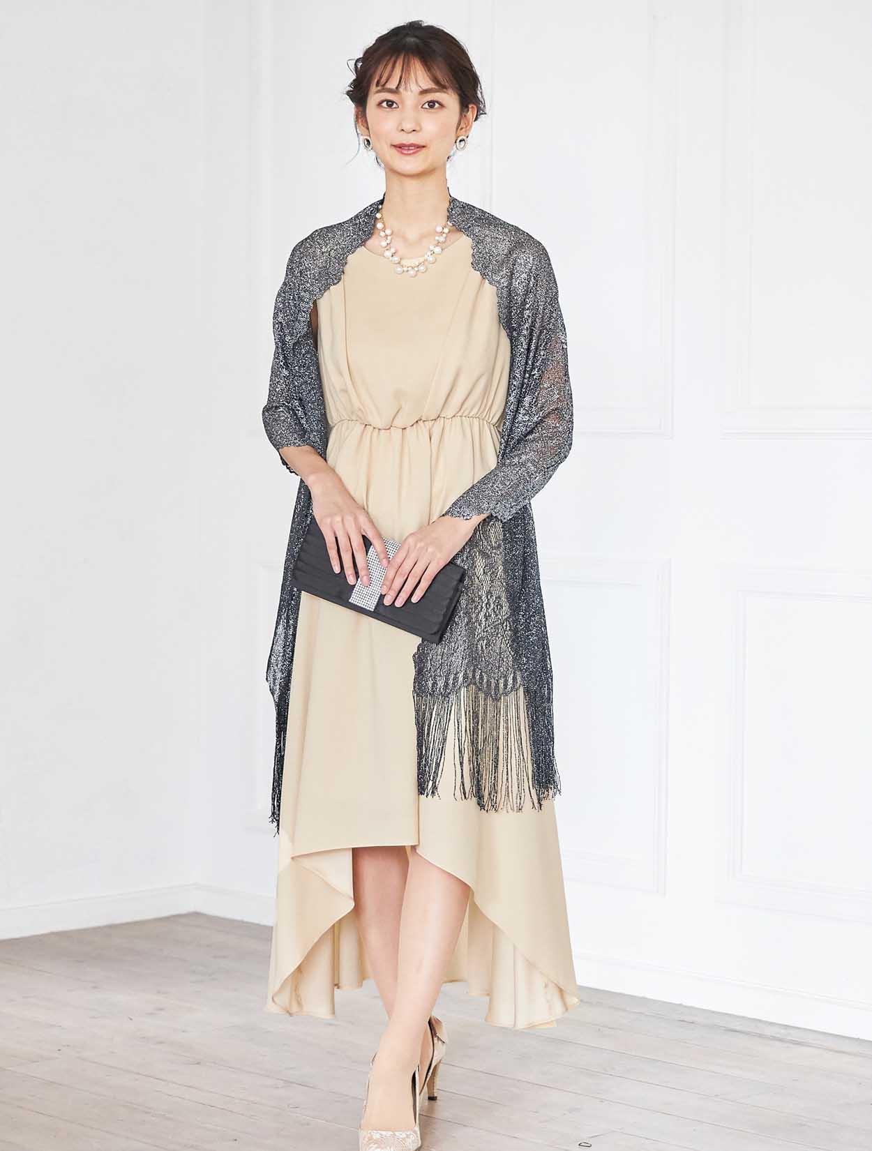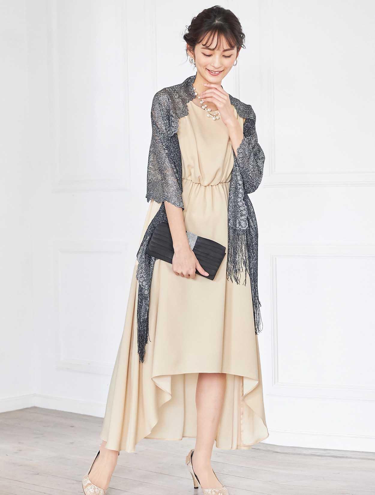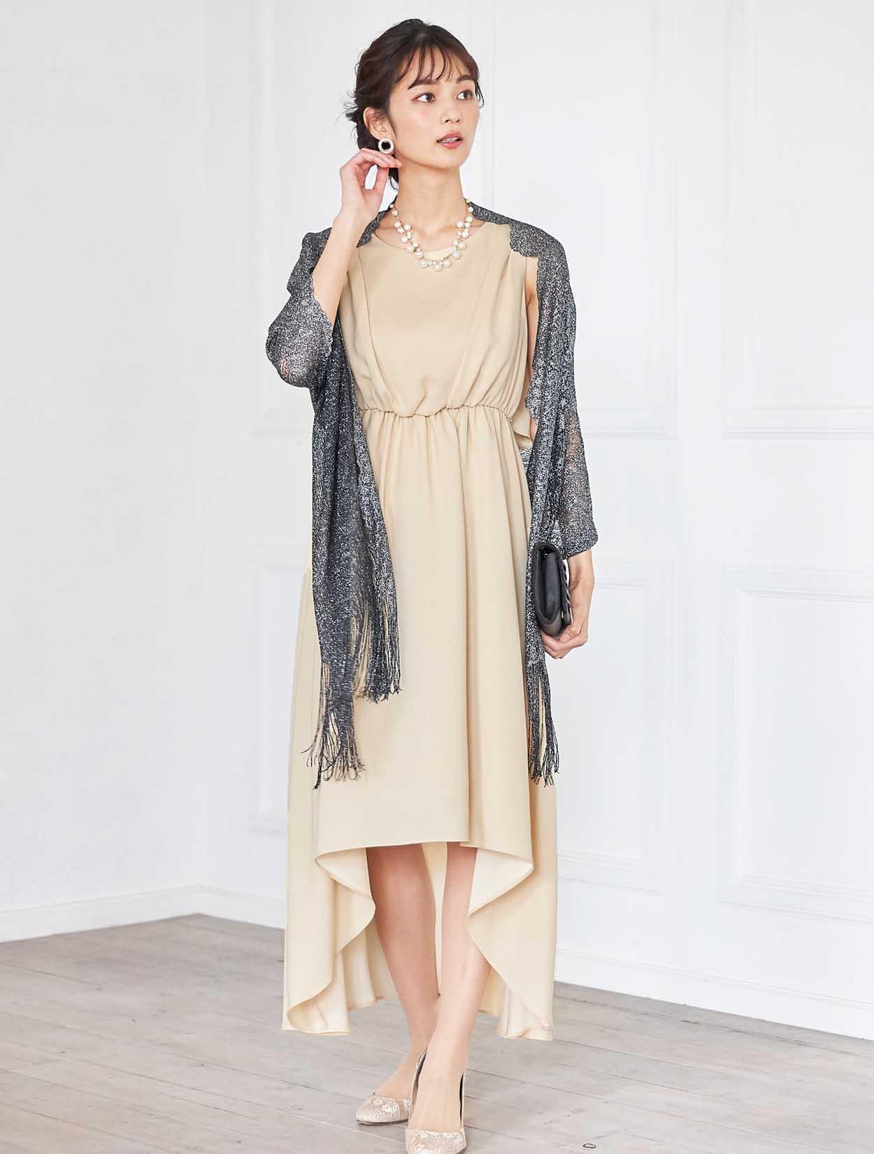 イエローがかった明るいベージュはトレンド感たっぷり。レンタルドレスならではのカラーです。