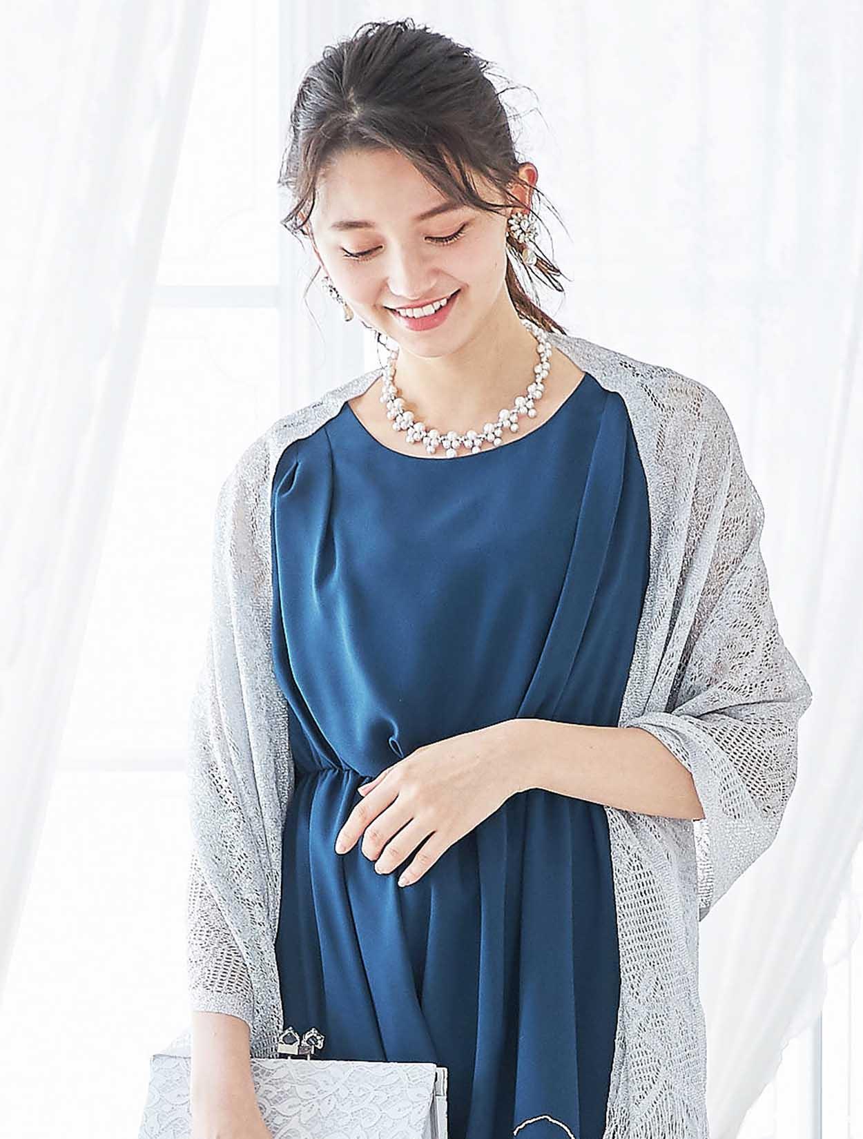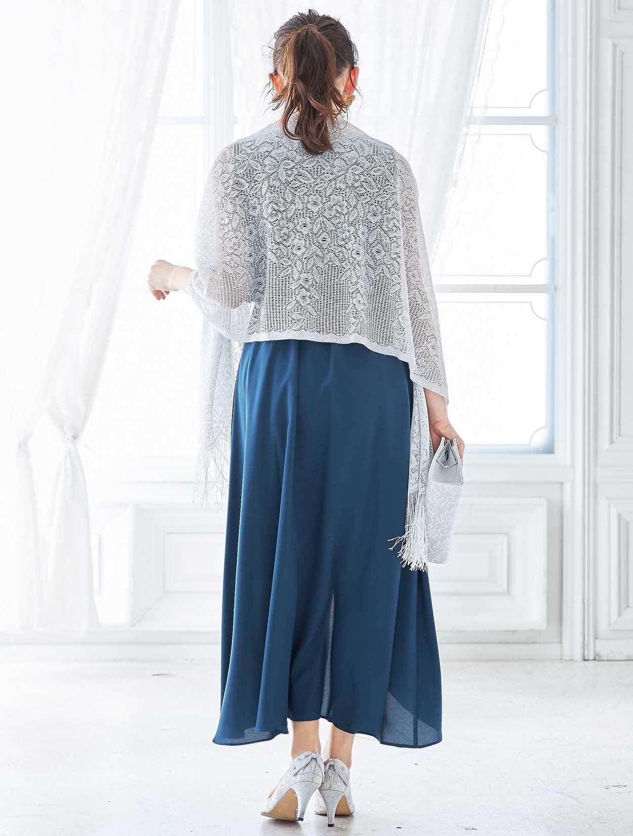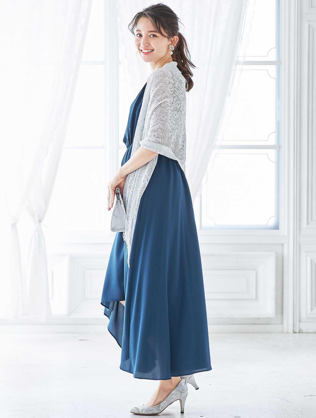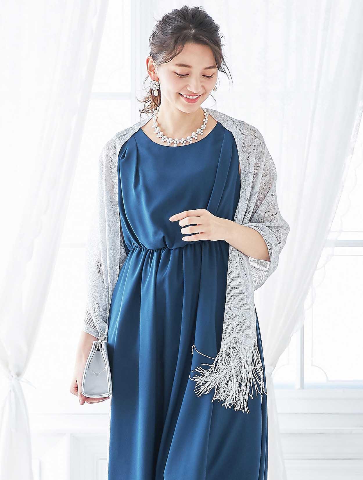 シルバーのショールがくすみブルーのドレスを華やかにコーディネート。