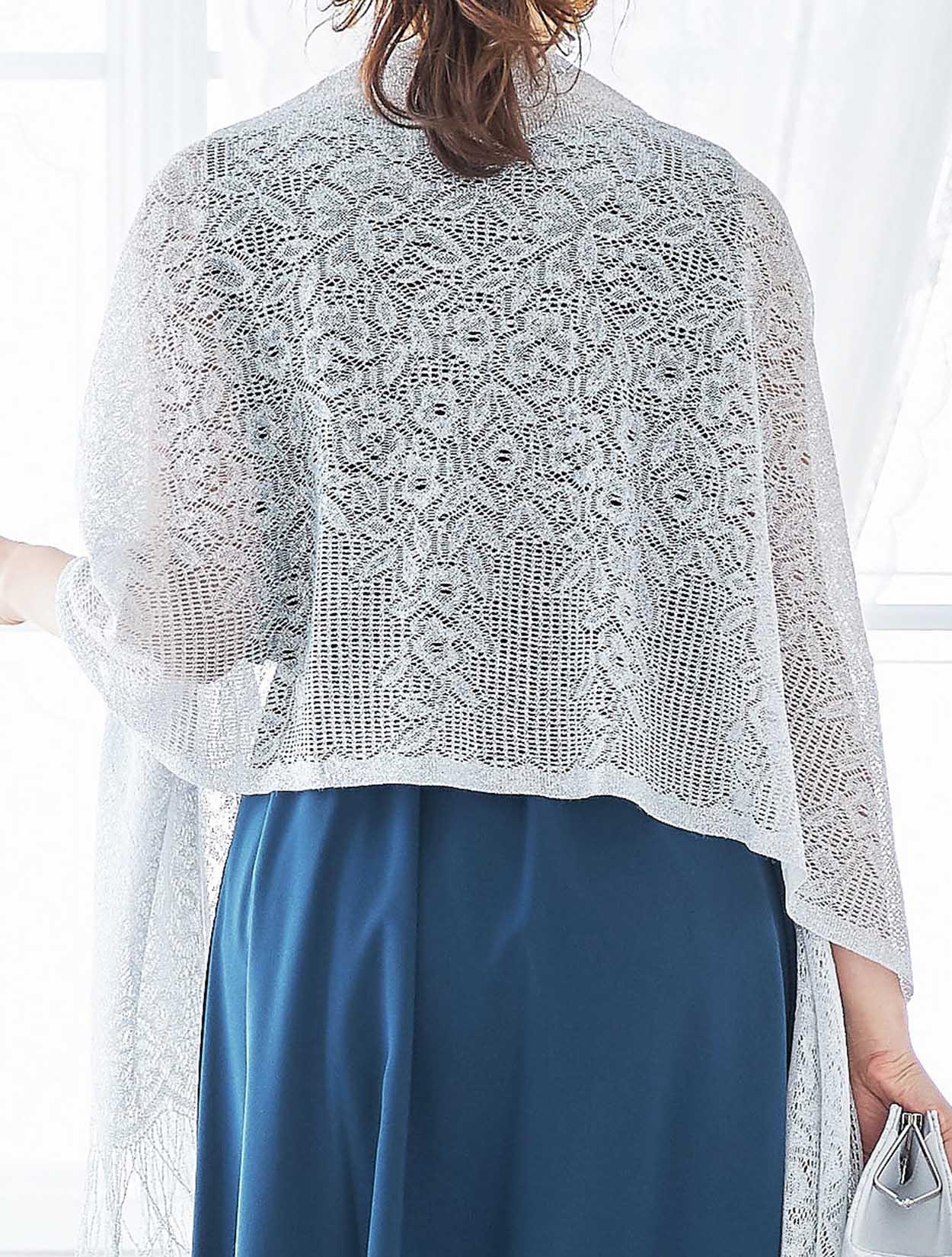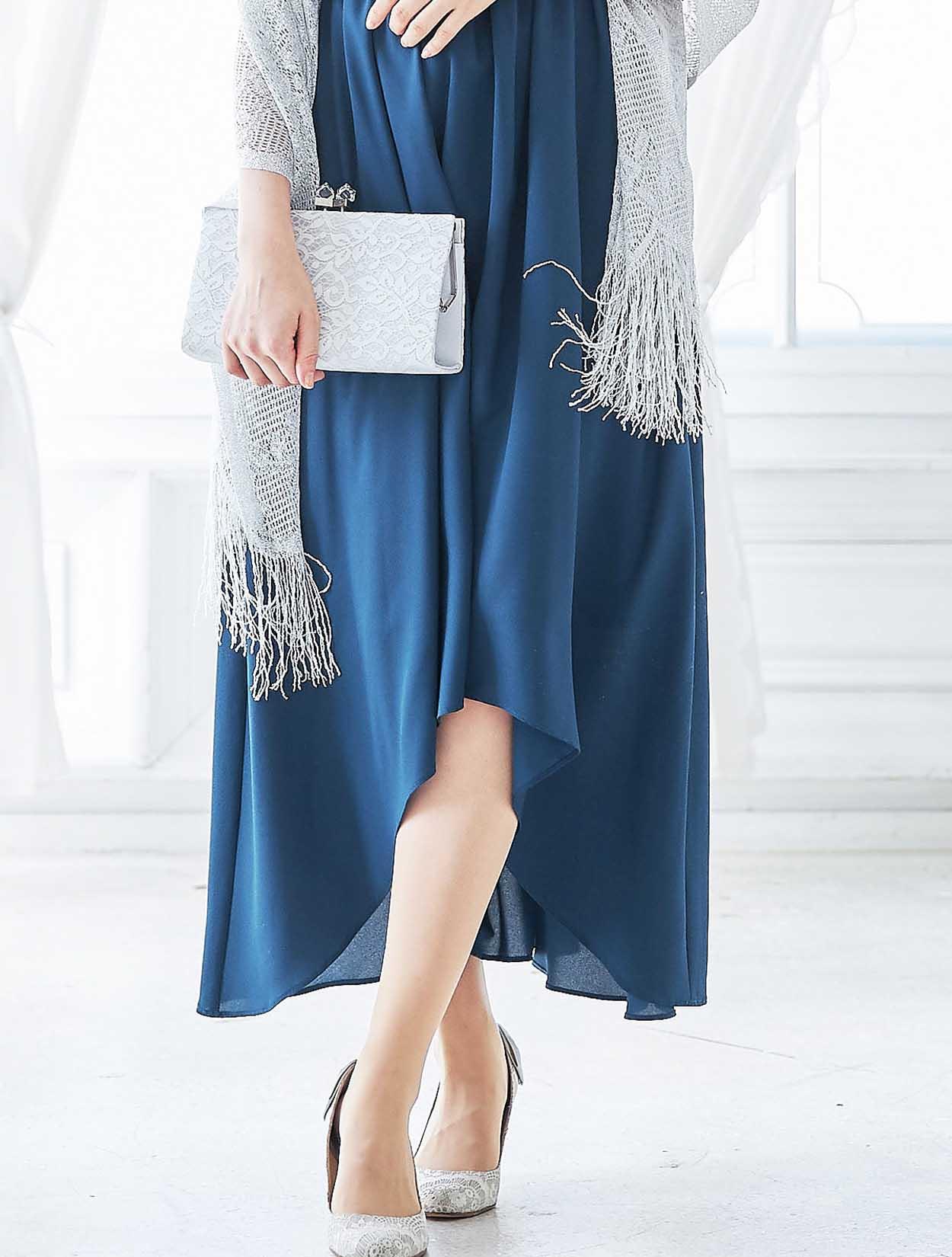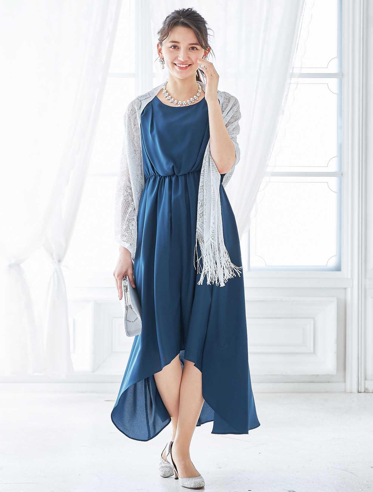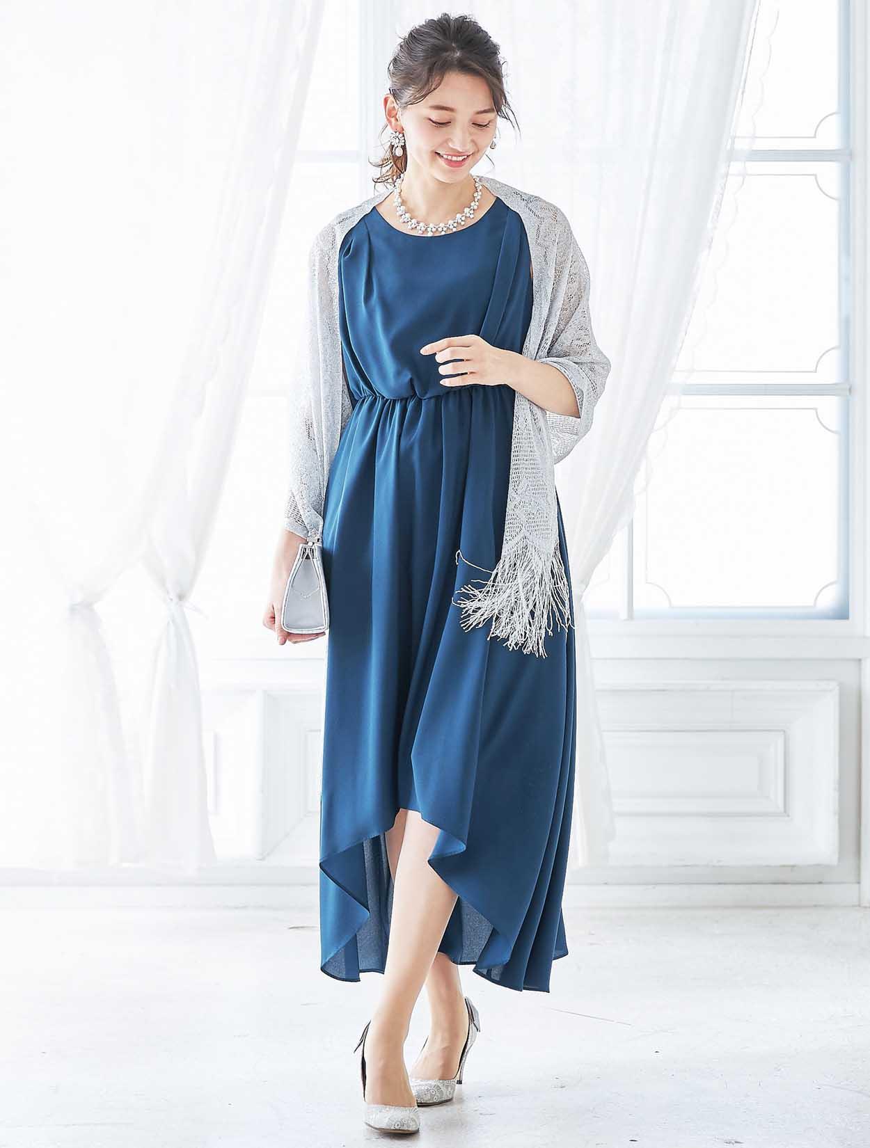 シルバーのショールがくすみブルーのドレスを華やかにコーディネート。