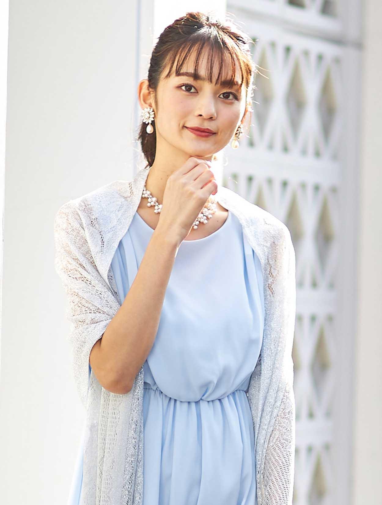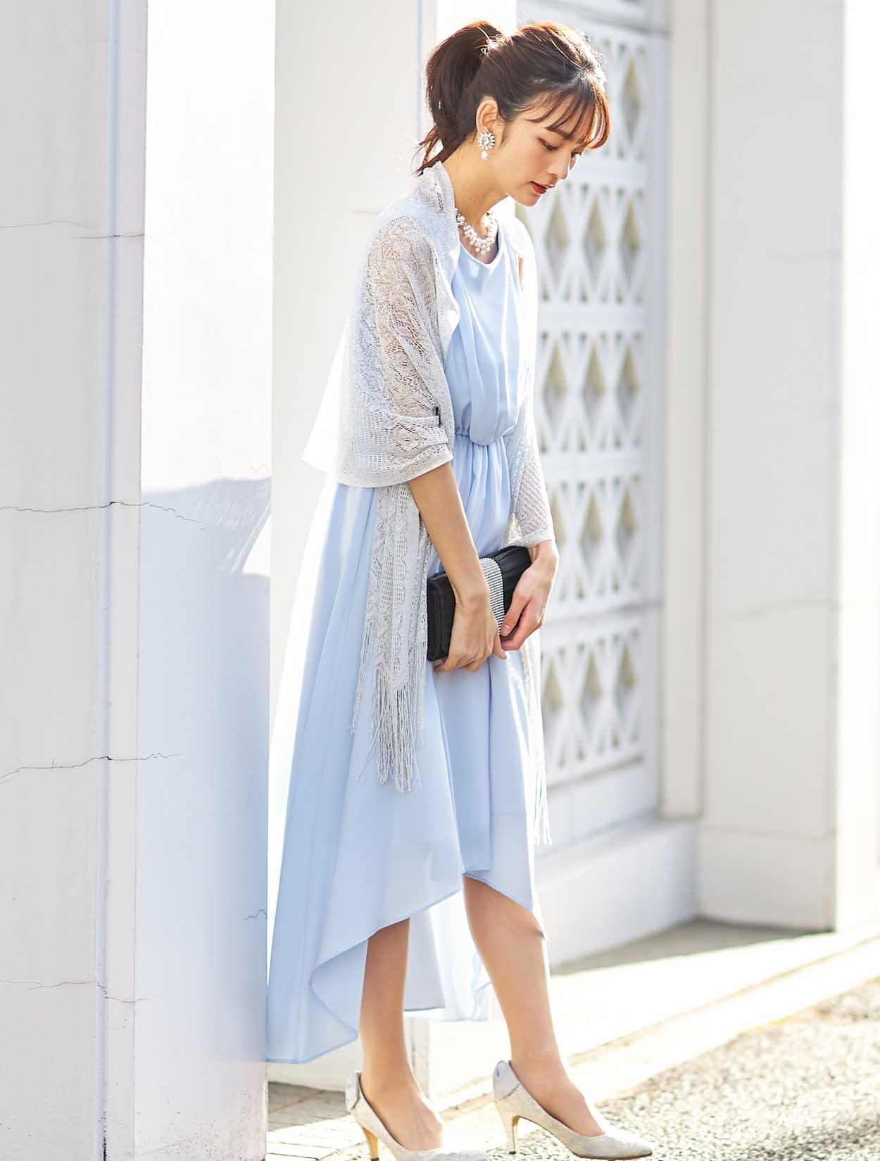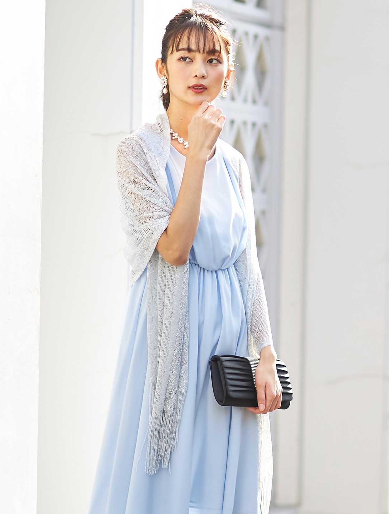爽やかでエアリー感漂うサックスブルーは是非レンタルで挑戦してほしい一着。春夏に特に人気のカラーです。