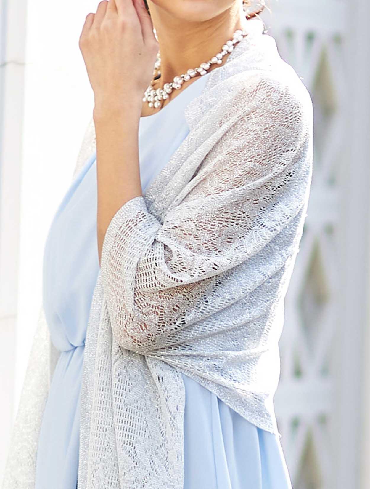 華やなかなシルバーのショールを合わせた爽やかなコーディネート。
