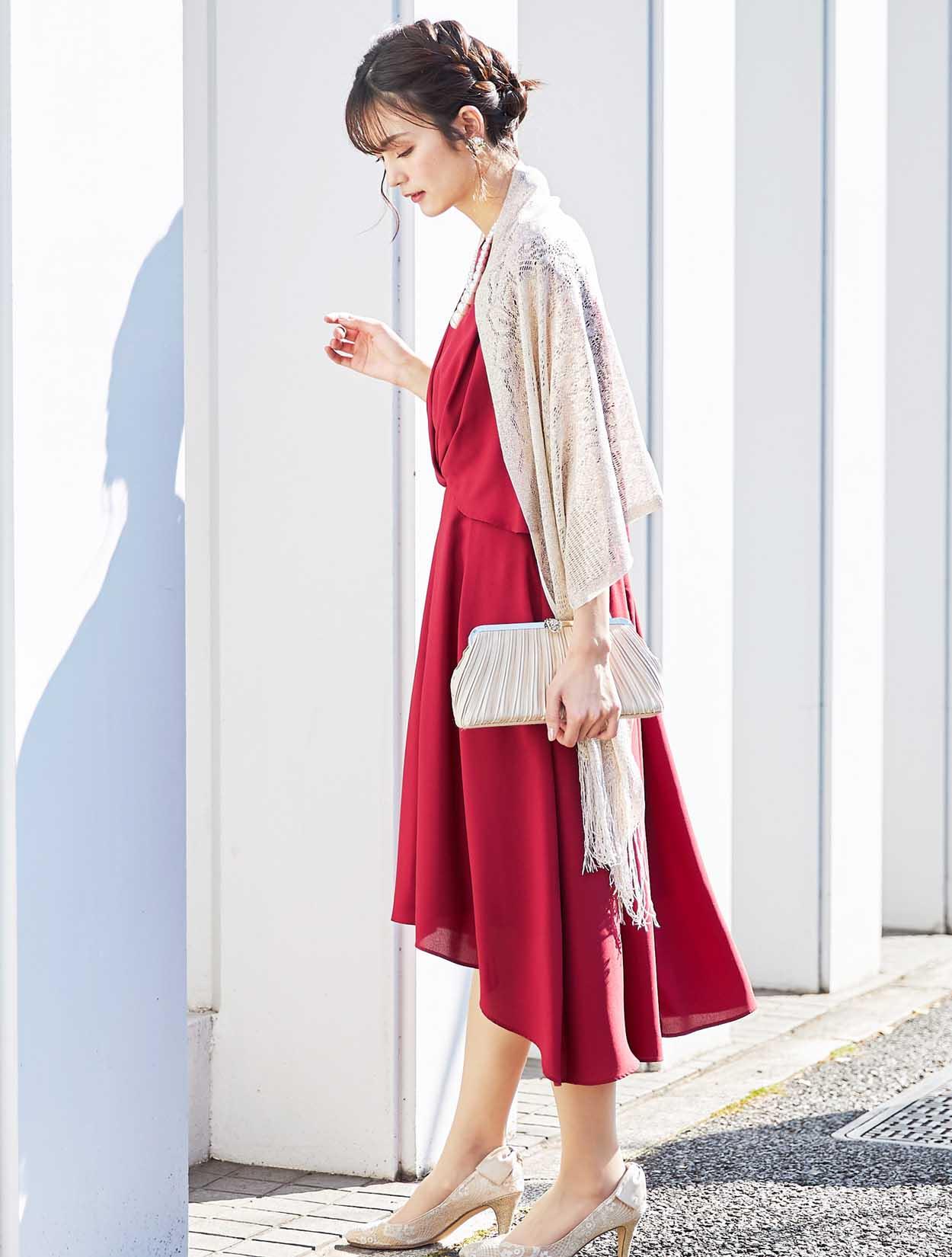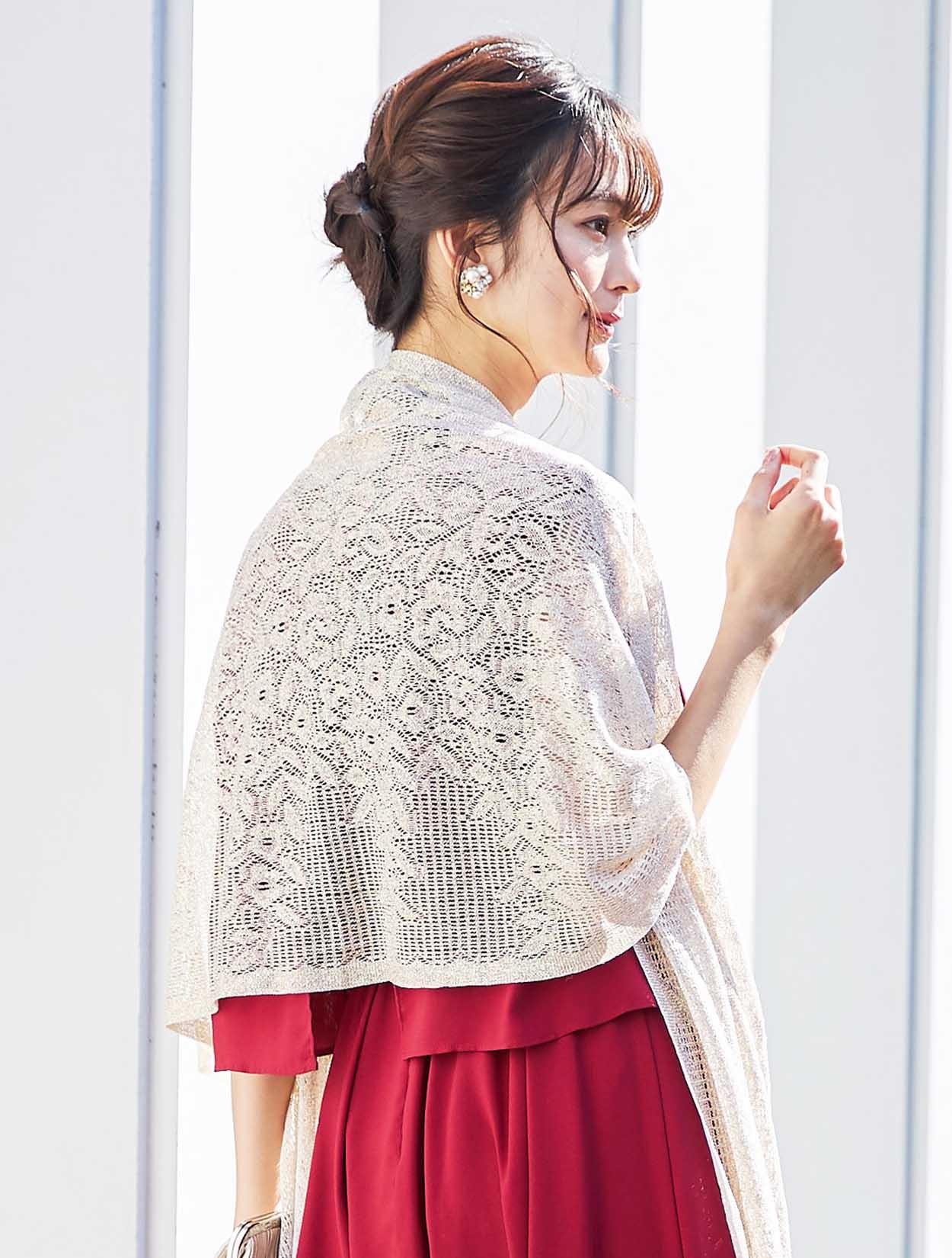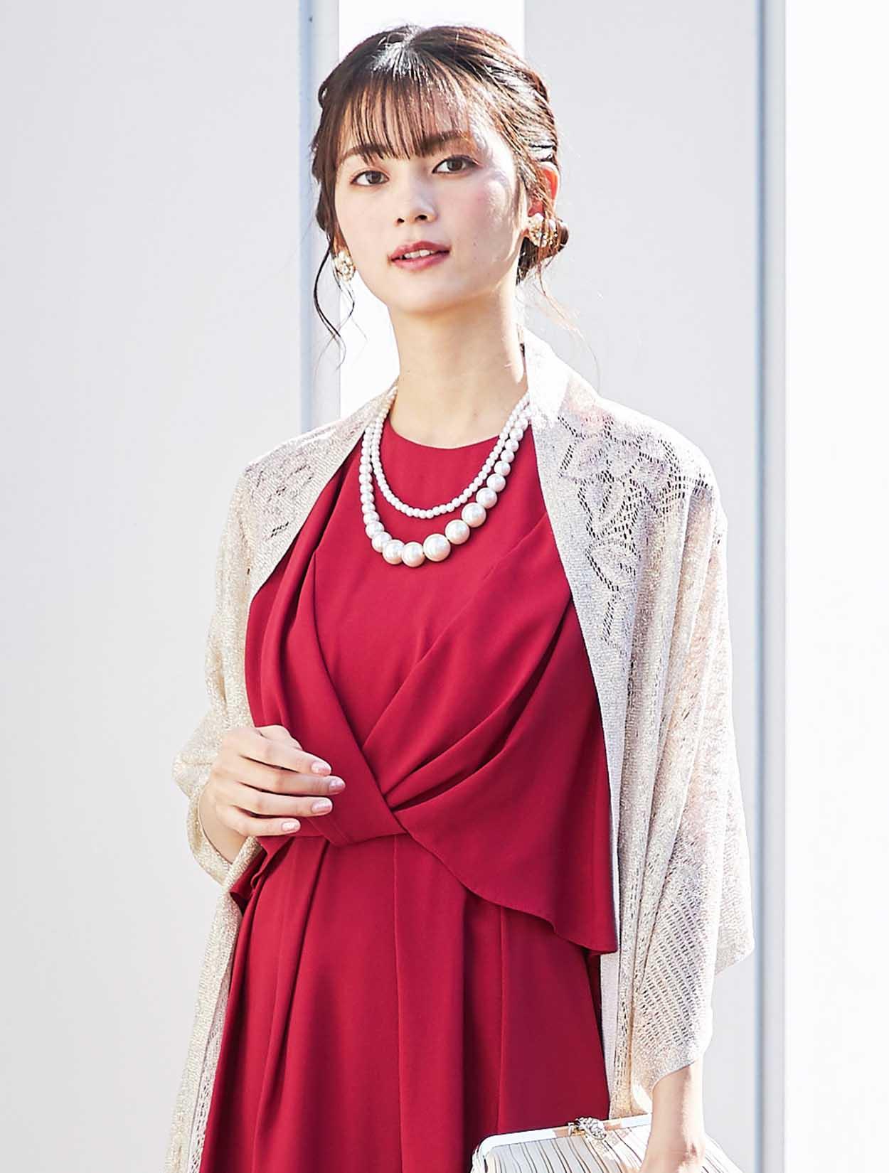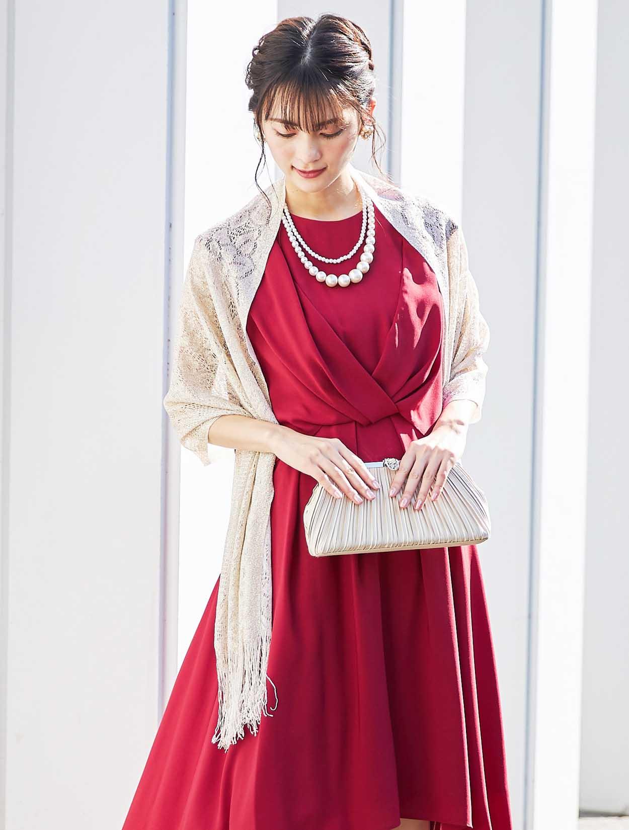 上品なラメ感のゴールドショールがレッドカラーによく合う華やかなパーティースタイル。