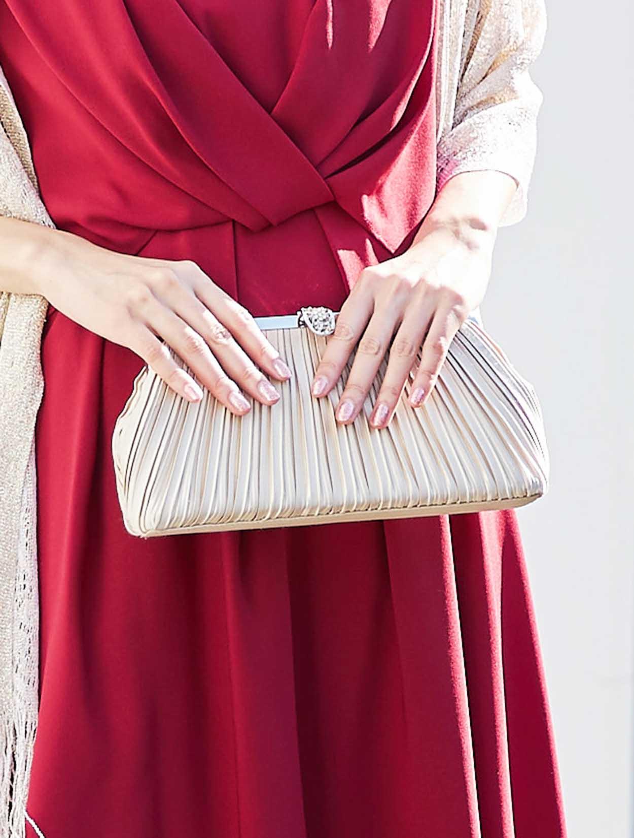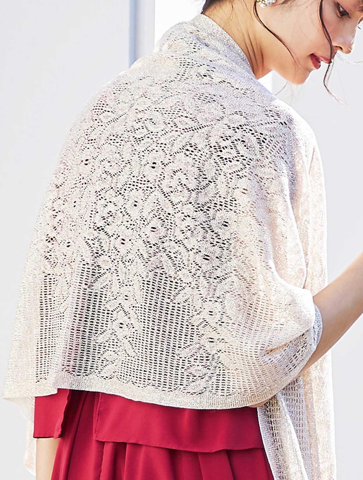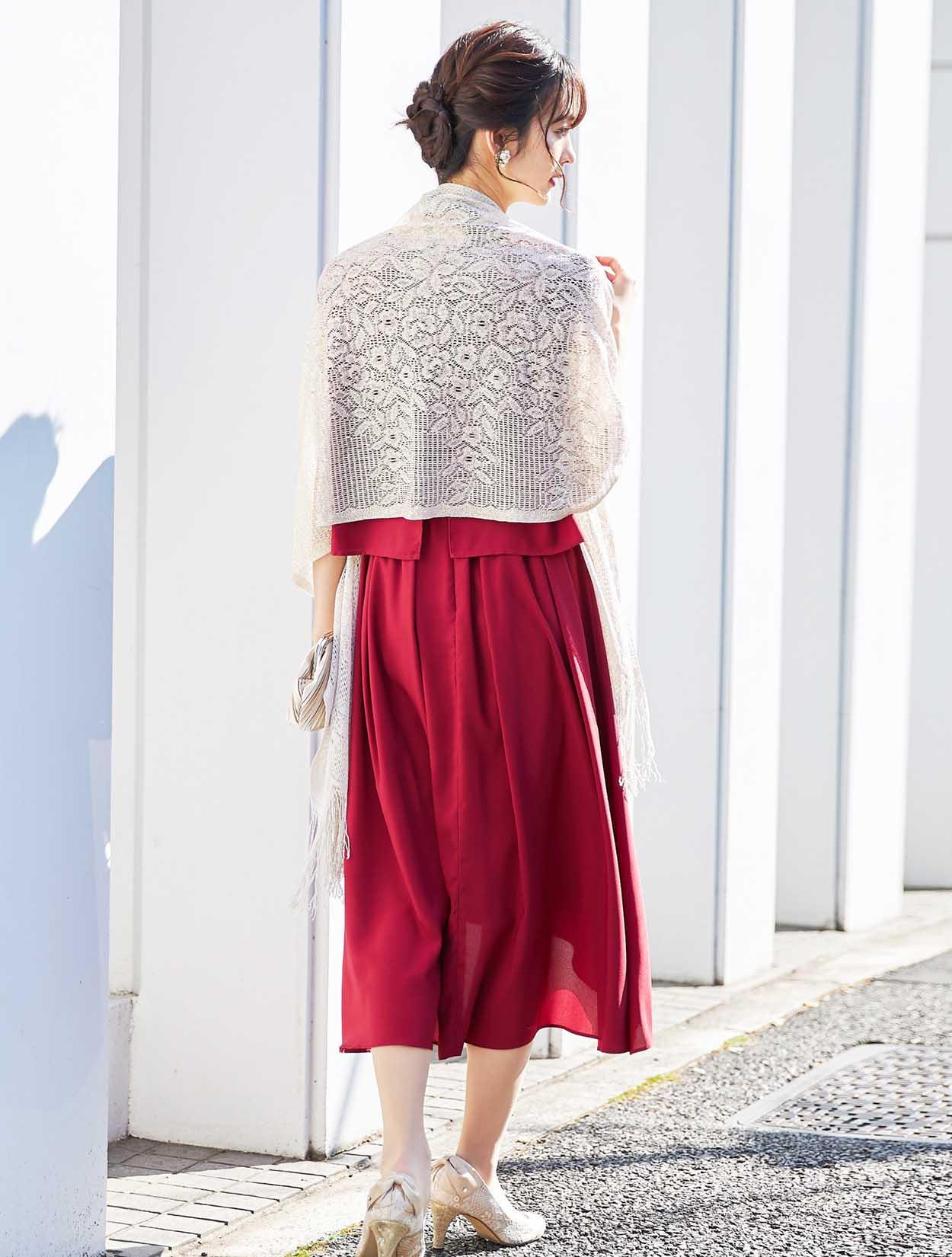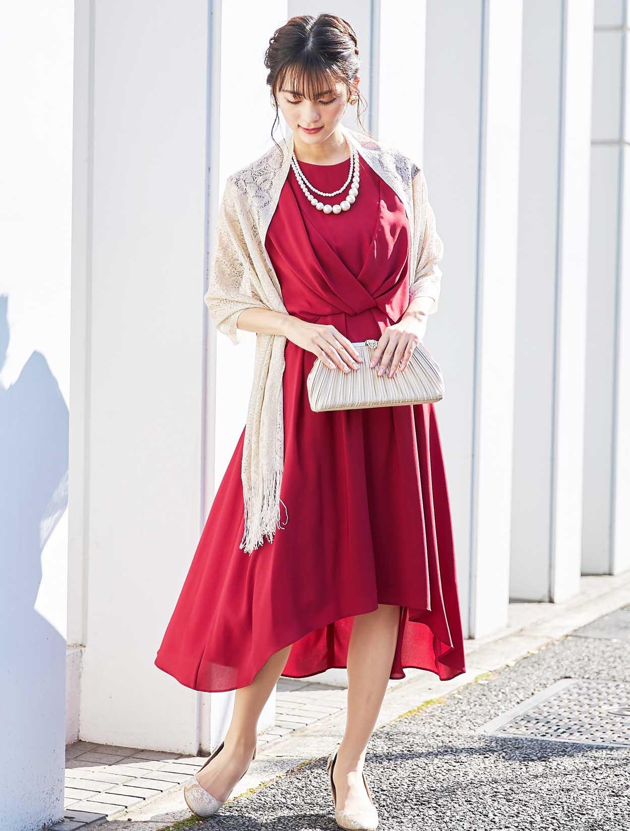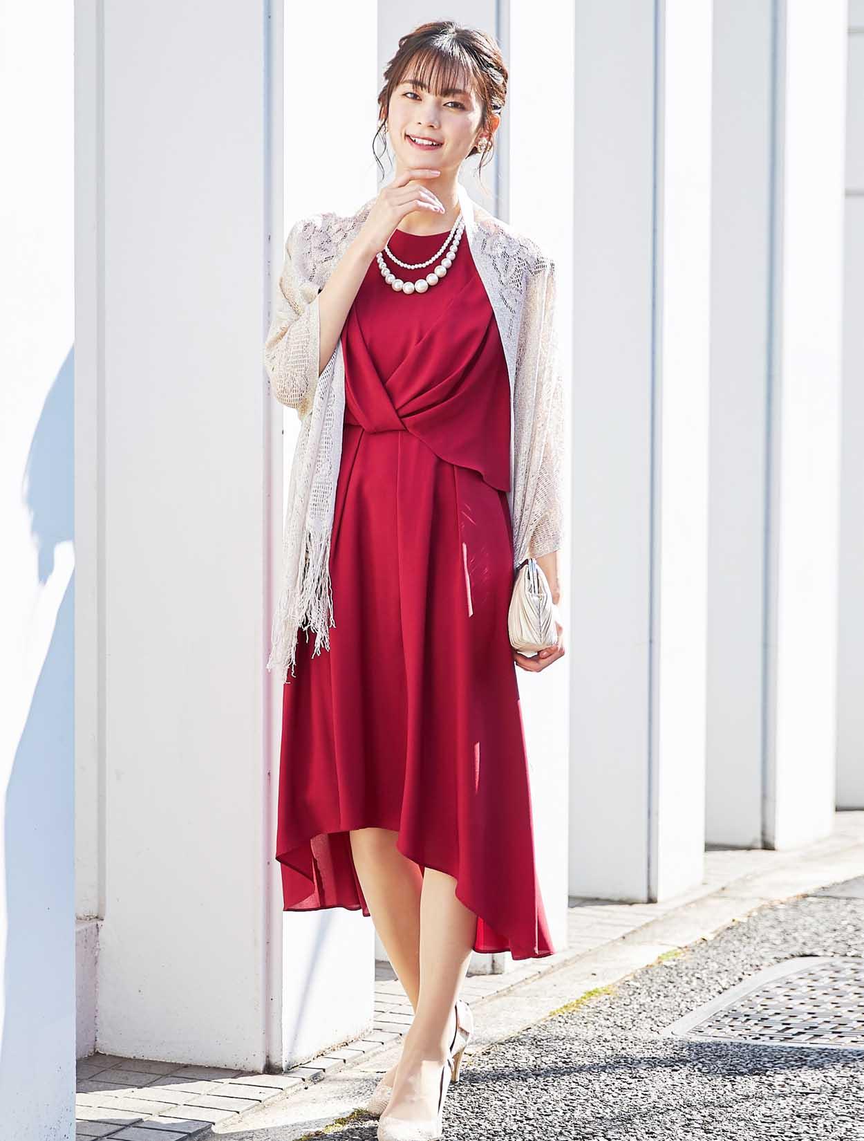 上品なラメ感のゴールドショールがレッドカラーによく合う華やかなパーティースタイル。