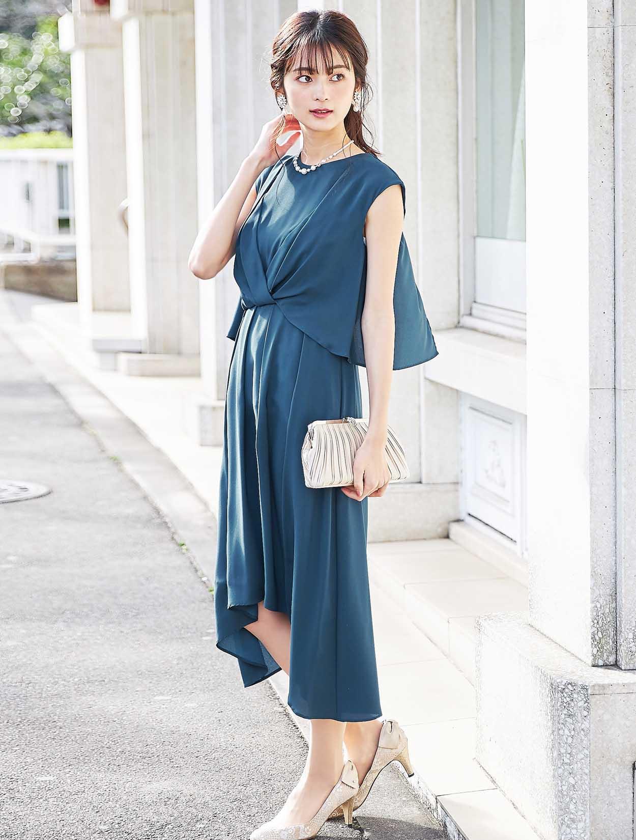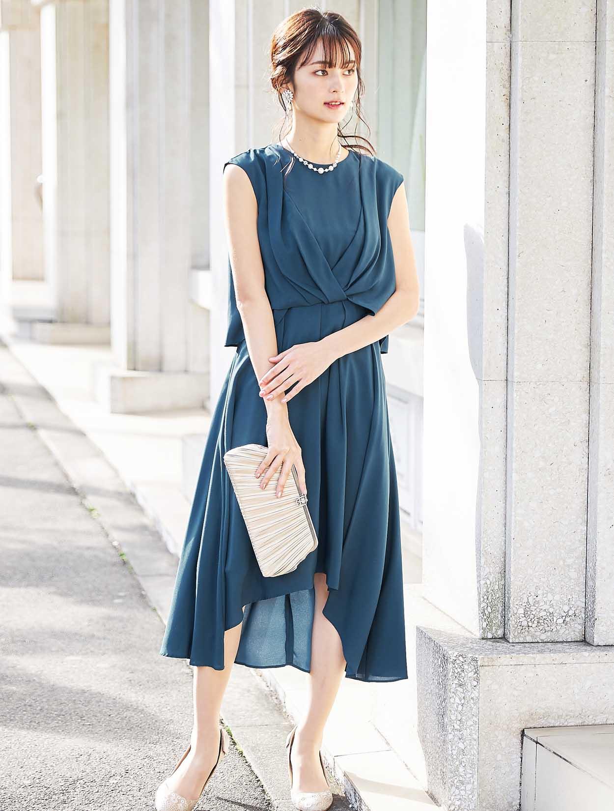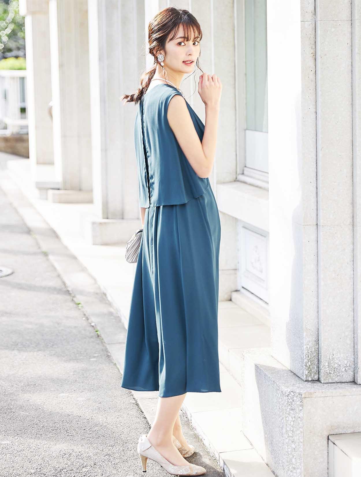 クロスされたウエストがポイントのシンプルミディ丈ドレス