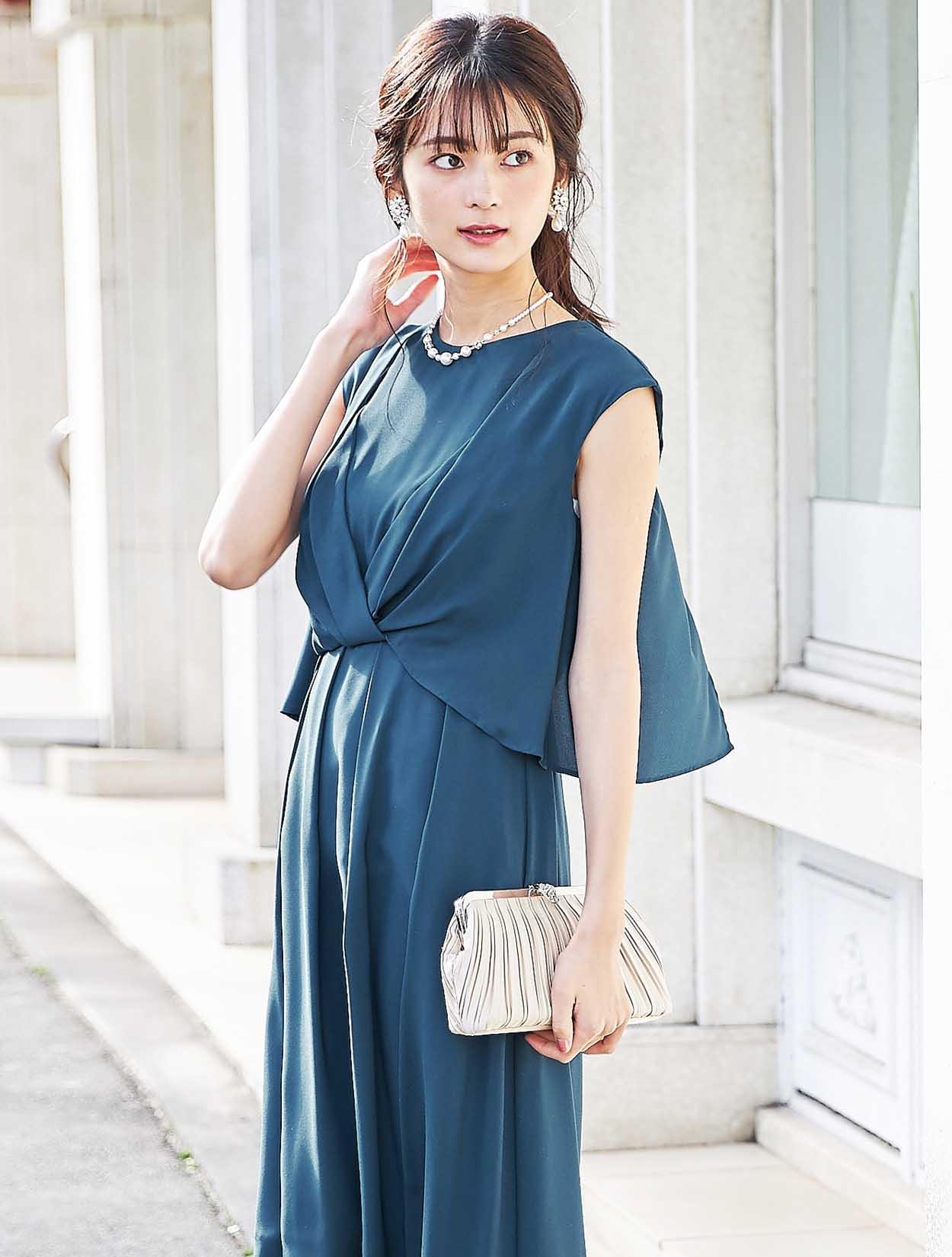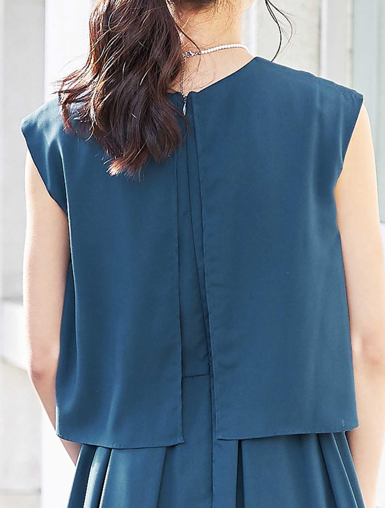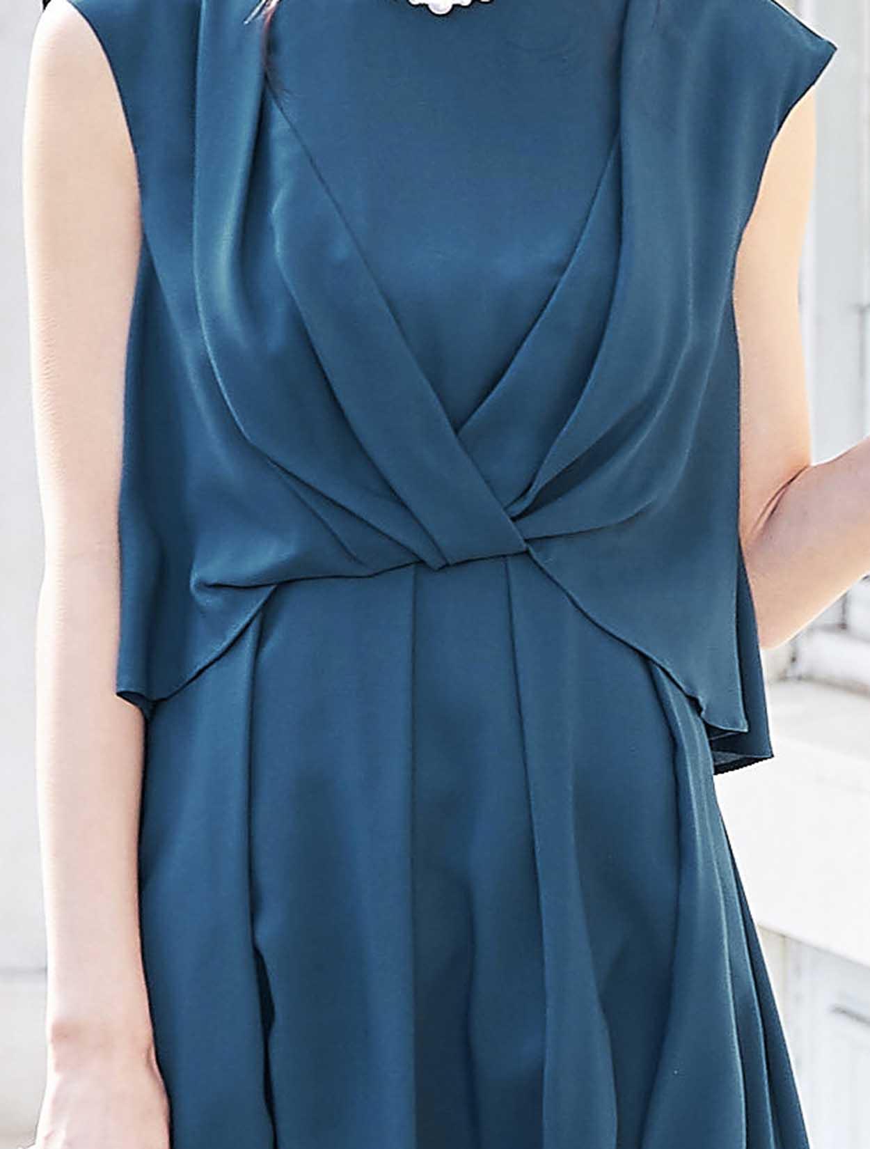 ウエストでクロスされたデザインとフワッとしたブラウスの様なトップスがさり気なくウエスト周りをカバー。ネックラインは開き過ぎない安心のカッティング。