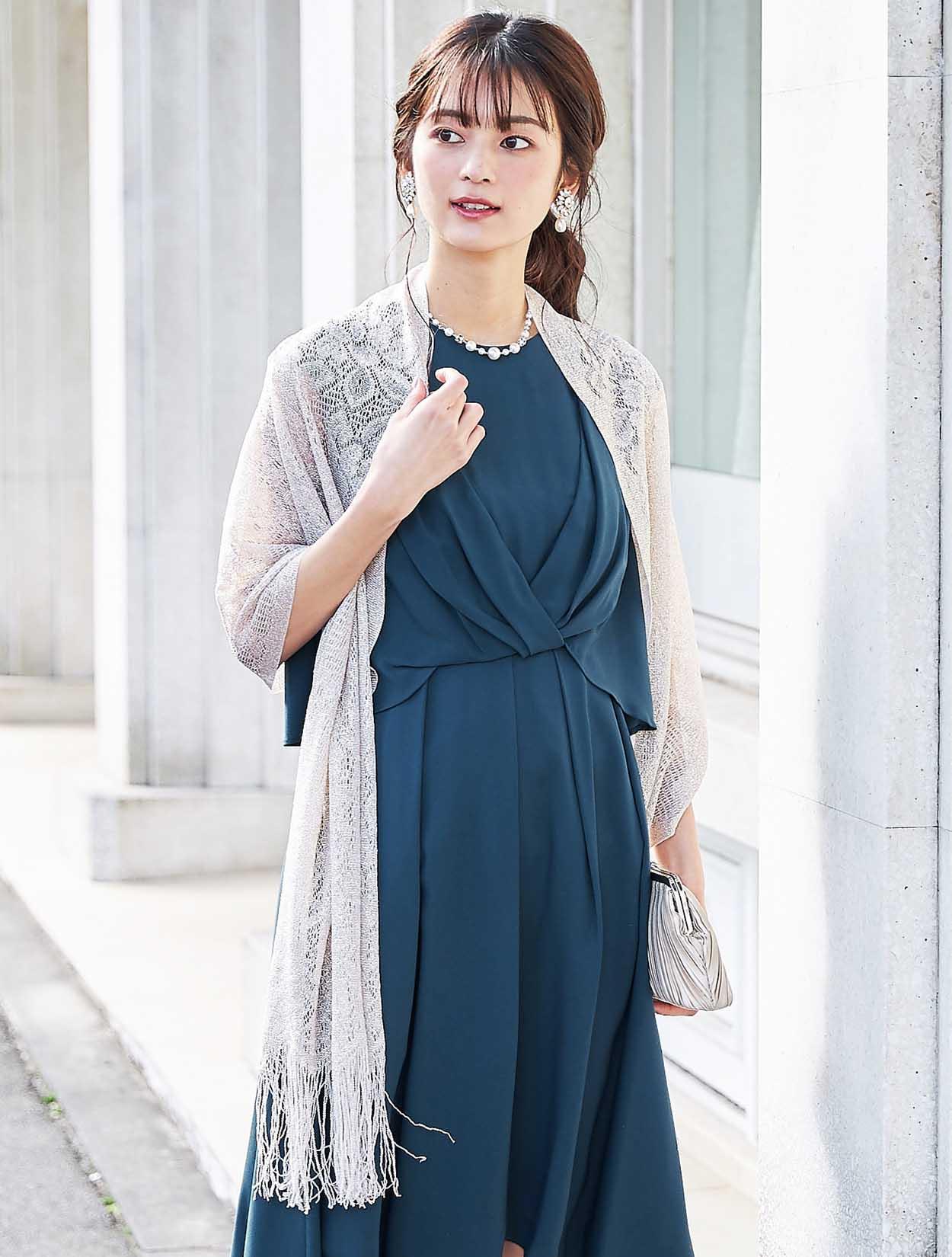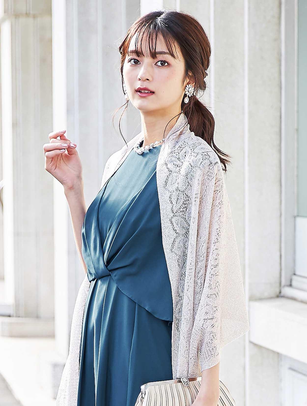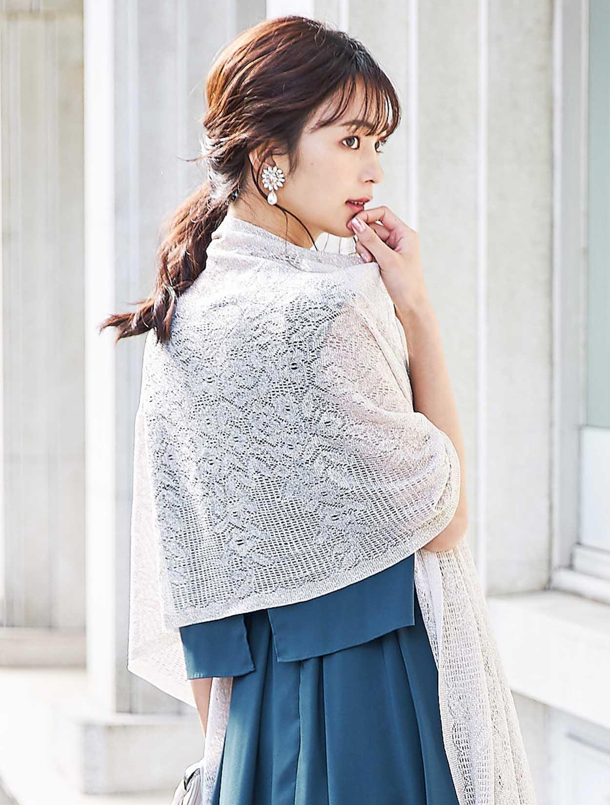 くすみカラーでのパーティーシーンには、ラメ入りの華やかなショールを合わせて華やかに。