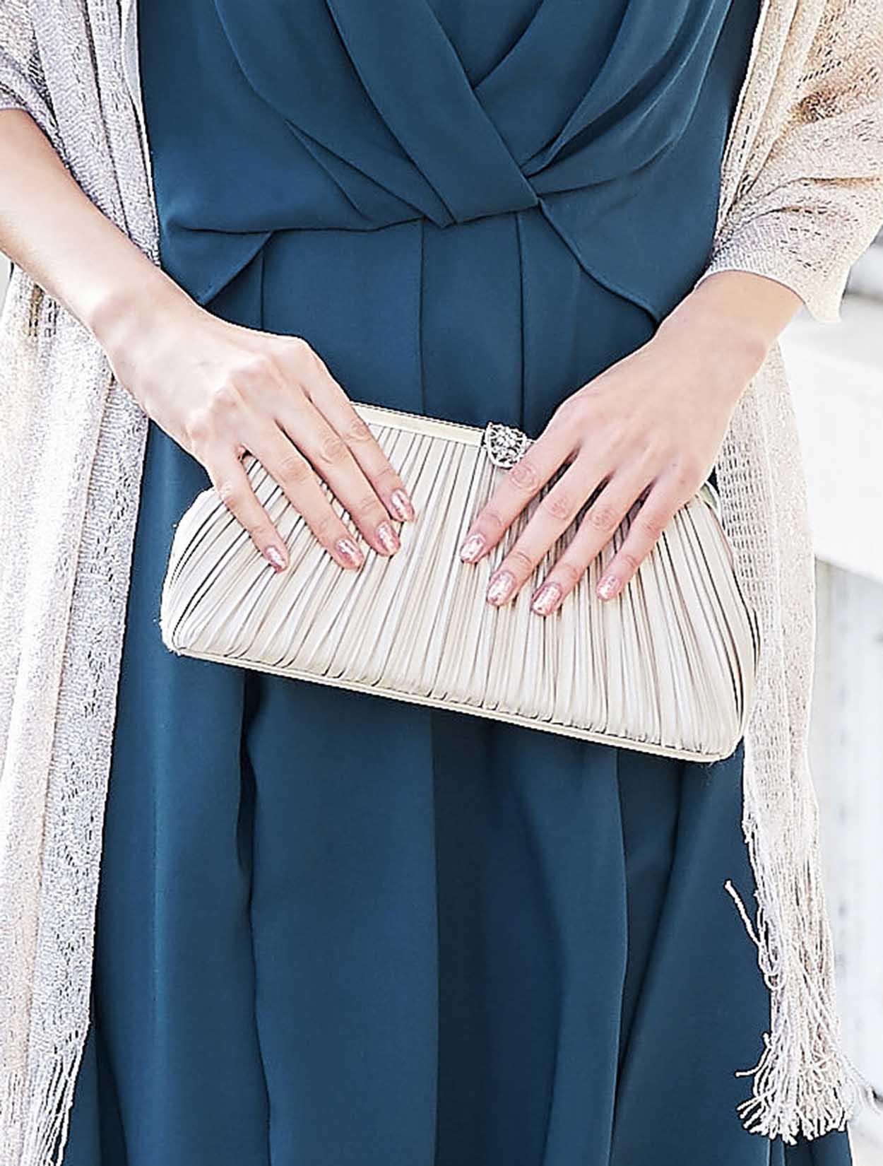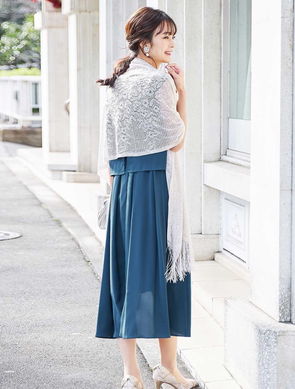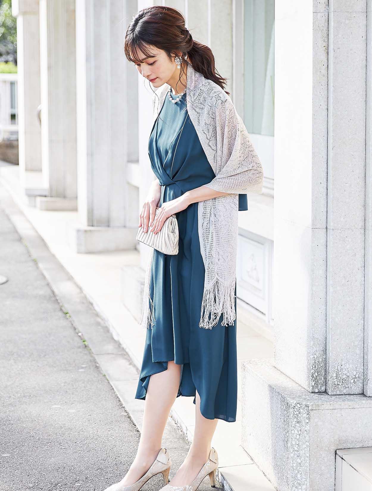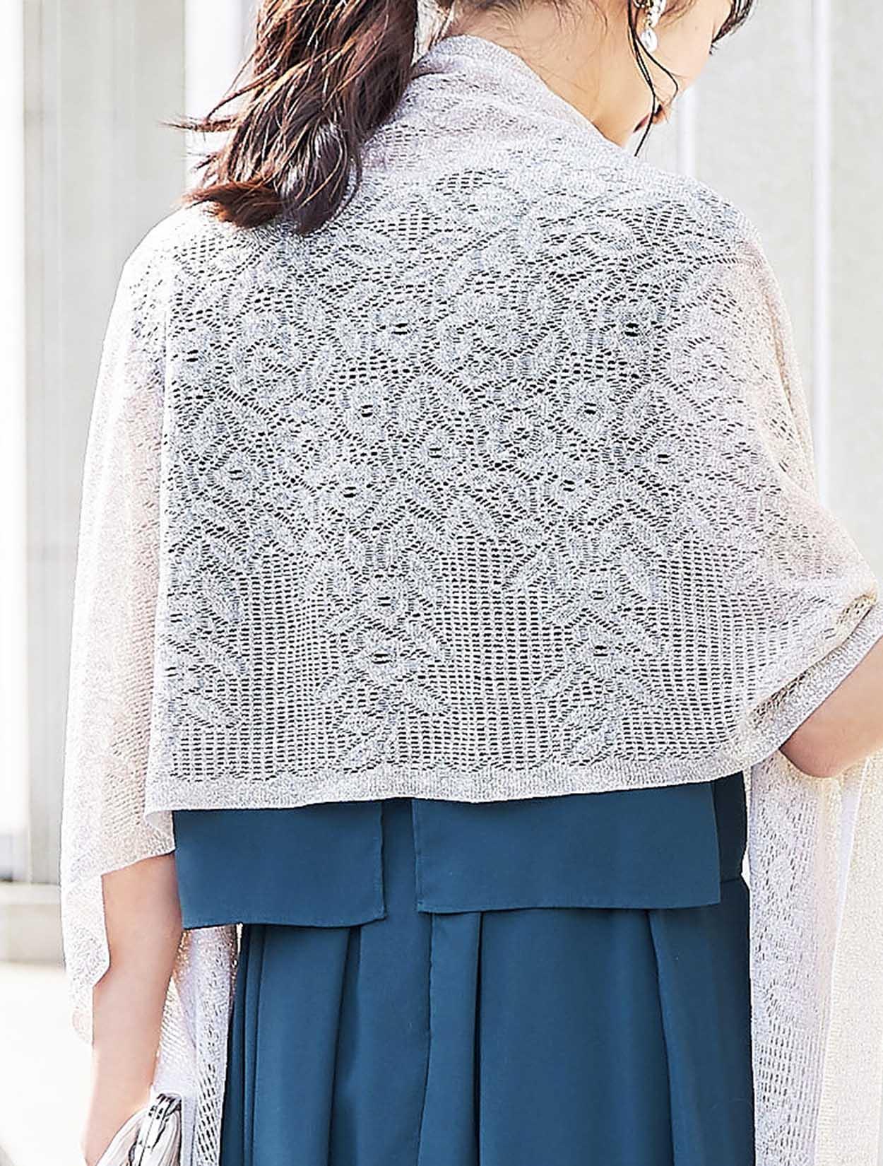くすみカラーでのパーティーシーンには、ラメ入りの華やかなショールを合わせて華やかに。