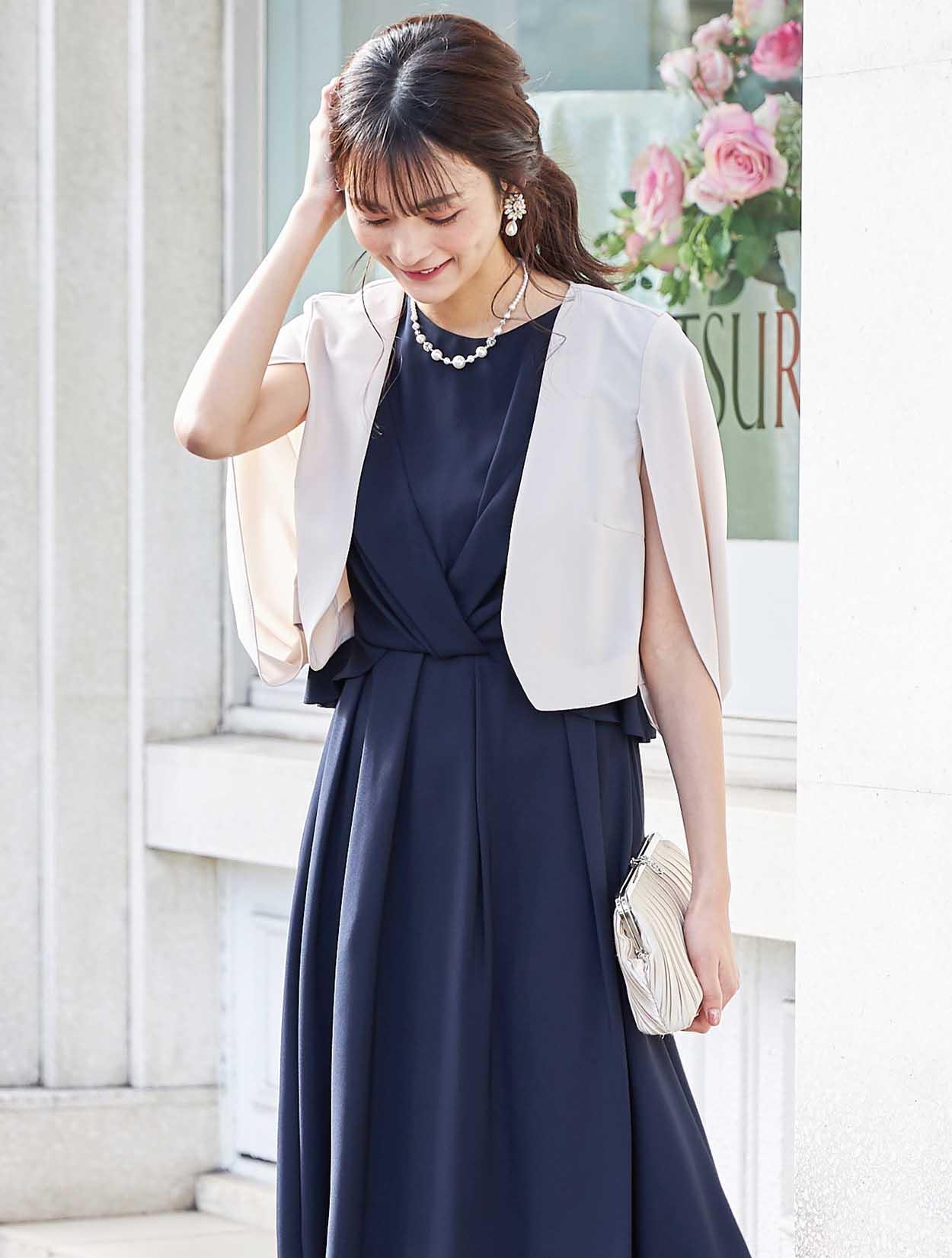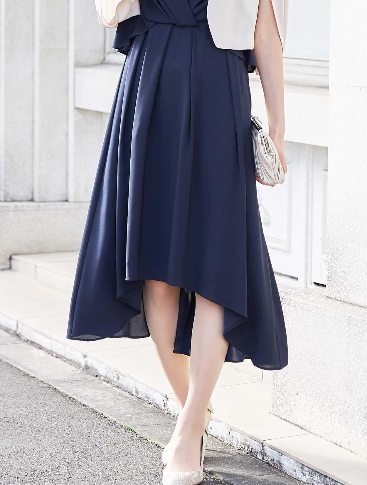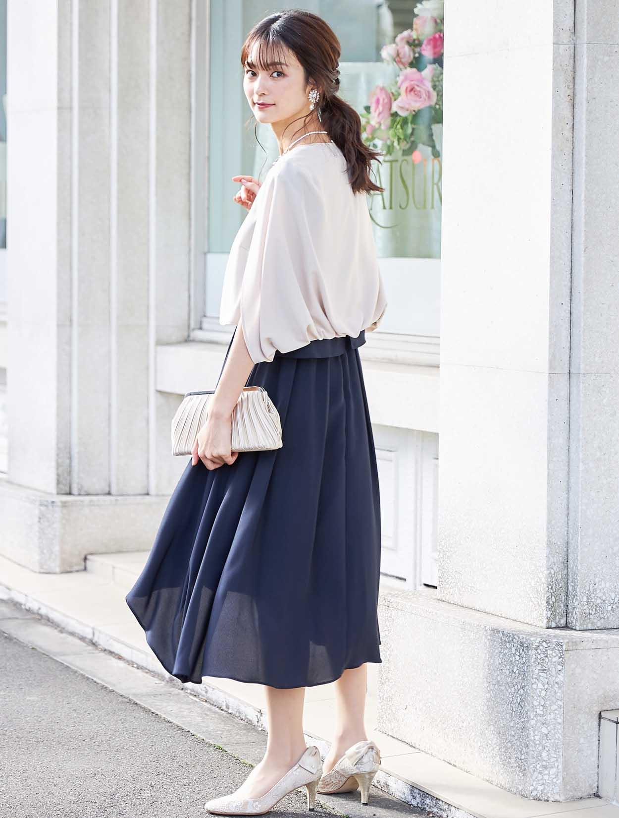 バックスタイルが軽やかな定番ネイビーのミディ丈ドレス
