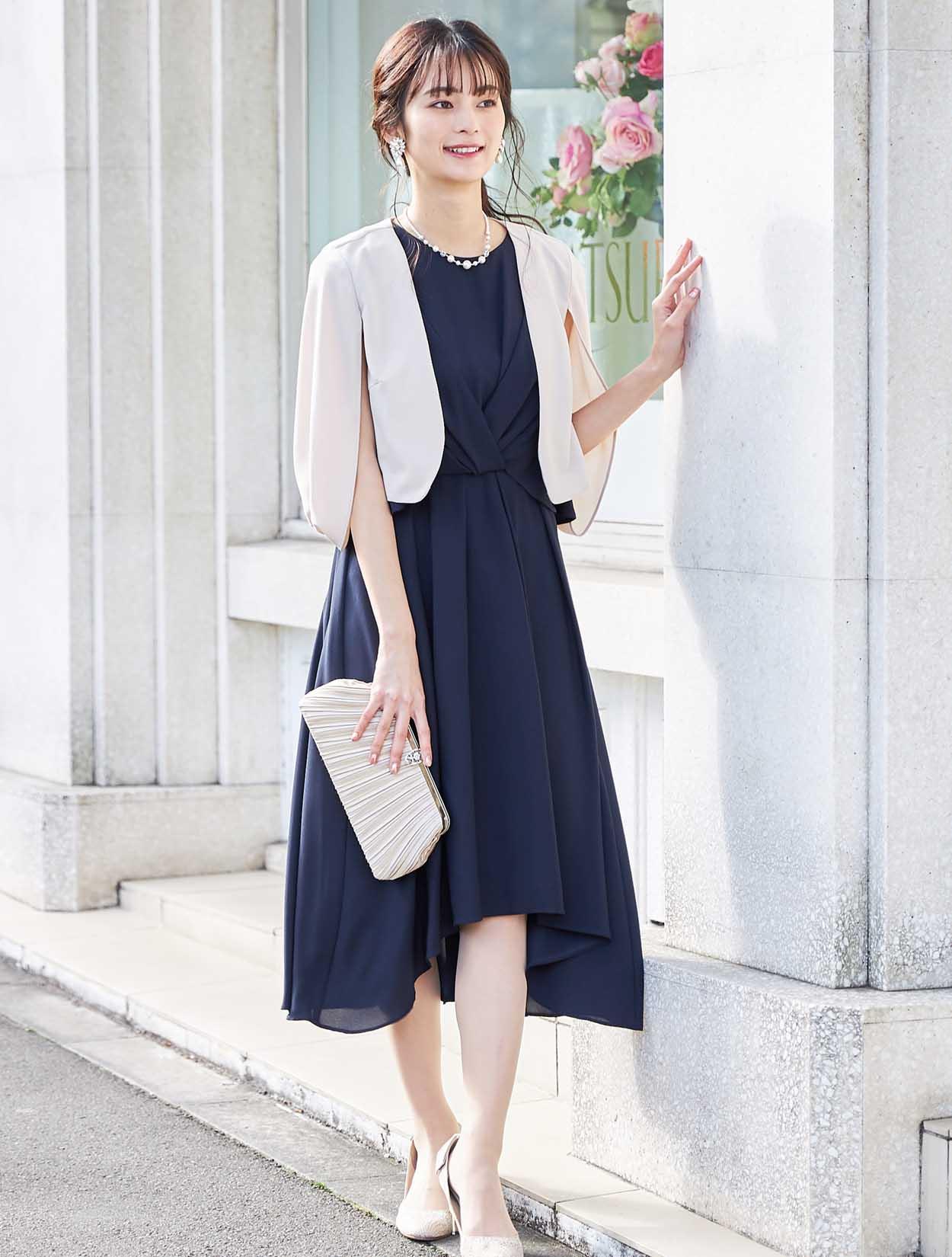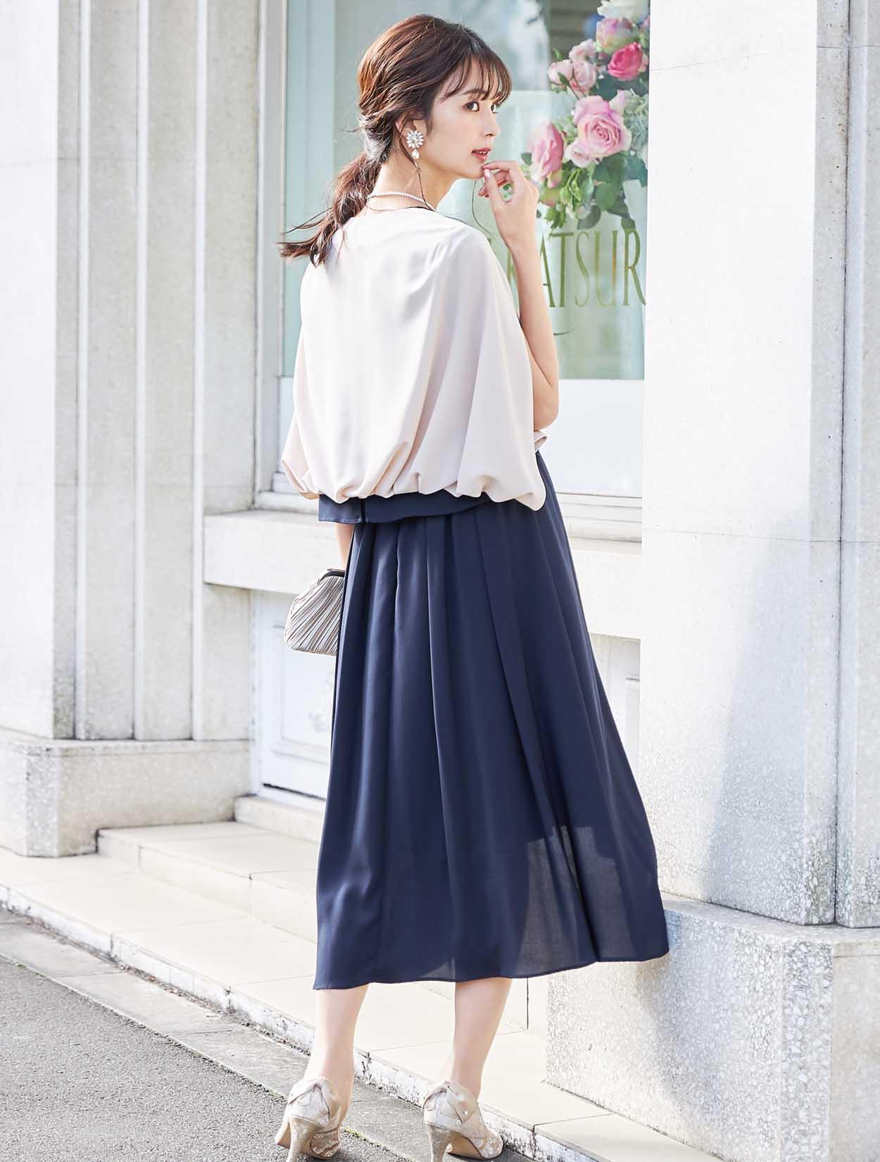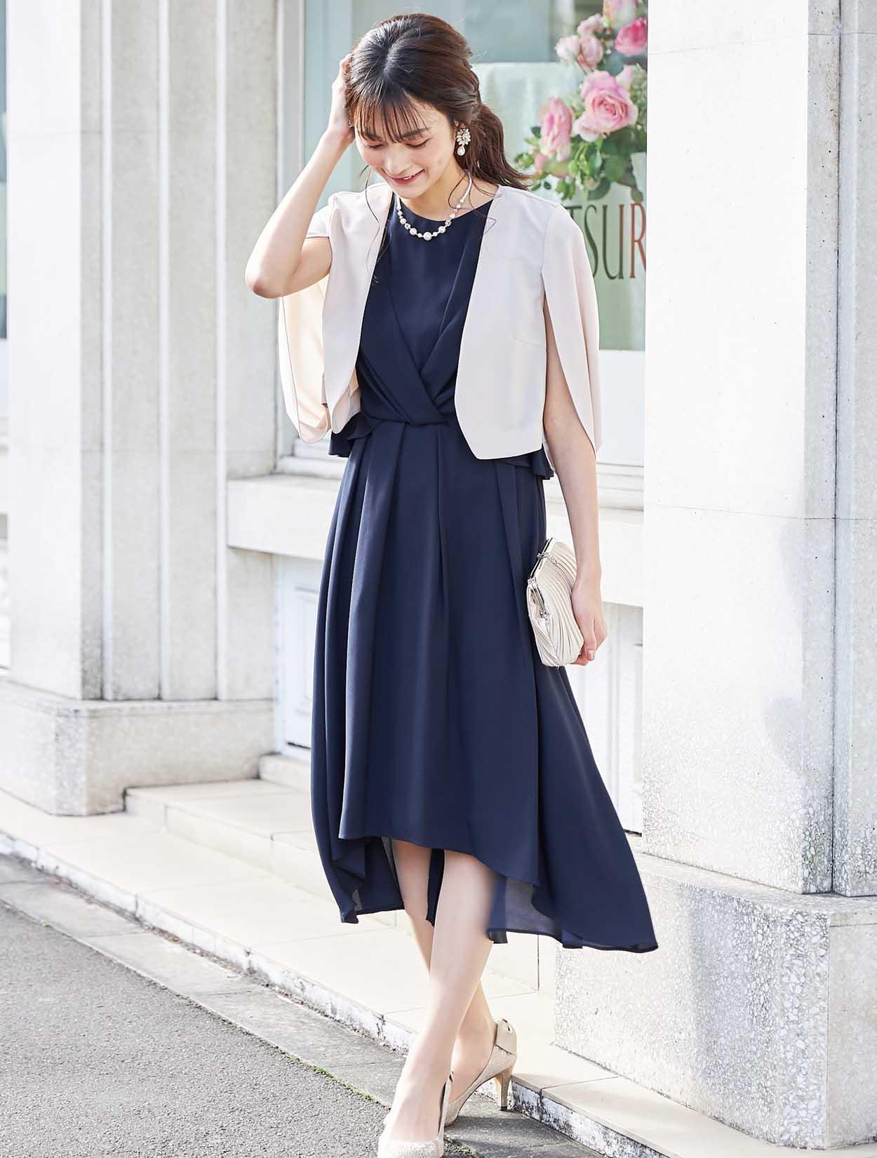 バックスタイルが軽やかな定番ネイビーのミディ丈ドレス
