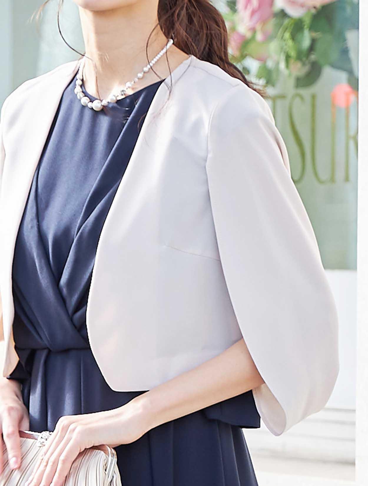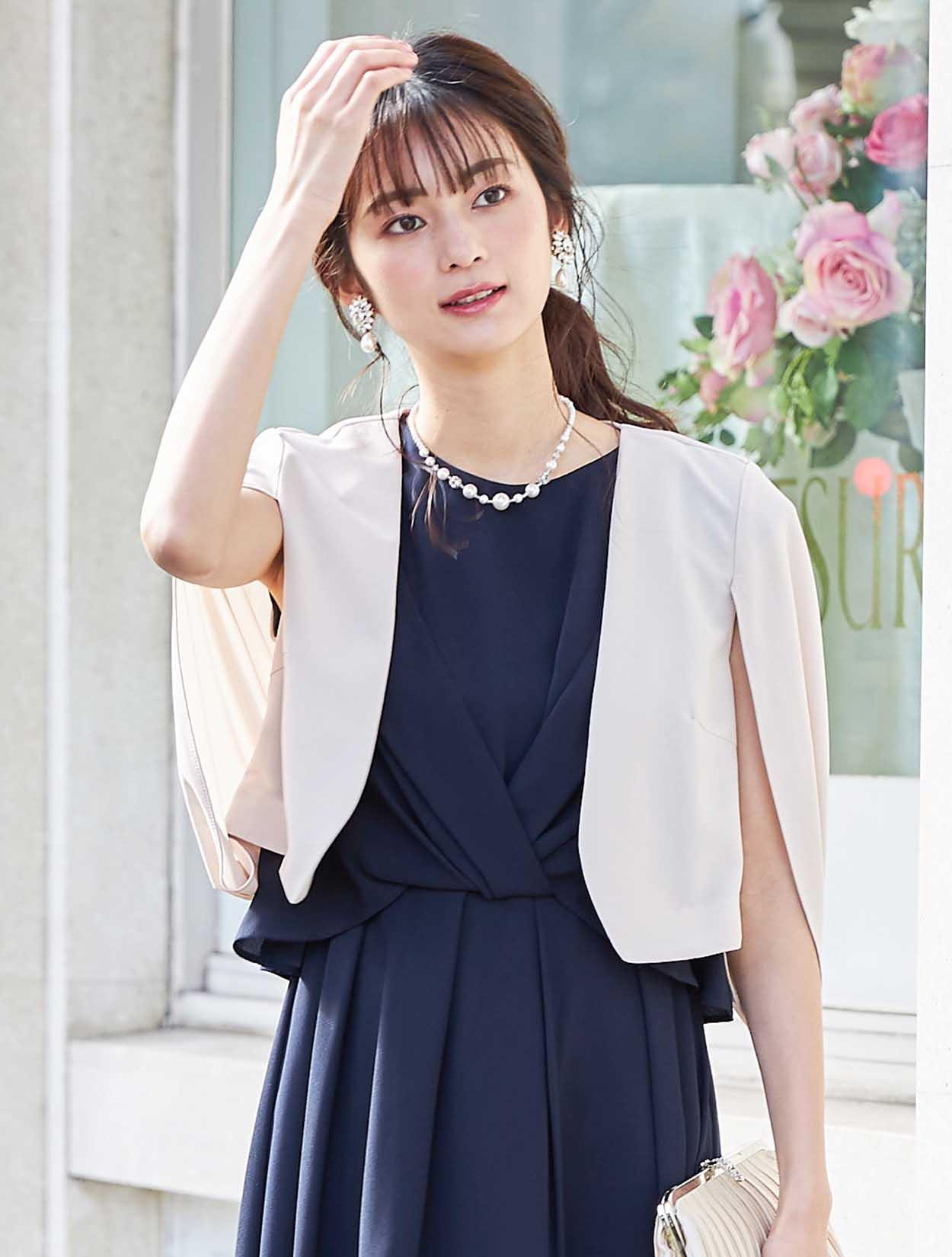 上品なミディ丈のドレスにベージュのジャケットを合わせた好感度抜群の上品なスタイル。