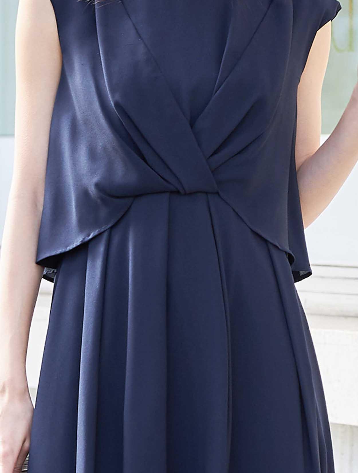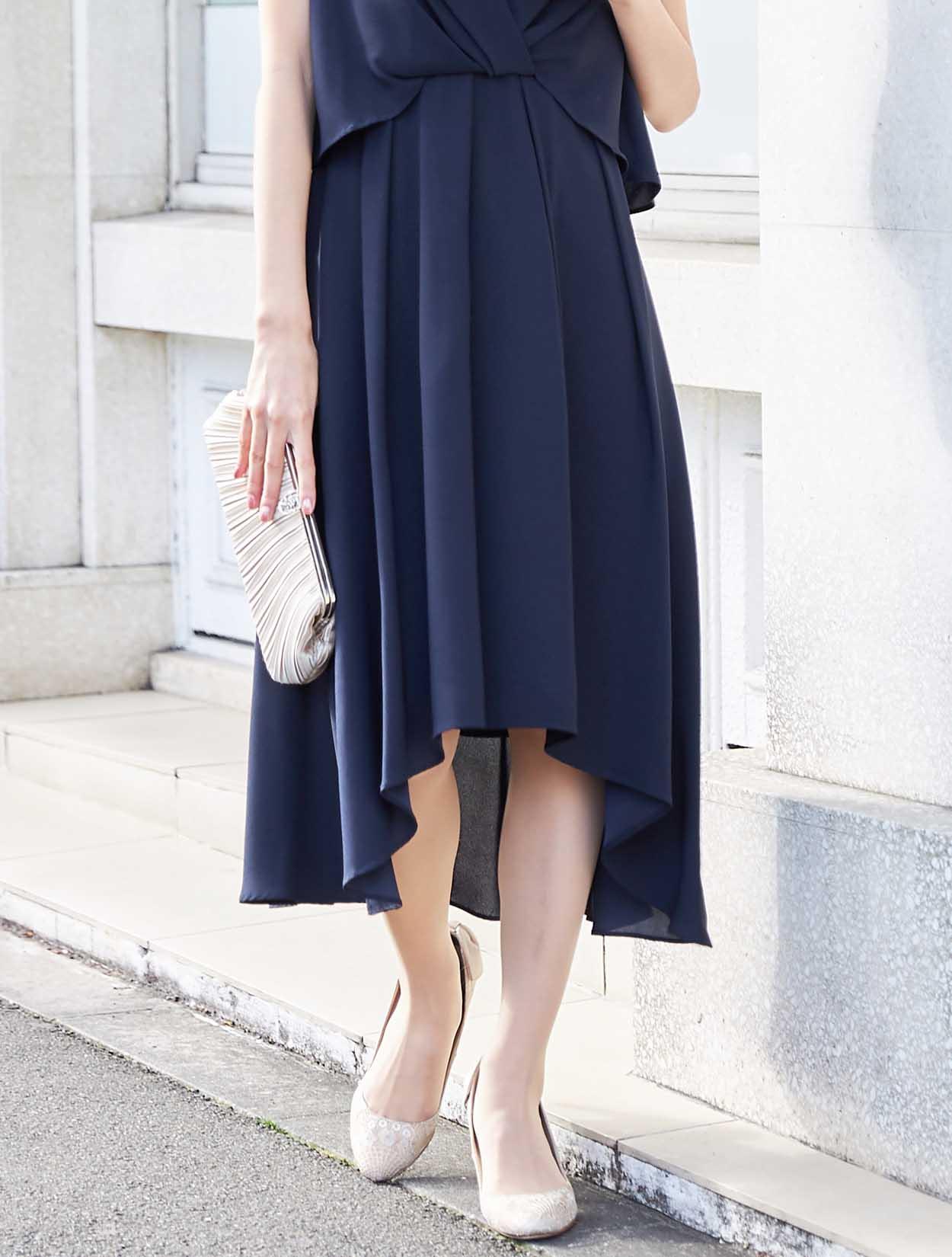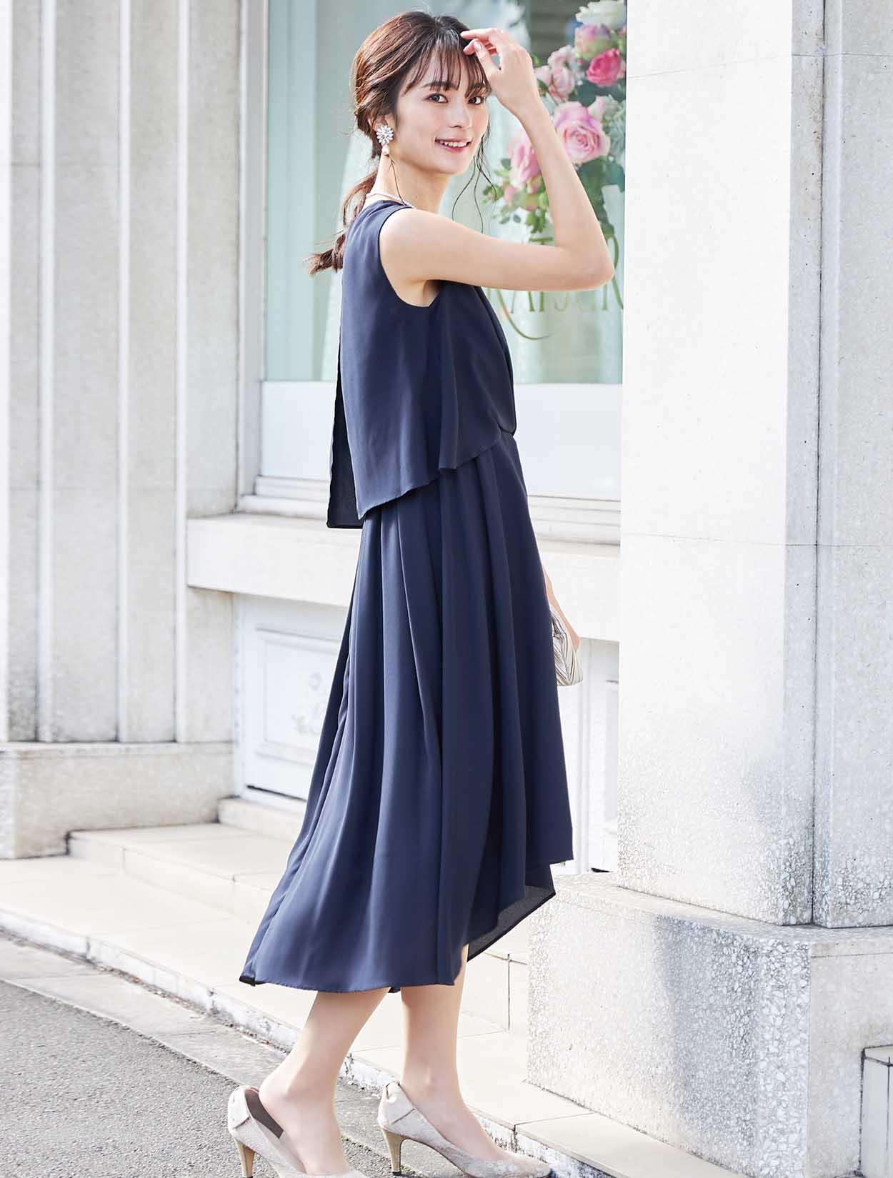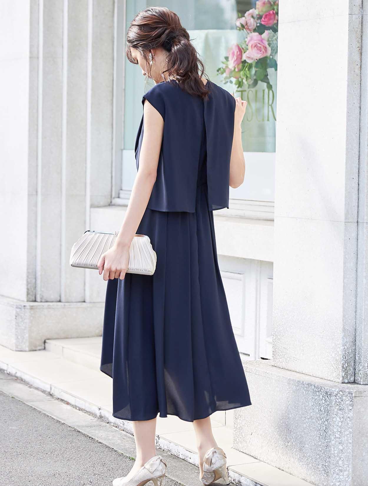 バックスタイルが軽やかな定番ネイビーのミディ丈ドレス