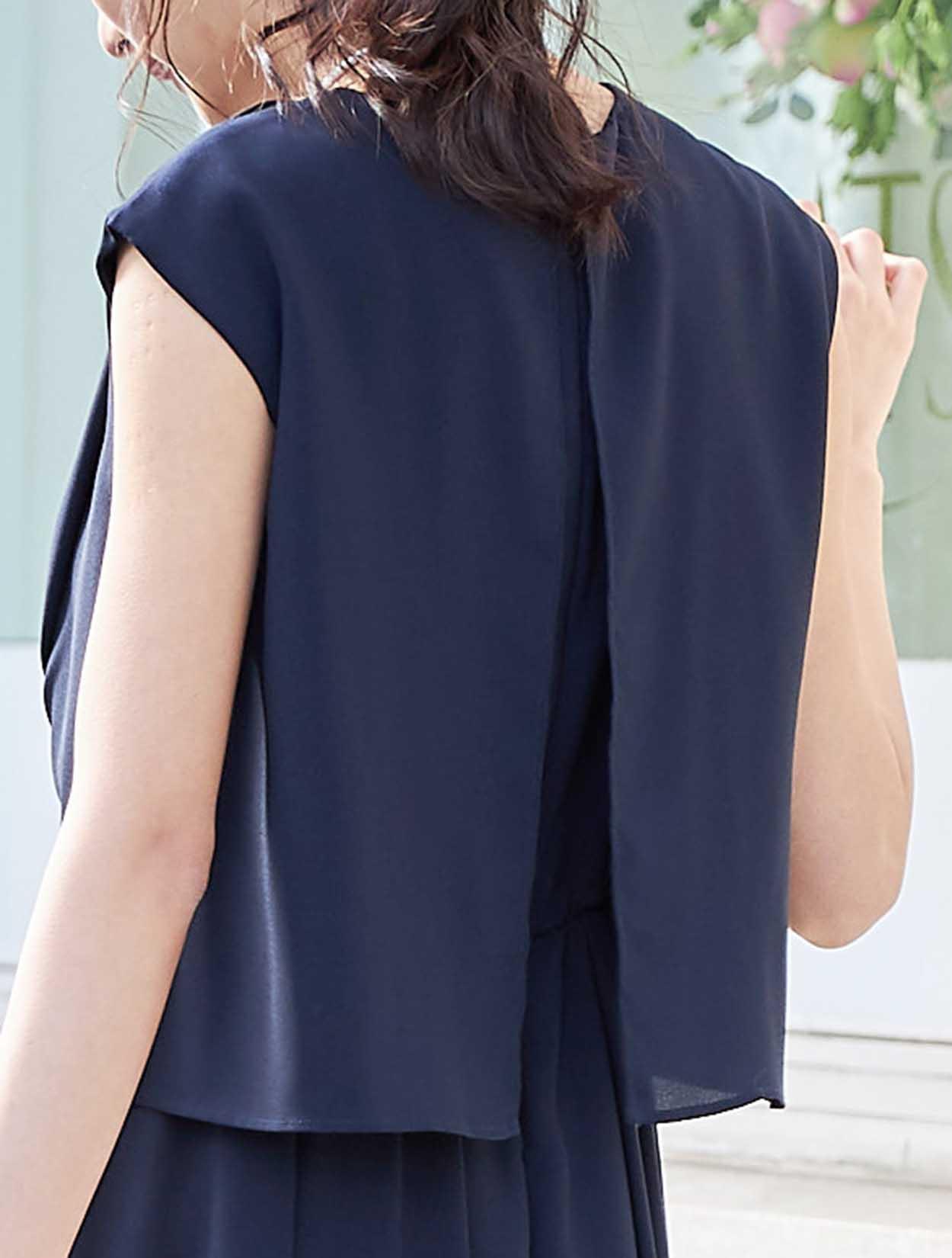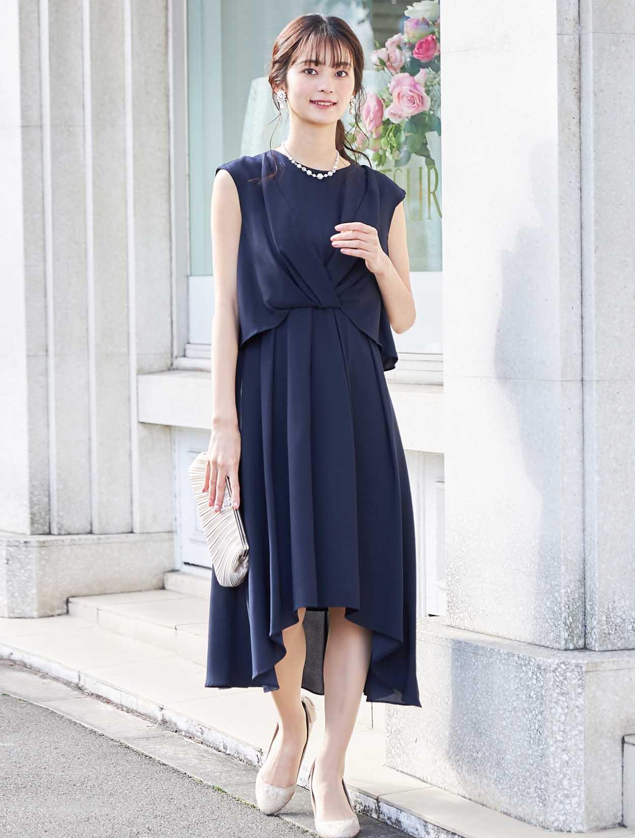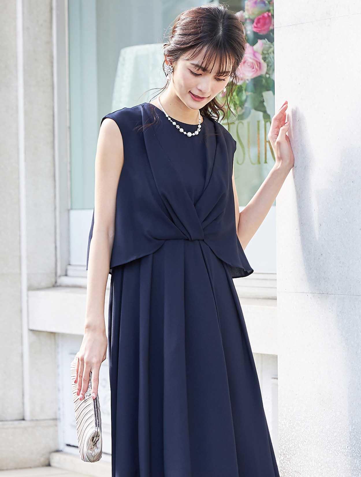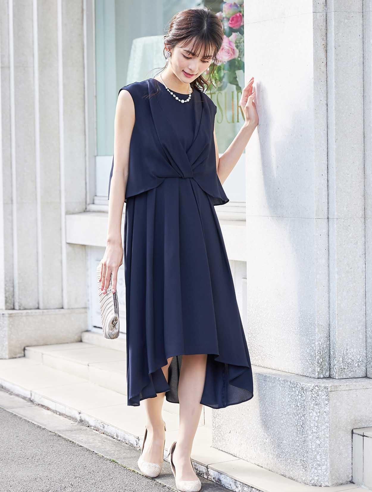 バックスタイルが軽やかな定番ネイビーのミディ丈ドレス
