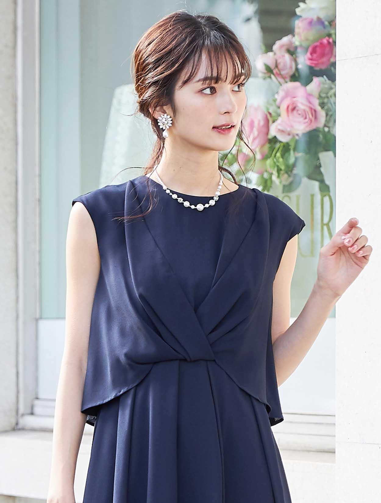 落ち着いたネイビーのドレスには、シャープなシルバーの小物合わせで華やかさをプラス。