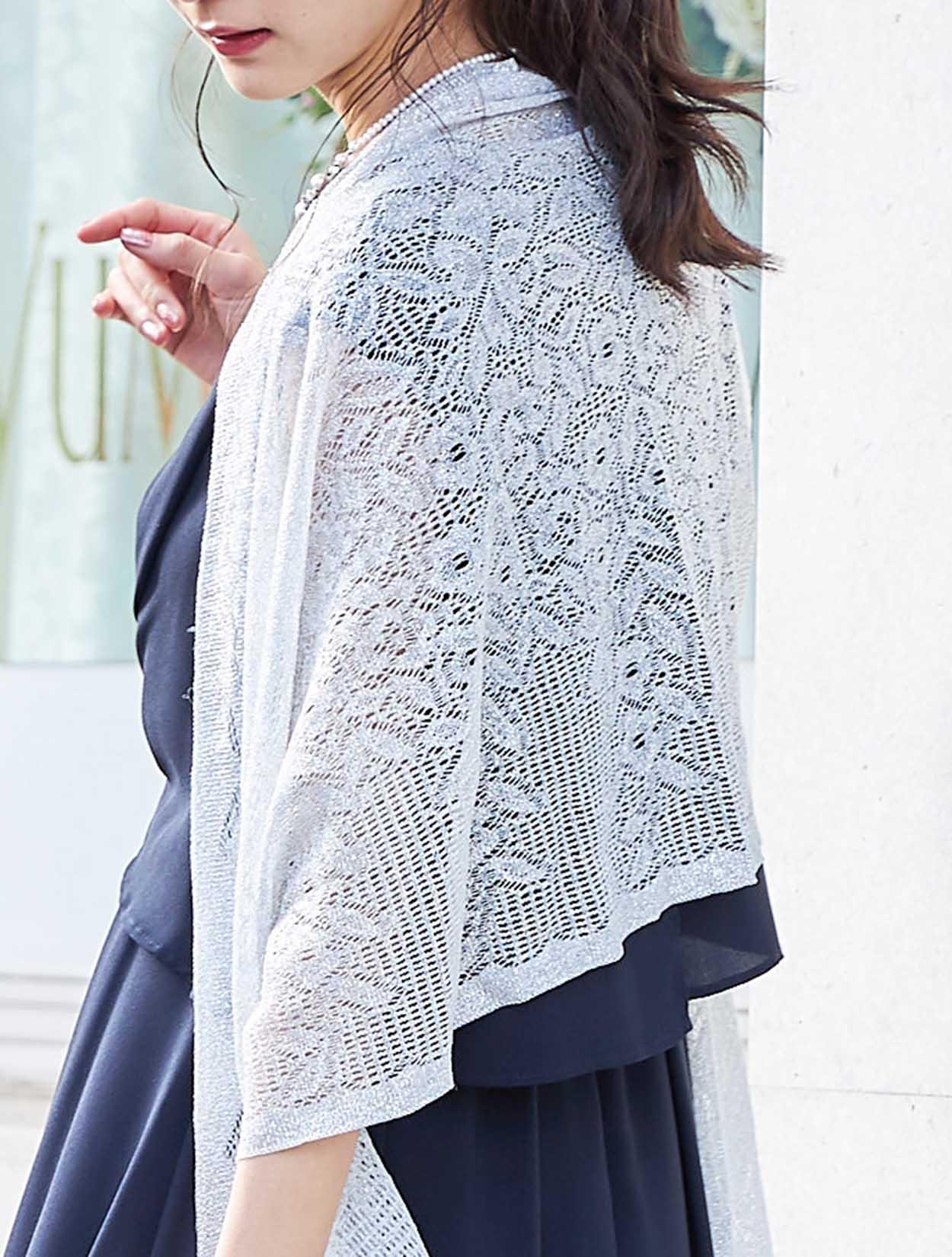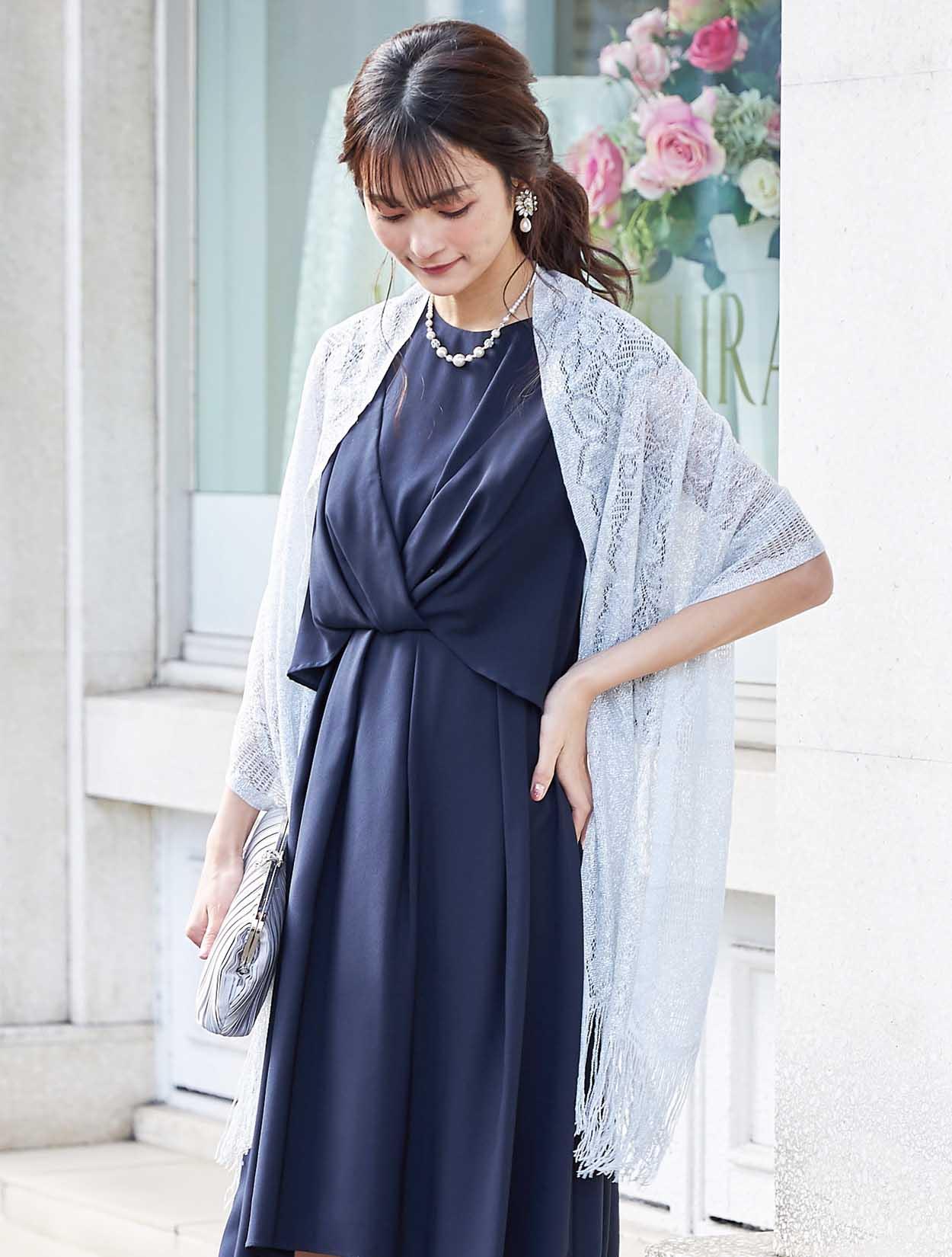 シンプルなネイビードレスが引き立つシルバーのショールを合わせたコーディネート。