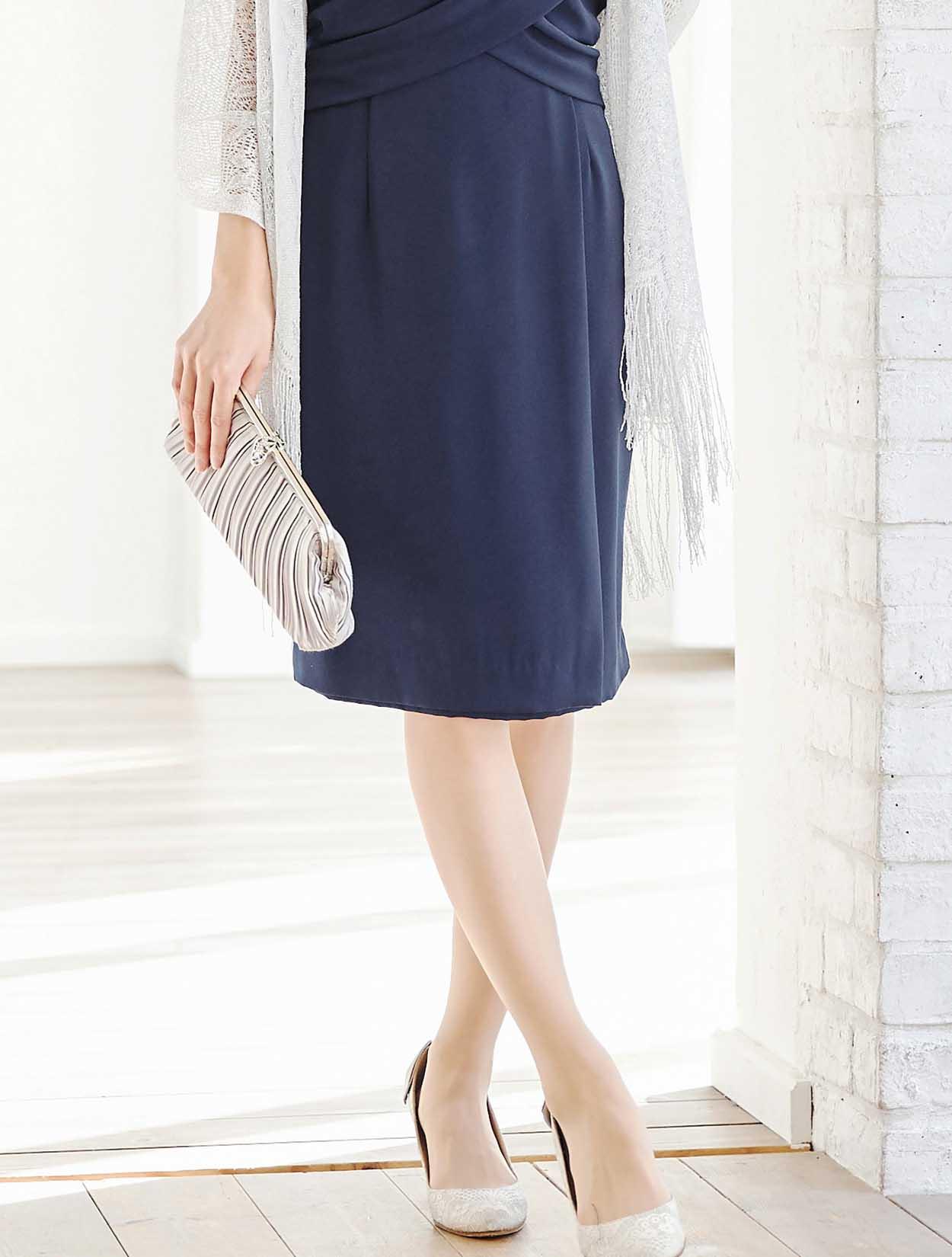 タイトめのスカートとウエストクロスのデザインがスタイルアップ効果あり。ベアトップで切り替えたブラックのレースで、甘さ控えめな大人の雰囲気漂います。
