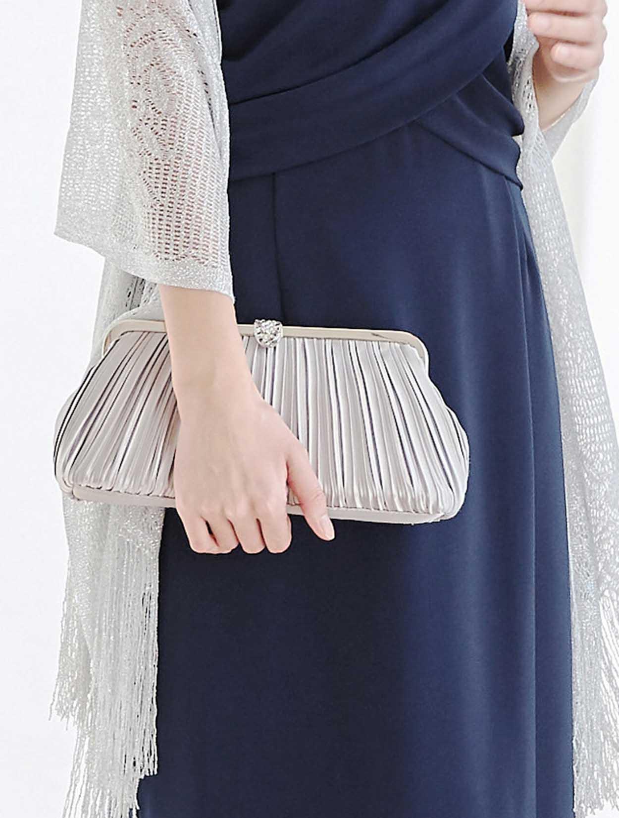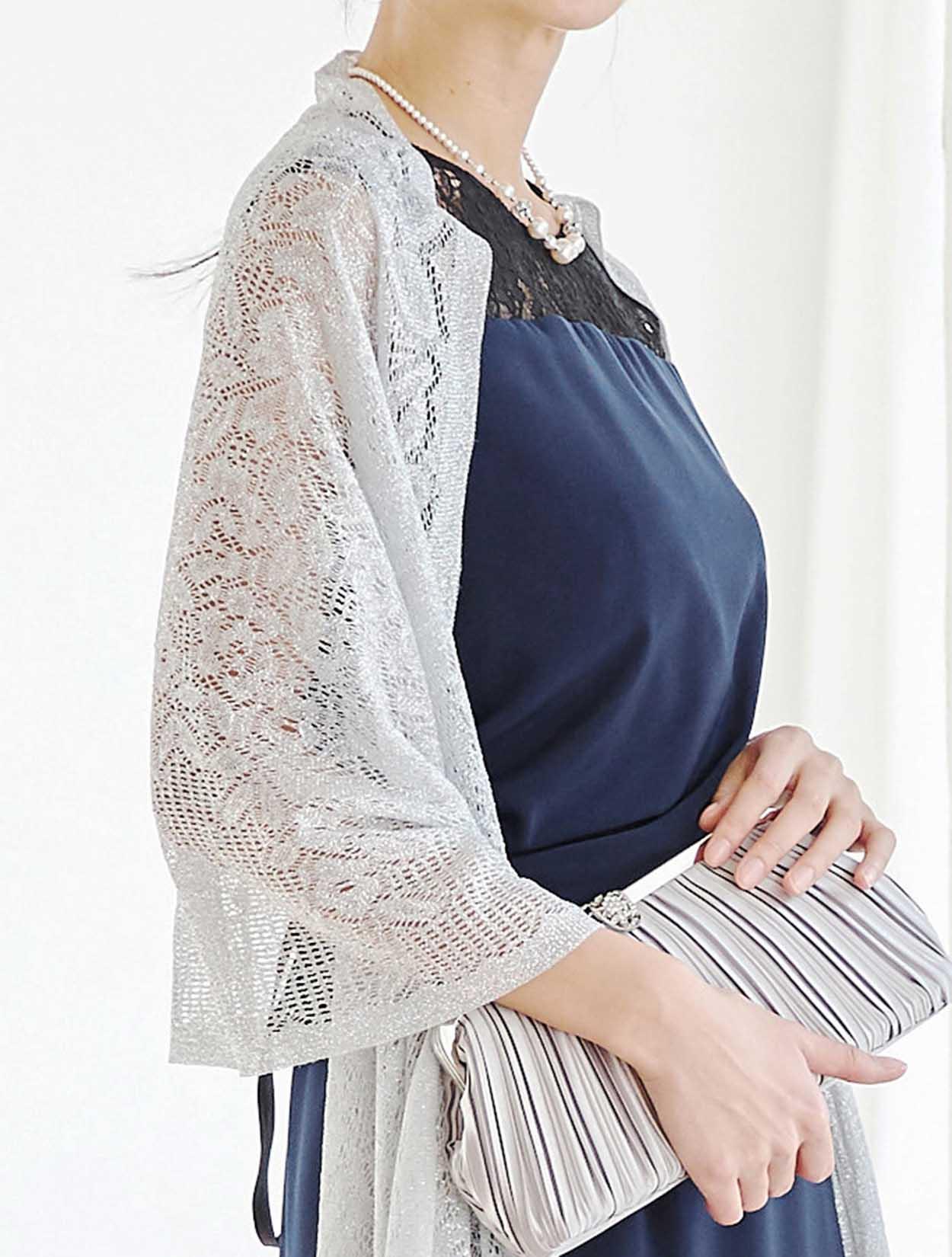 タイトドレスを更に大人っぽい表情にするラメショールを合わせたコーディネート。