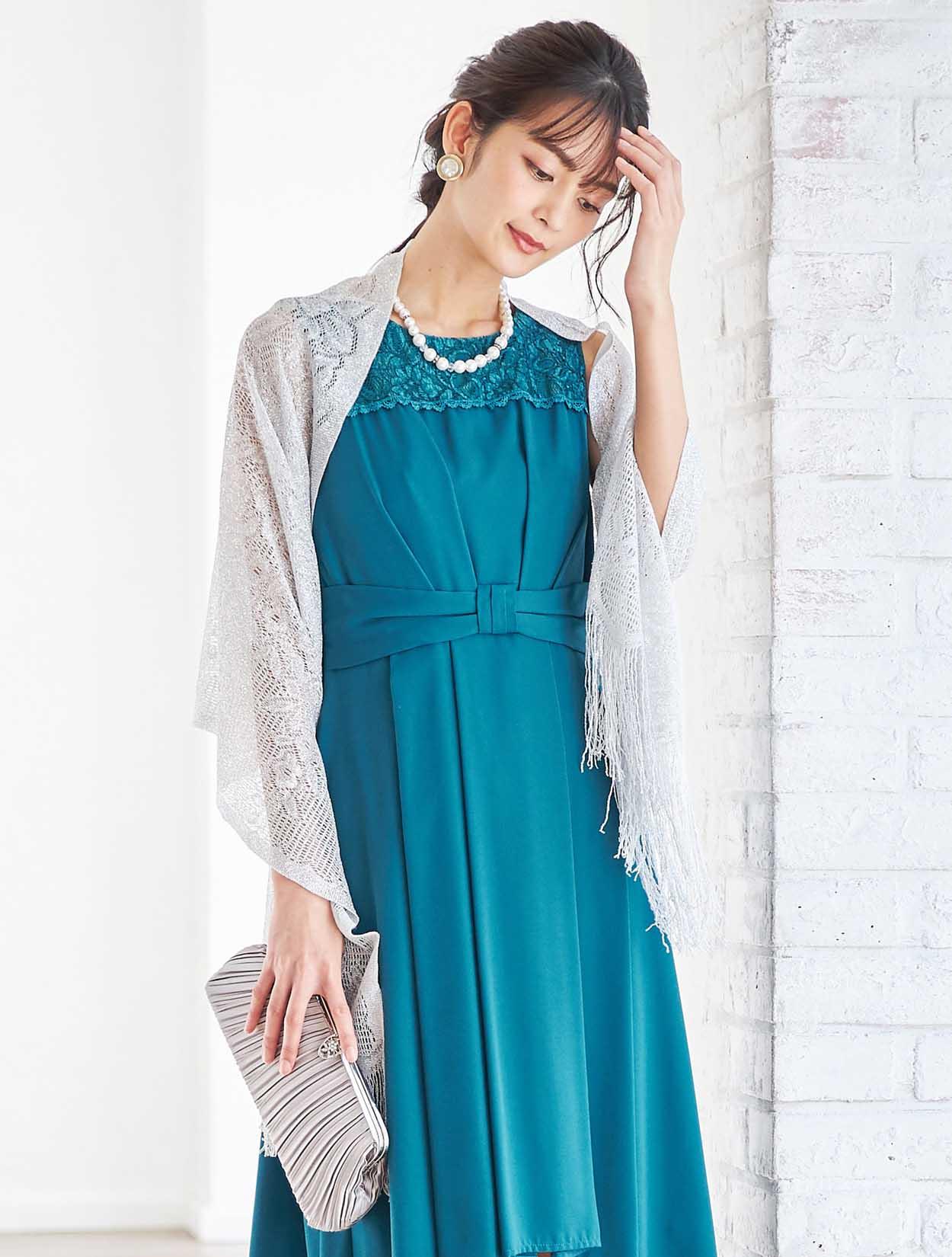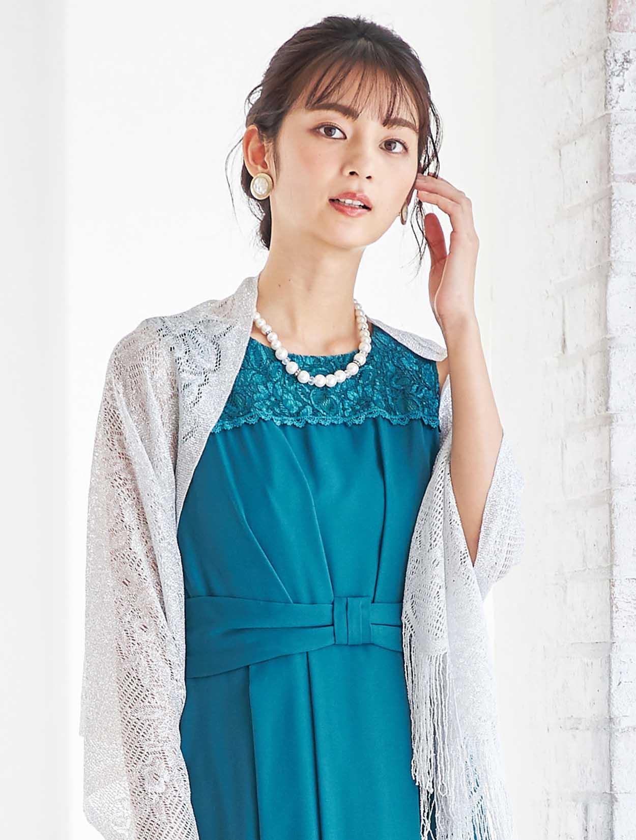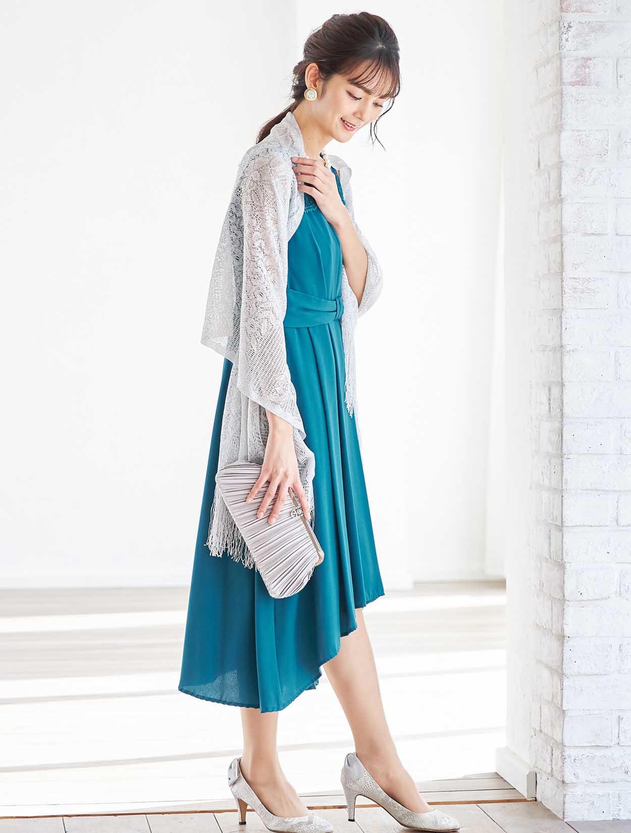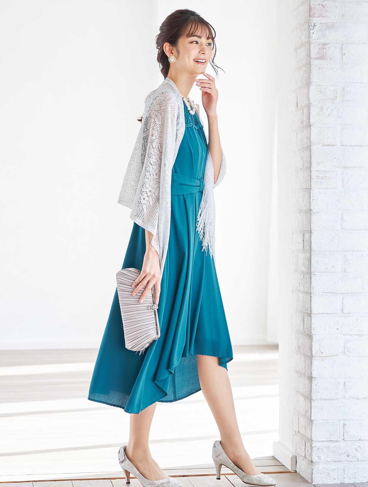 濃いめのグリーンのドレスにシルバーをピリっと効かせたコーディネート。