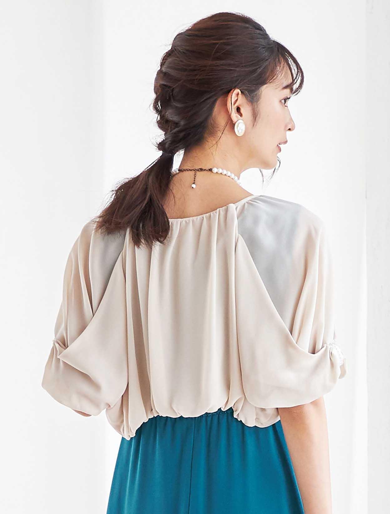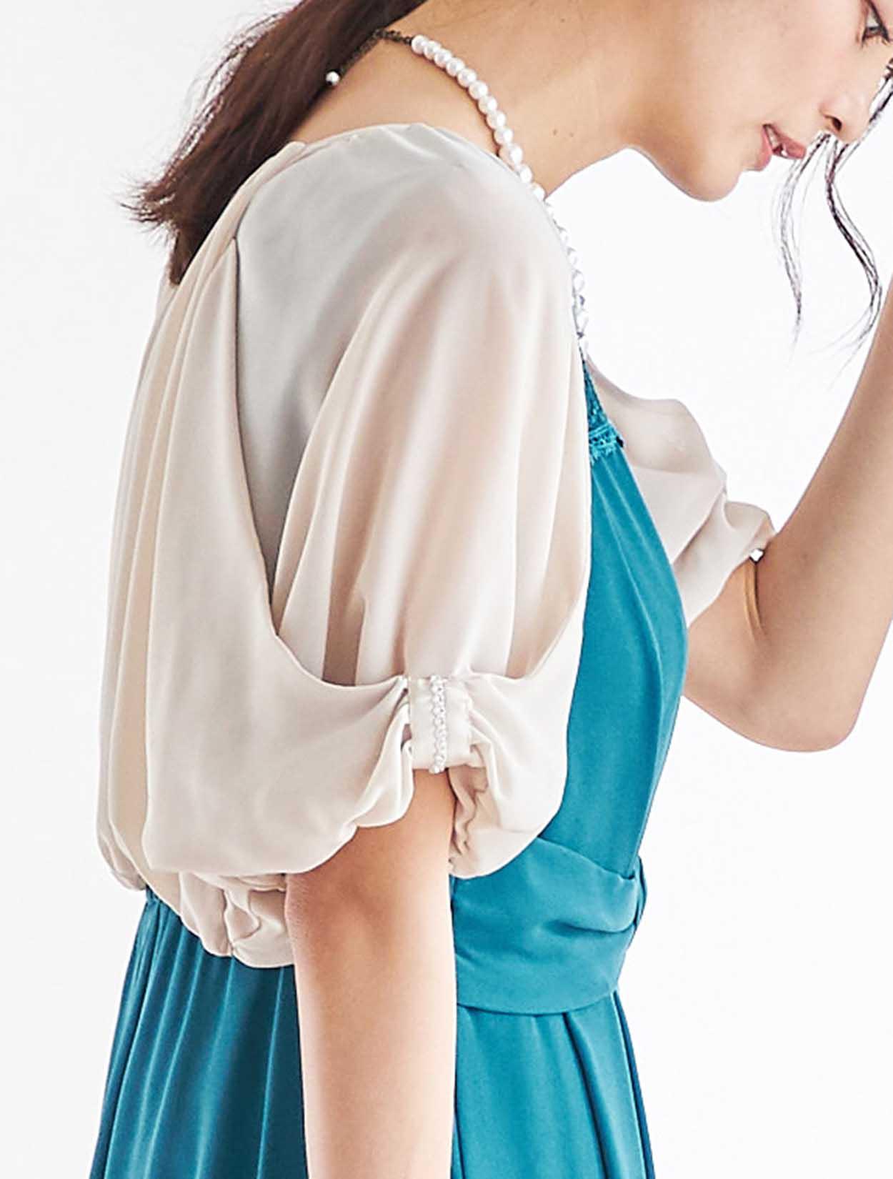 ゆるめのシルエットのボレロは、袖に施されたリボンがさり気ない可愛さ◎ボレロの袖丈が長めなのも嬉しいポイント。