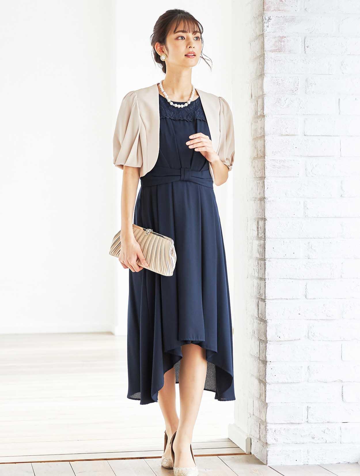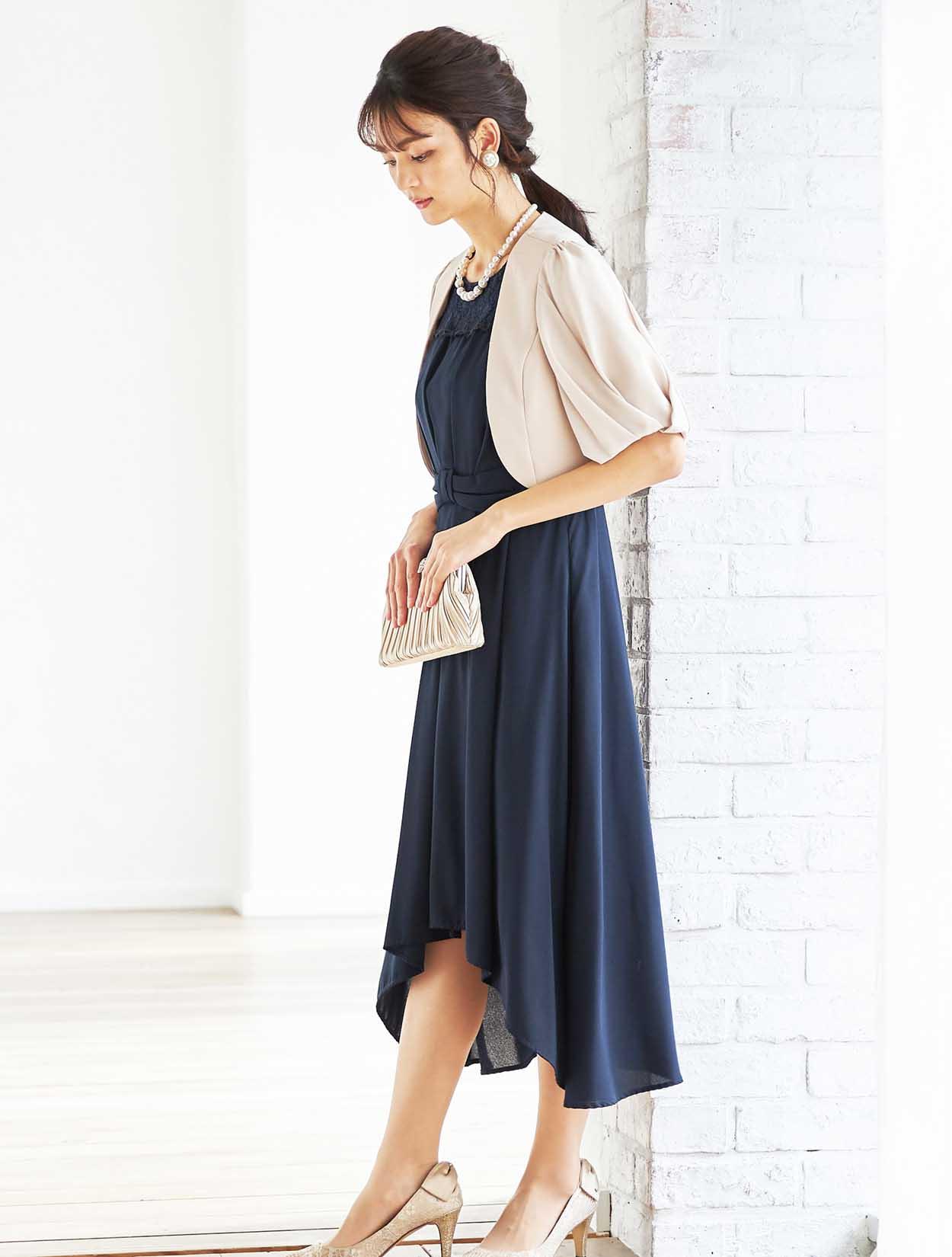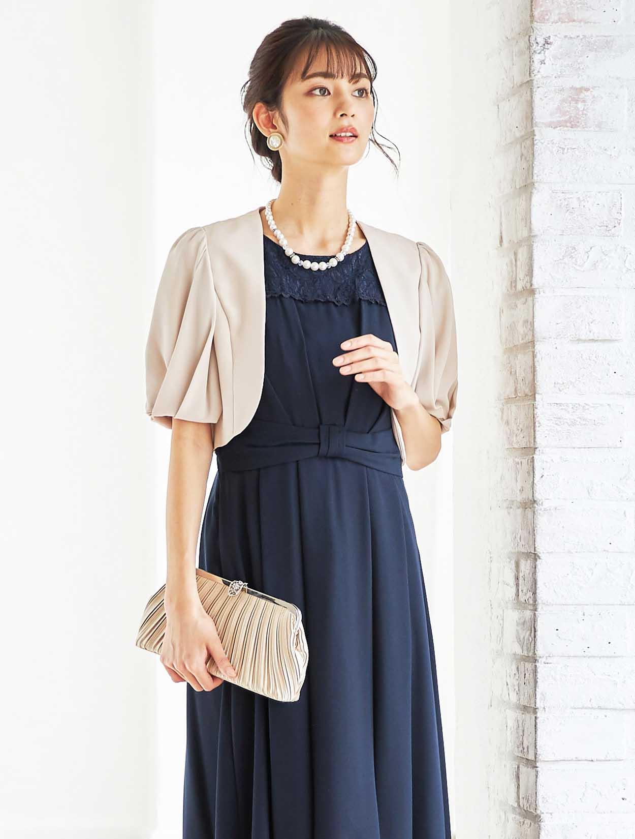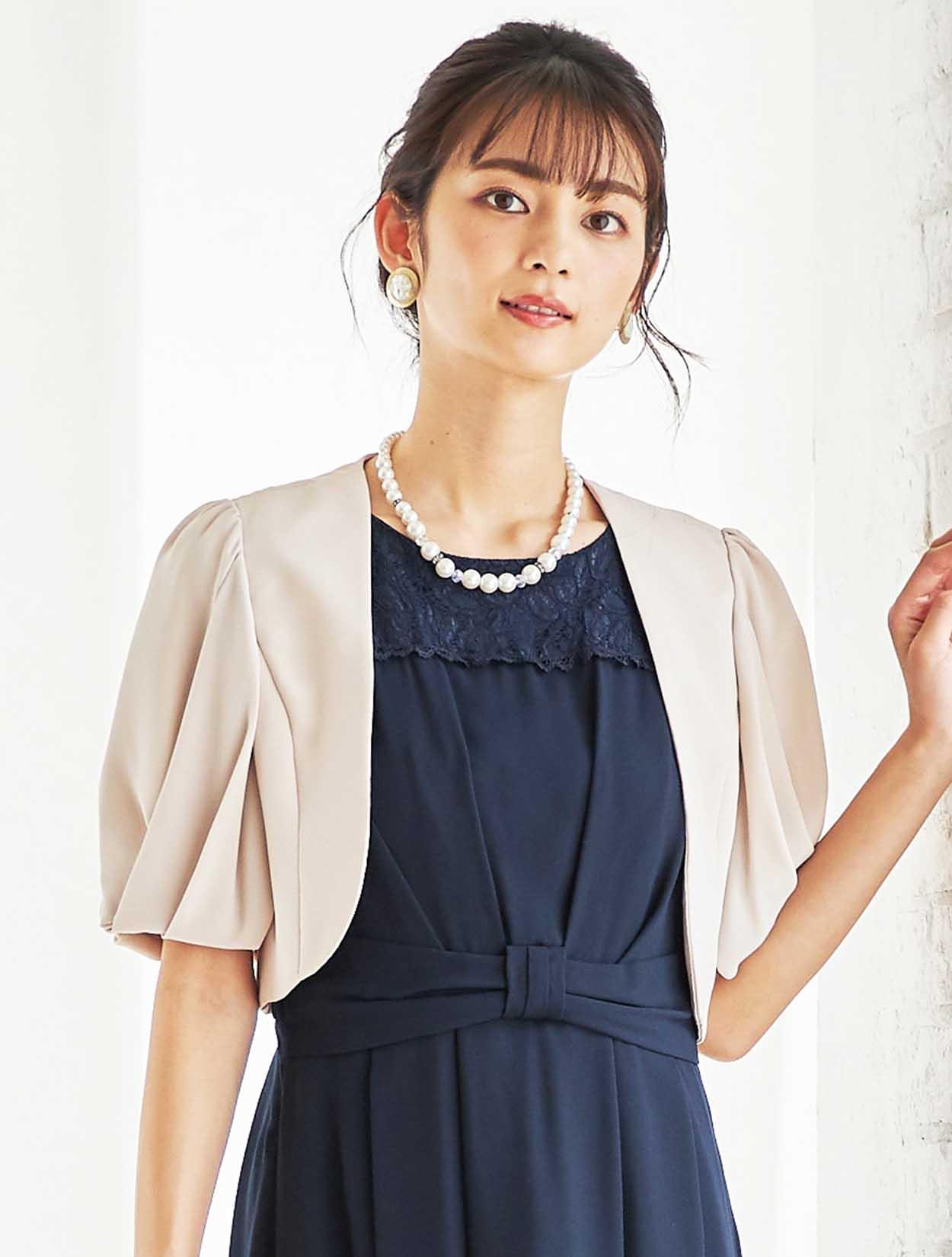 ベージュのジャケットボレロを合わせた、きちんと系フォーマルコーディネート。