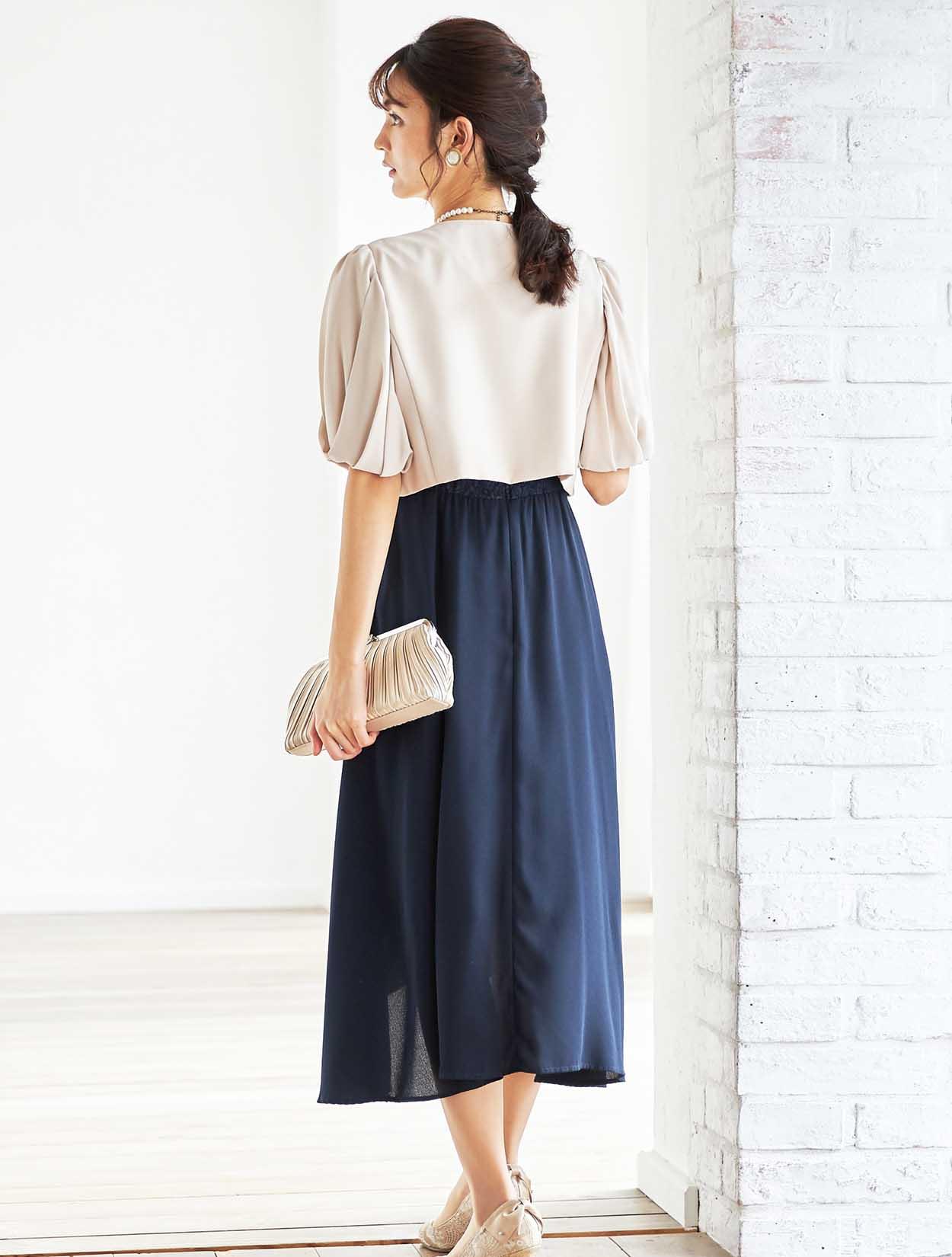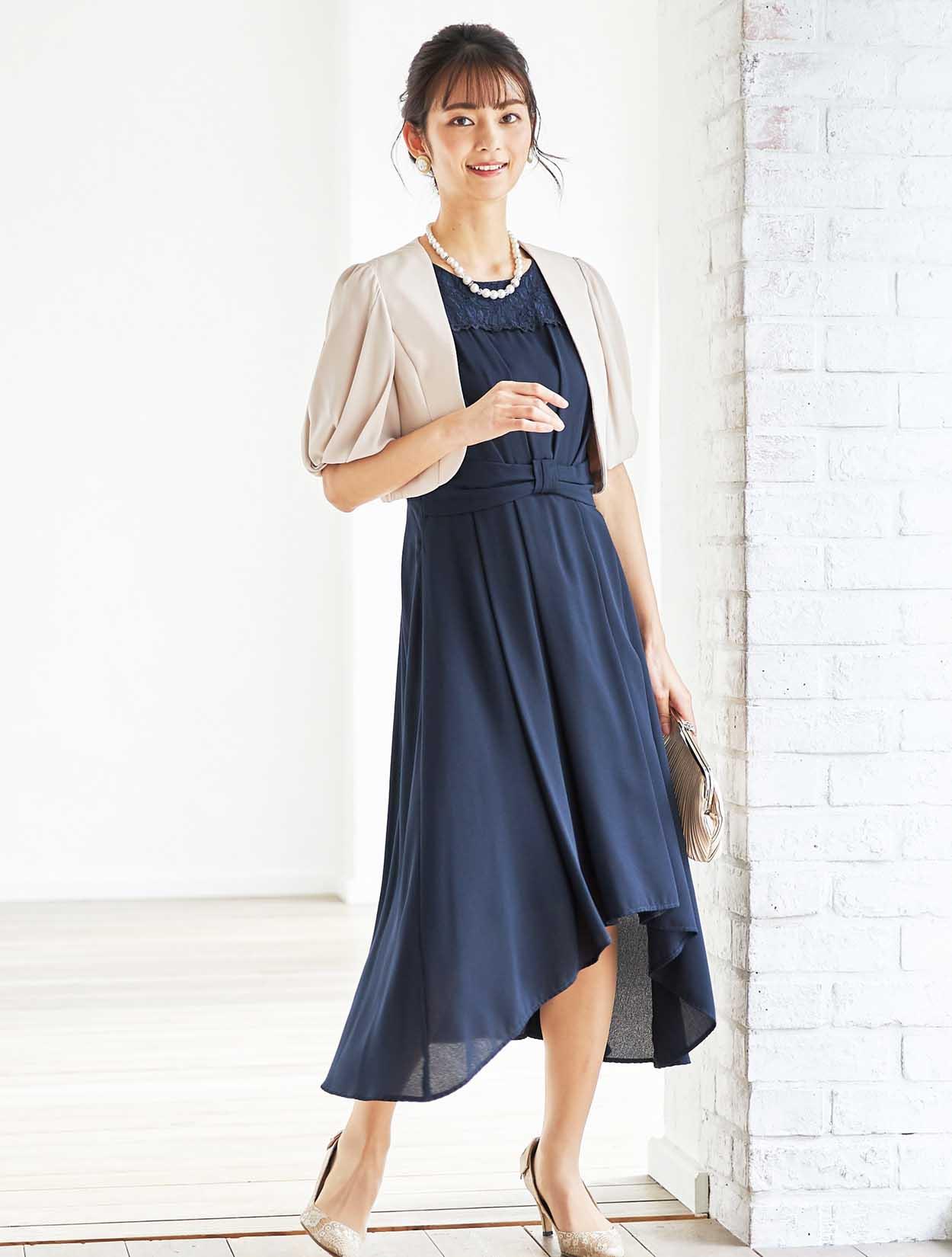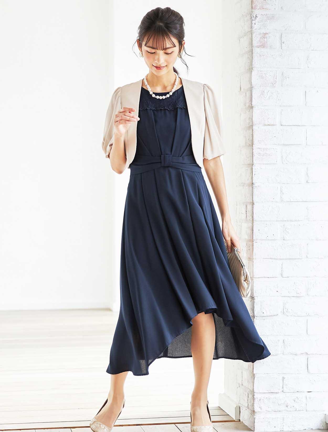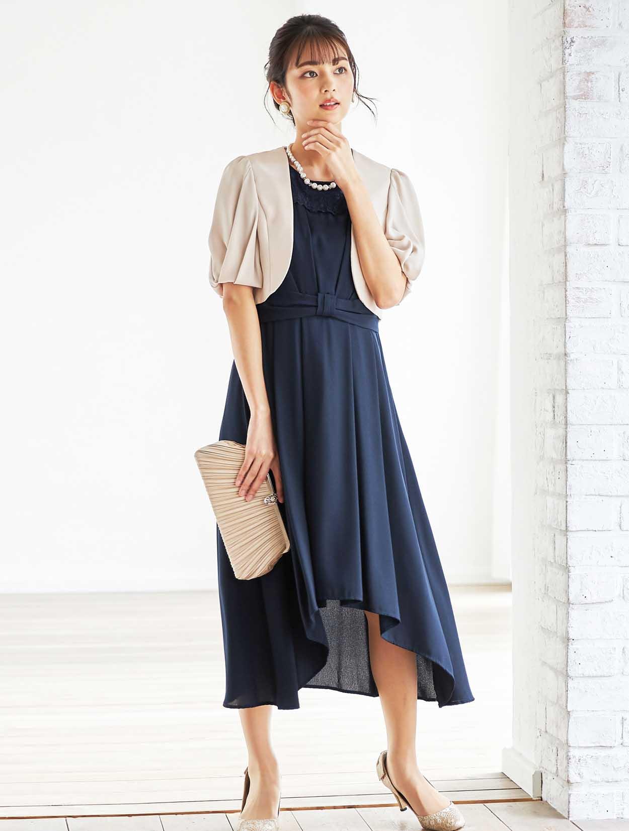 ベージュのジャケットボレロを合わせた、きちんと系フォーマルコーディネート。
