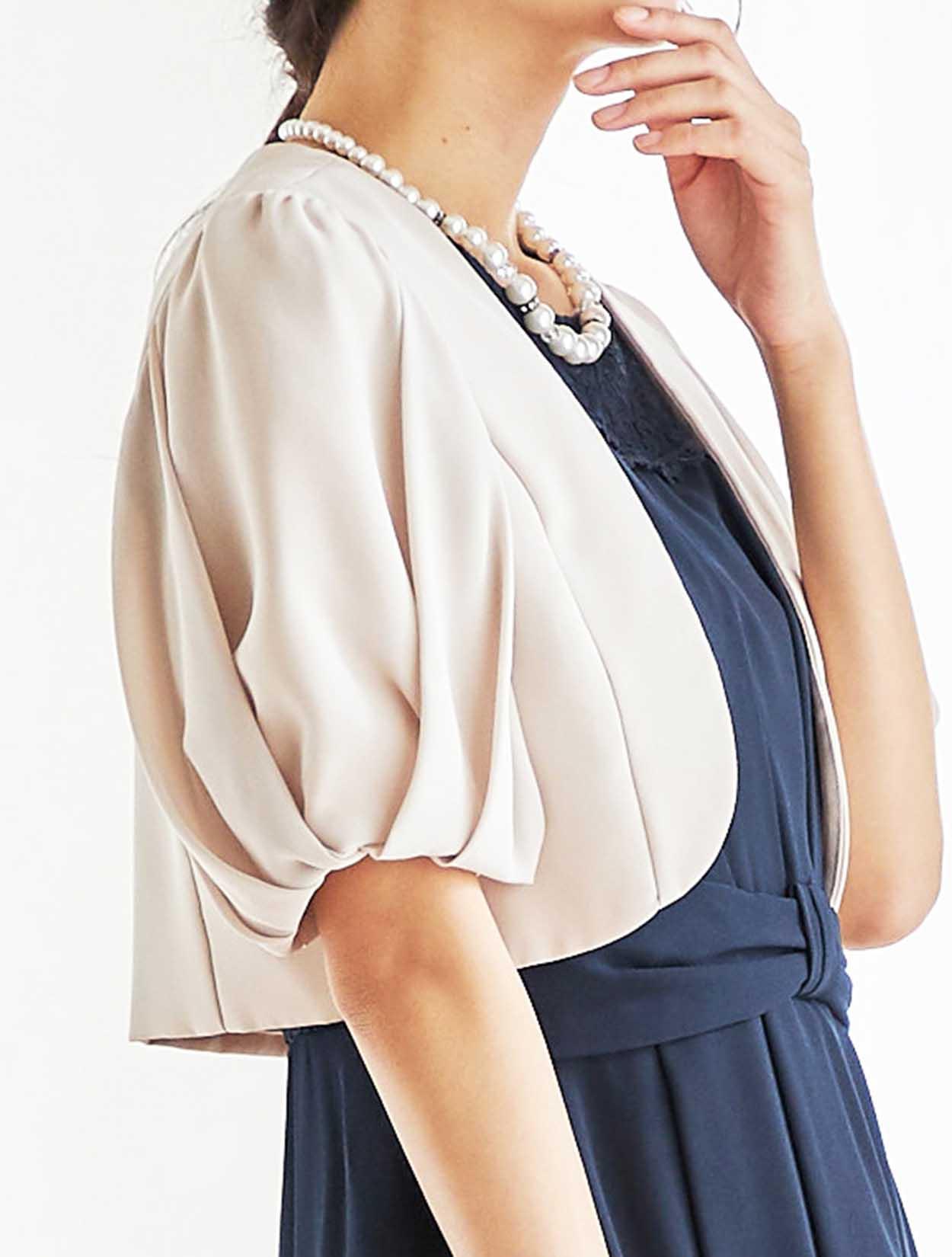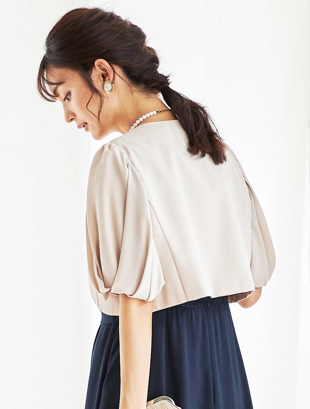 丸みのある袖のシルエットが特徴的なジャケットボレロで、きちんと感の中にも柔らかさをプラス。